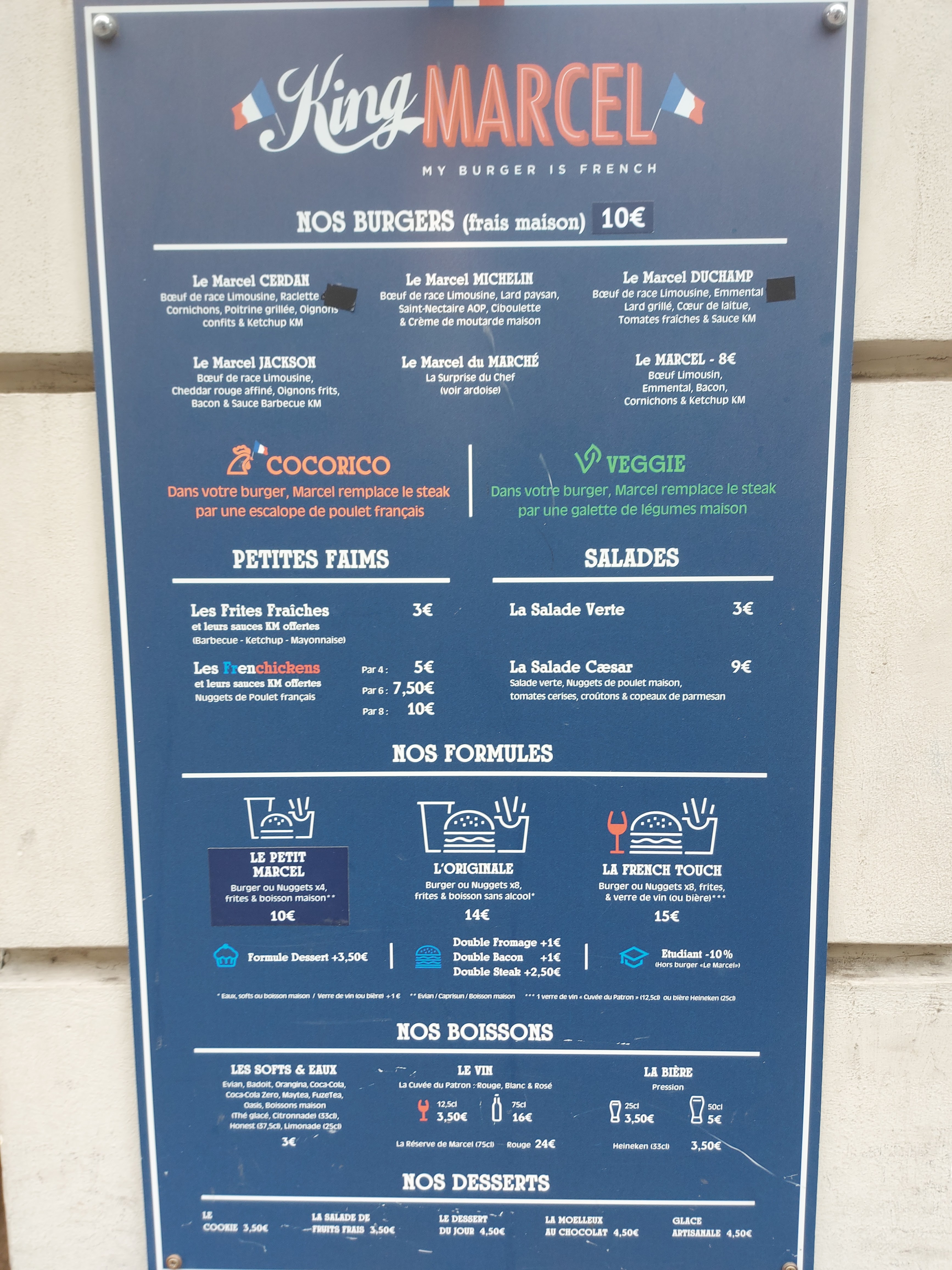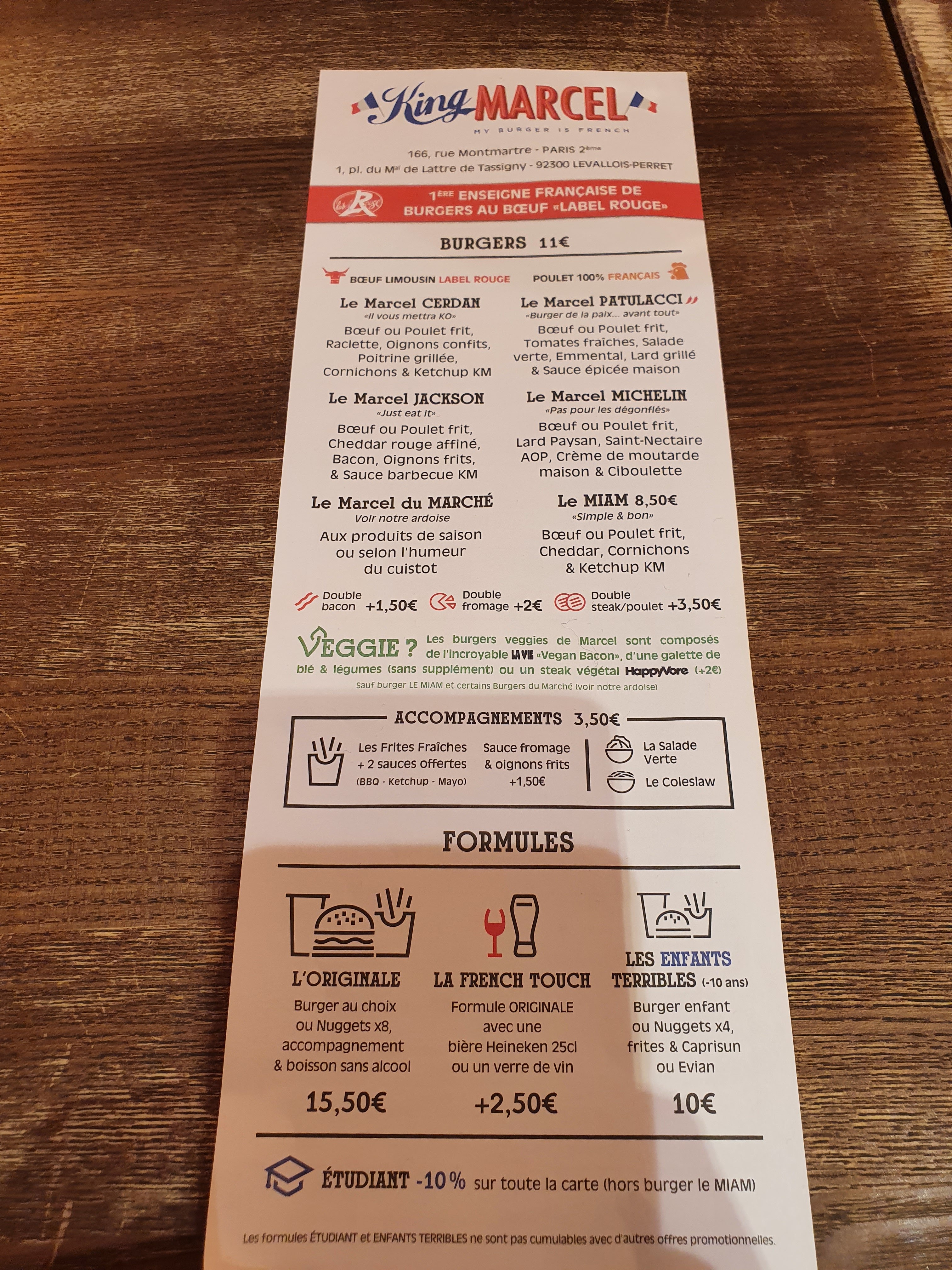 Cher Fookoo, Un grand merci pour votre avis 5*. Nous sommes ravis que vous ayez aimé nos burgers 100% français et notre offre commerciale pour les étudiants. À bientôt dans notre restaurant King Marcel Montmartre! Marcel