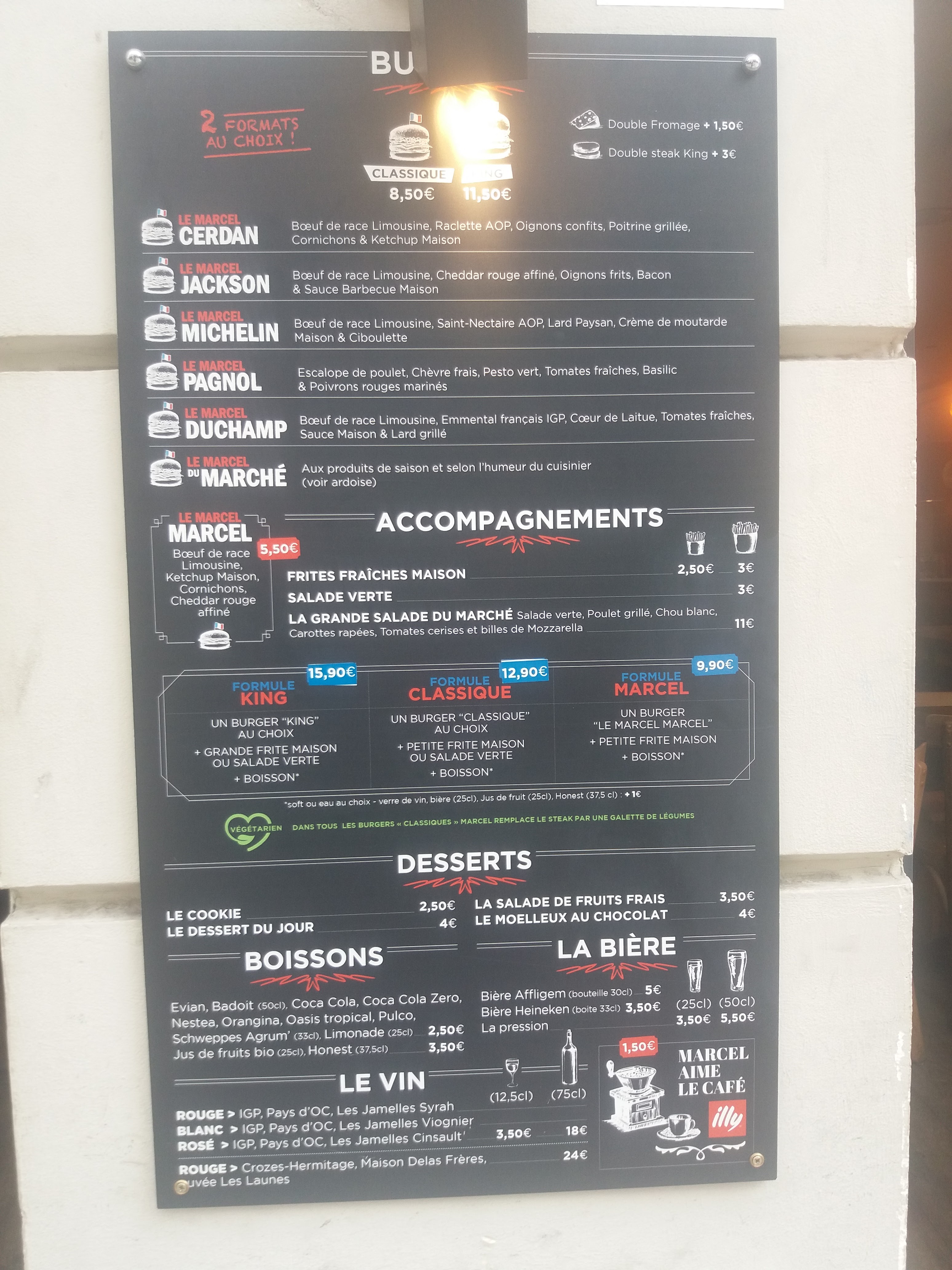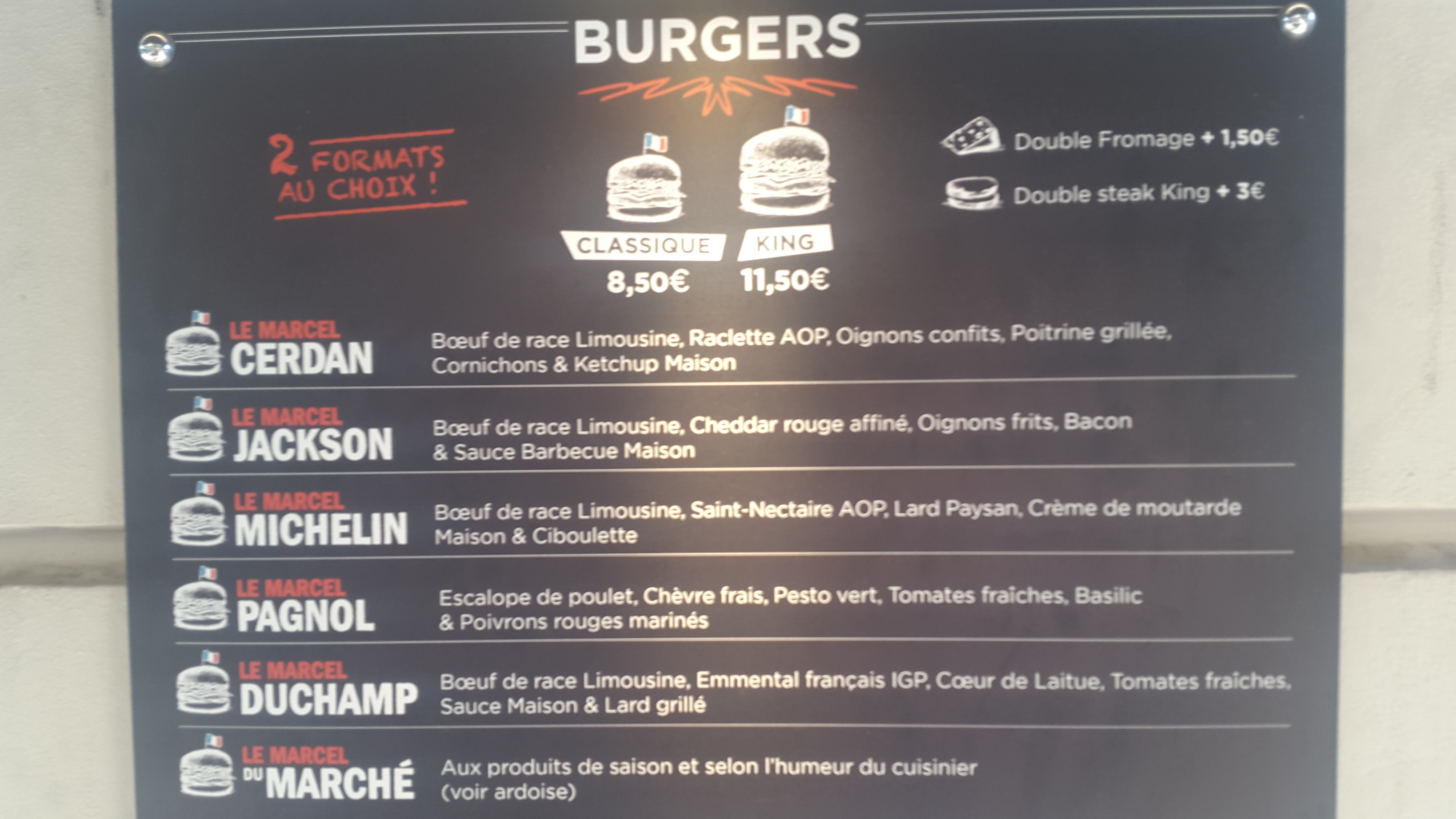 Cher(e) Sel beg, Merci pour votre avis. Les prix de nos menus vont de 9,90€, 12,90€ à 15,90€. Notre viande est de race limousine et les recettes de nos burgers sont élaborées par un chef. Marcel