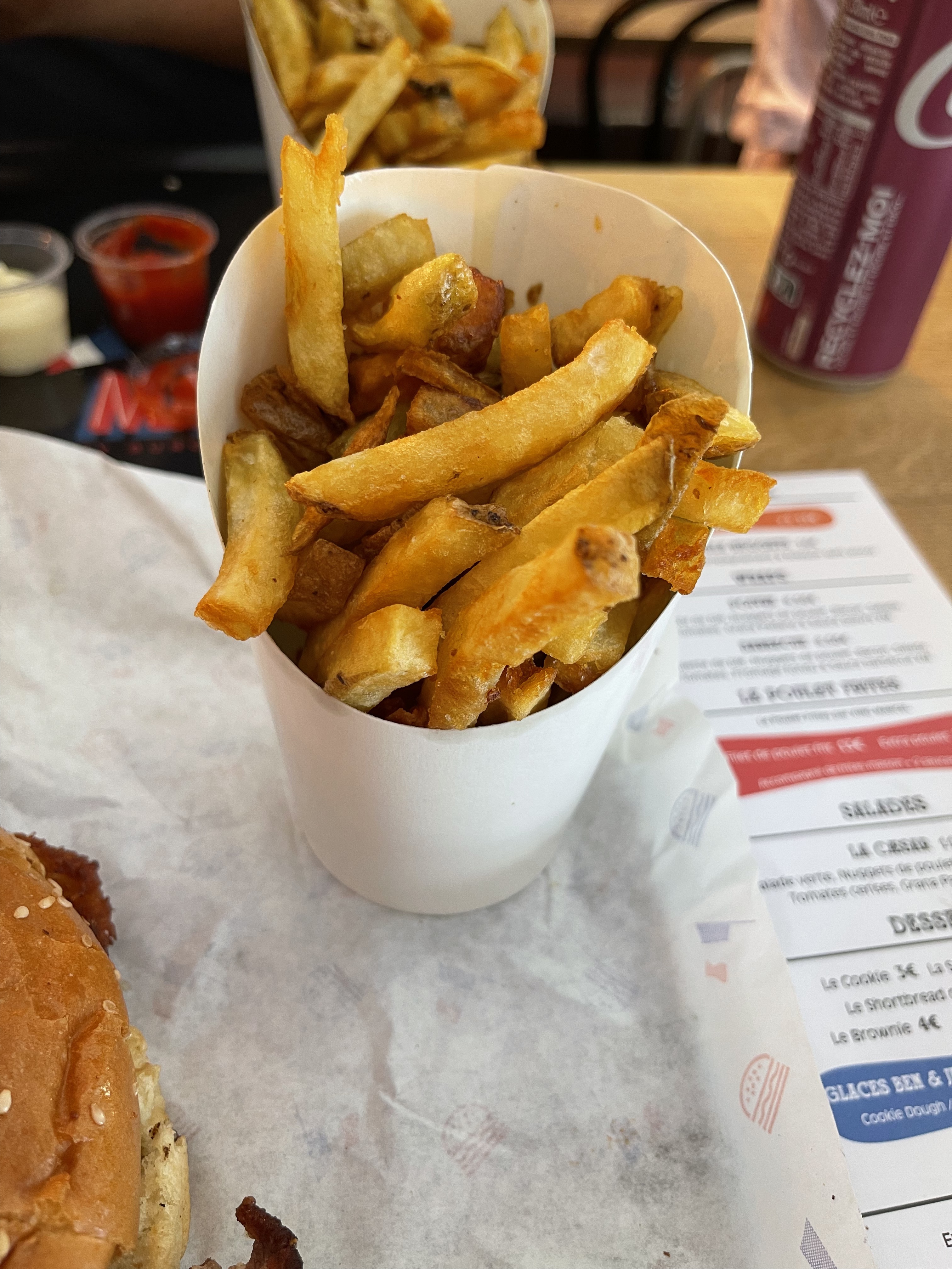 Très déçus sur le dessus des sachets les frites longues et grasses!! Et au fond du sachet que des petits morceaux de frites bien séchées, nous avions demandé deux hamburgers avec un cuisson saignante est l'autre cuisson à point, on s'est retrouvés avec deux hamburges saignants 🥴