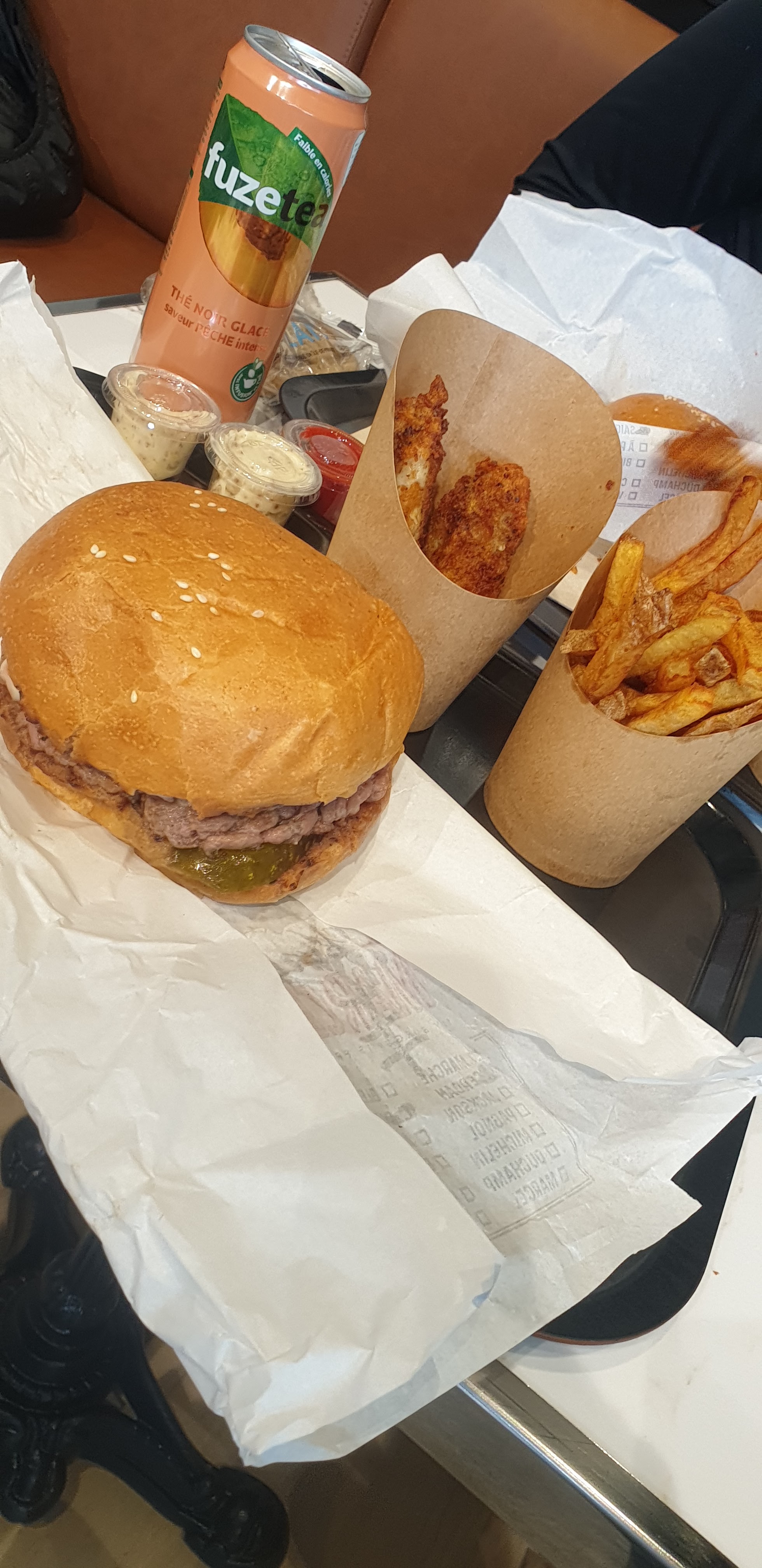 Super bon ! Des burgers de très bonne qualité avec des frites maison et bonus boisson, au souhait, un thé glacé fait maison. Avec un personnel très agréable et très rapide ! Je recommande !