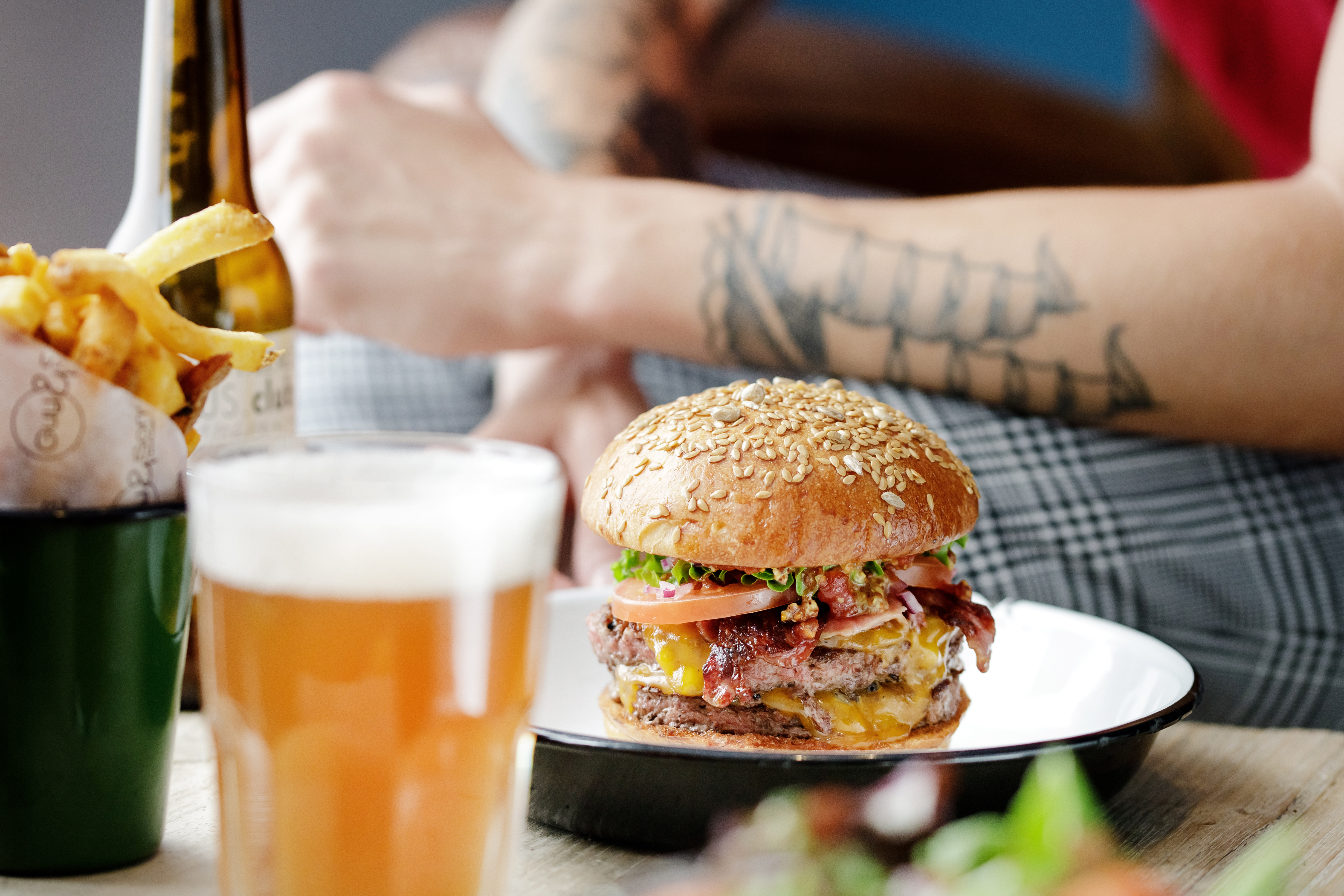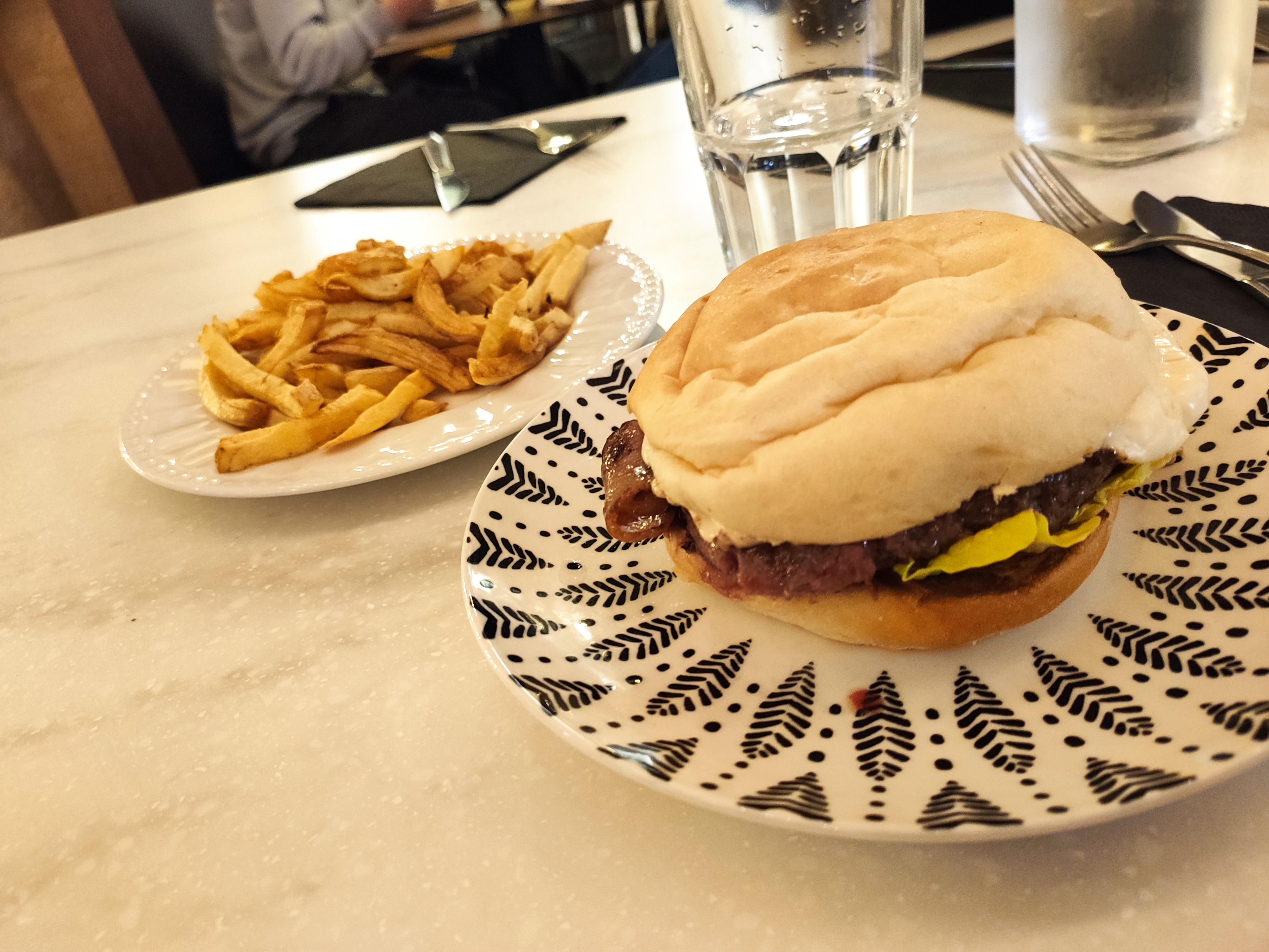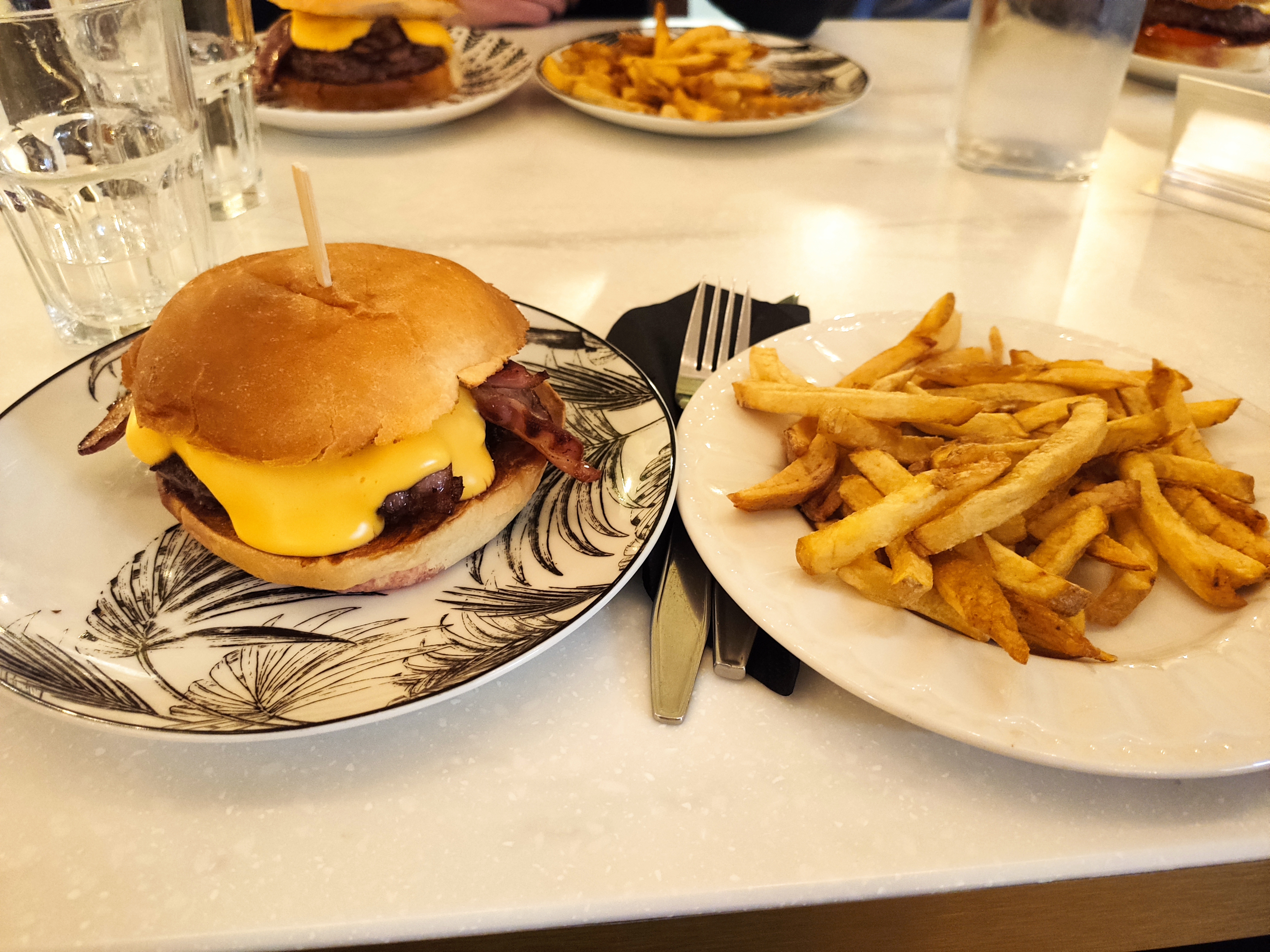Lorsque l'on rentre dans ce restaurant on ressent vraiment une bonne ambiance, la déco industrielle est soignée, on se sent bien, avec des tables hautes et des fauteuils et des tables basses, donc pas de table classique. Les burgers sont bons, je pense qu'ils peuvent s'améliorer sur le pain, je préfère celui du Edmond, Upper ou encore du West Coast. J'avais choisi le TOMÀ à la tomme de savoie, je regrette que la fromage dans mon burger n'ait été présent qu'en petite quantité, je ne l'ai pas vraiment senti. Les frites quant à elles sont quelconques et sont arrivées tièdes. Nous avons trouvé bizarre le système de prise de commande, il faut se lever et donner sa commande à la serveuse qui note sur son écran... or lorsqu'on est un groupe, retenir toutes les commandes de tout le monde (entre burgers, sauce et boissons) ce n'est pas très pratique, nous n'avons pas vu l'intérêt de ce système qui s'applique plutôt au Fast food type Mc Donald's... Pour finir les prix sont plutôt élevés, hors menu on est à 12€ en moyenne (de 10 à 14€) pour un burger et 3€ pour les frites, il y a un menu qui peut être avantageux si on prend une boisson sans alcool et on reste toujours dans la fourchette très haute des burgers à Bordeaux. On trouve moins cher et meilleur à ce prix là.