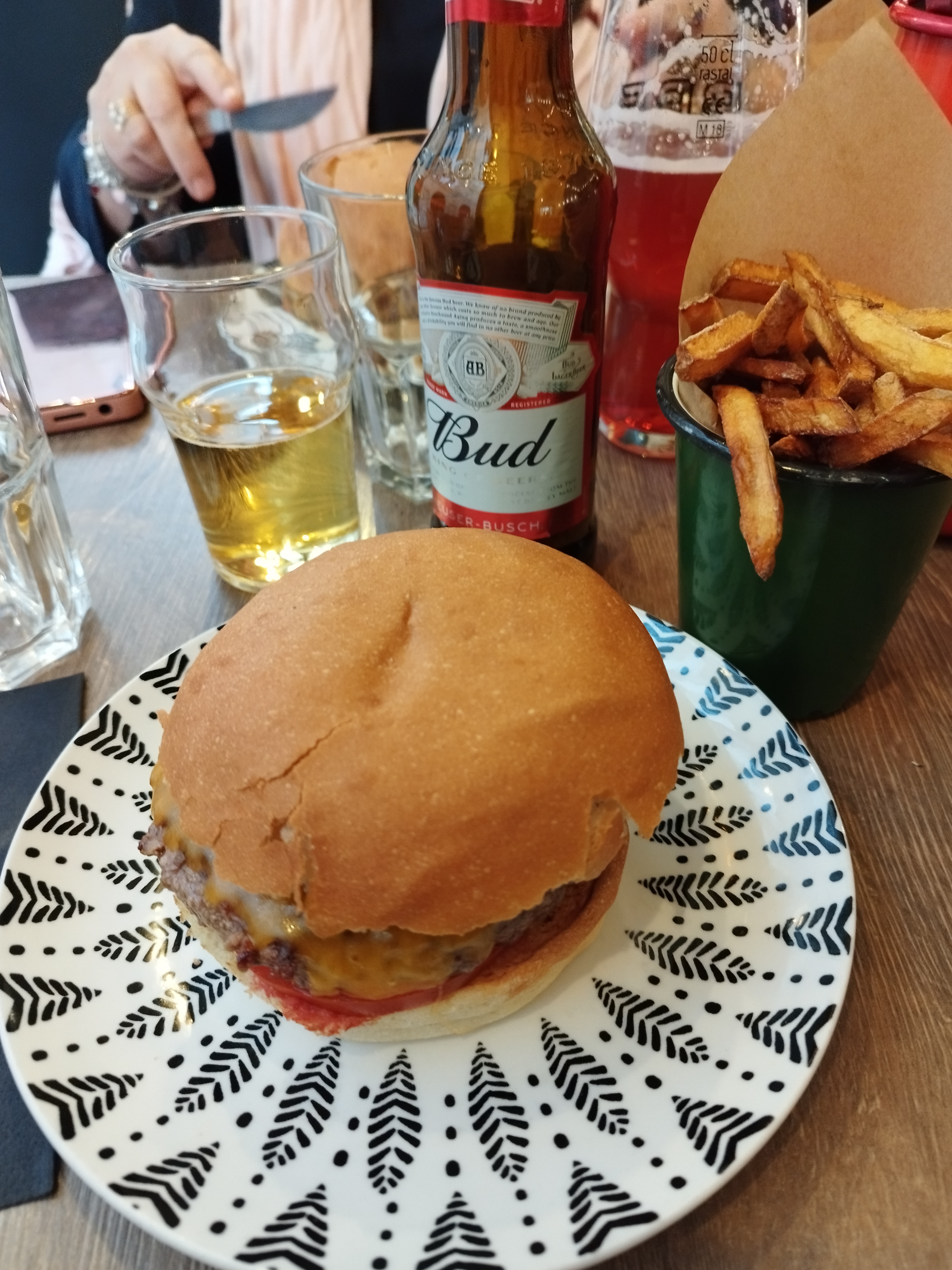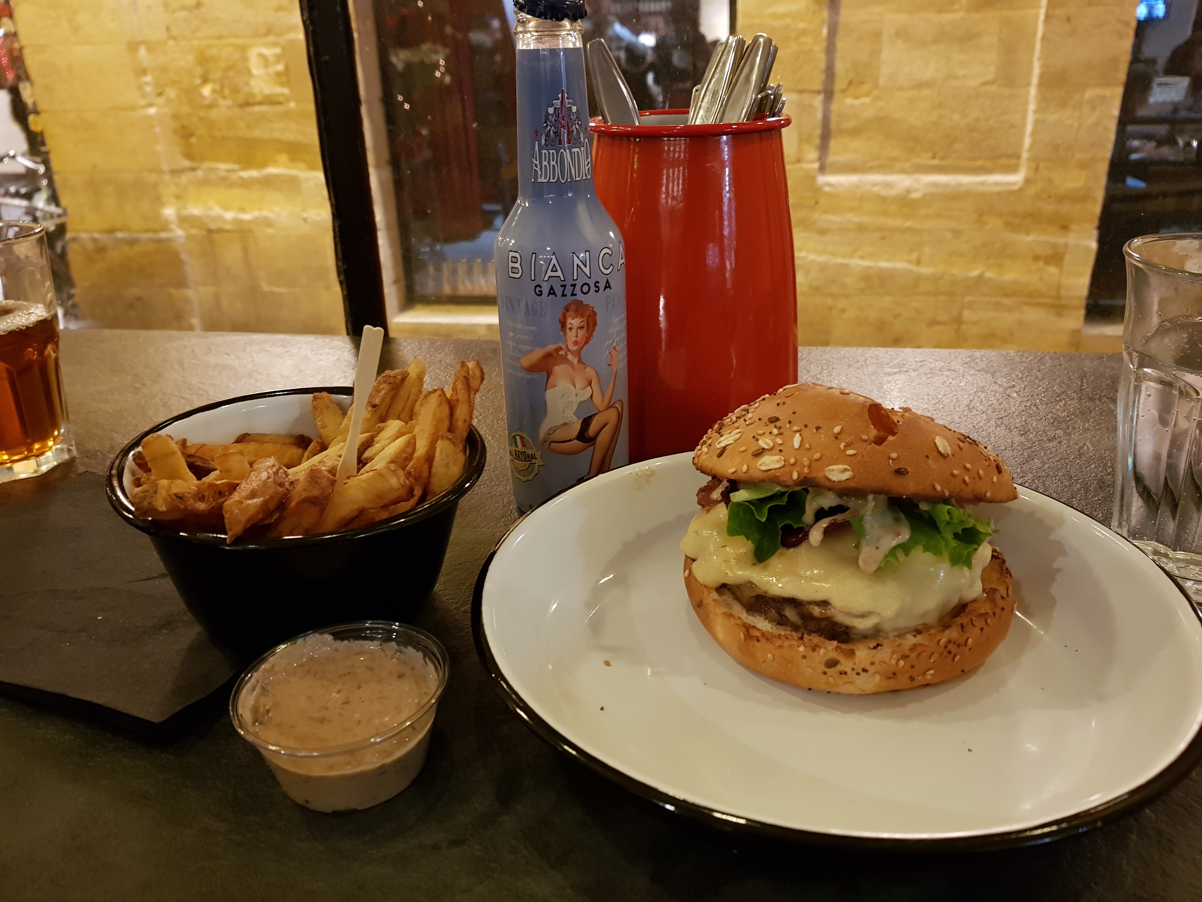 Cadre sympa. Serveuse très agréable. Burger pas mal du tout: Une étoile en moins pour les frites un peu molles et tièdes (servies dans un carton) et c est un peu cher quand même compter 15-20 euros par personne.