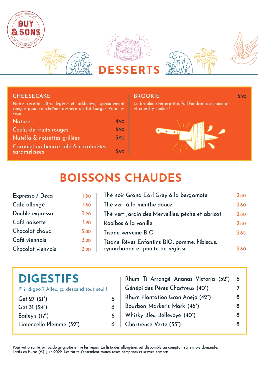 Bonjour Philippe, Un grand MERCI pour vos compliments sur nos burgers maison 🍔. Nous tenons compte de vos remarques sur nos desserts 🍰 A très vite sur place ou en livraison 🛵 L'équipe Guy & Sons Bordeaux.