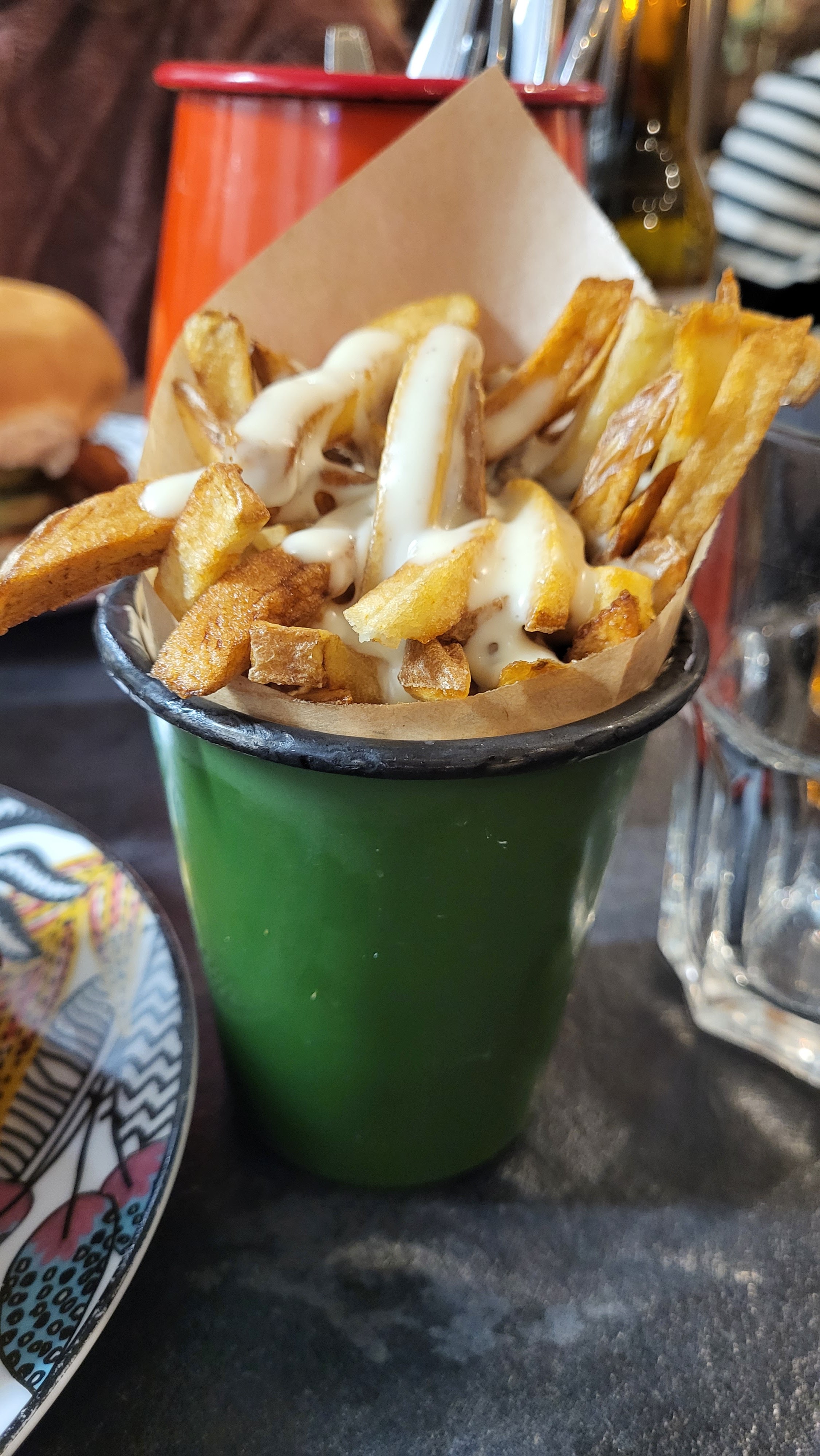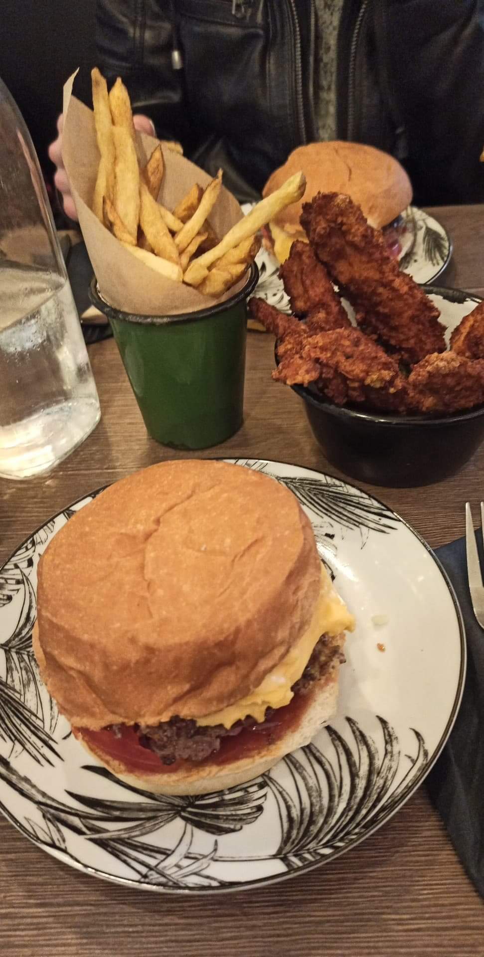 Plutôt déçu. J’ai pris un burger bang bang … très sec et pas franchement goûteux. Les frites sont quelconques. Mon épouse a pris des tenders… très secs également, pas croustillants. La mayonnaise est payante. Compter 50 centimes. En résumé resto branché mais pas top a mon goût