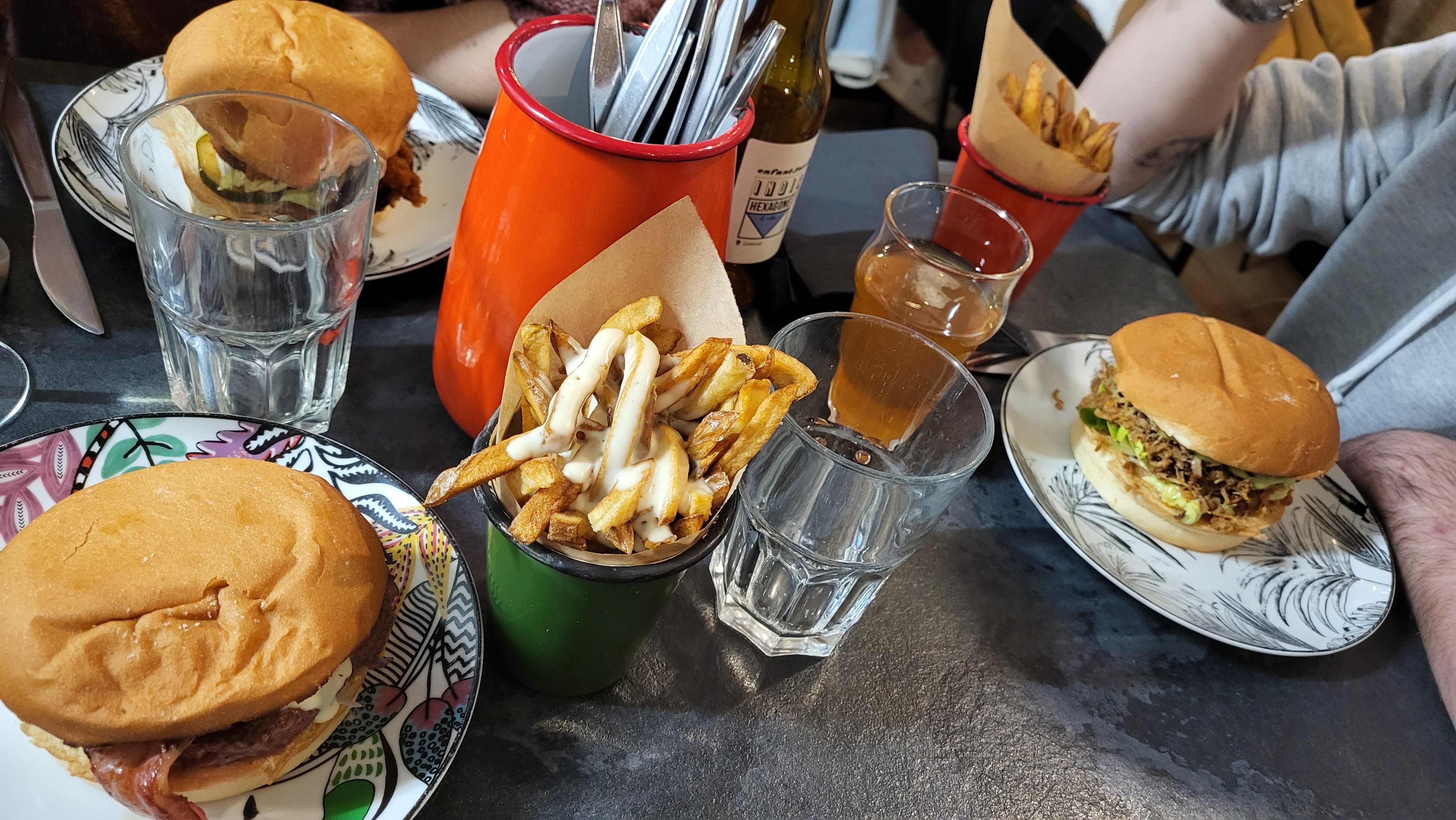 Commençons tout simplement par dire que c'était une DINGUERIE. On a commencé avec des nachos qui était super bon , première fois qu'on en mange avec de la crème de comté à la place du cheddar habituel et je préfère largement , bon par contre on s'est fais surprendre par la quantité, il y en avait largement assez pour deux . Ensuite les burger étaient excellent mais après s'être jeté sur les nachos impossible de les finir malheureusement, du coup pas pu gouter les desserts 🥲. Franchement une très bonne adresse , très bien accueilli, pas d'attente pour un samedi soir. J'y retournerais c'est sûr.