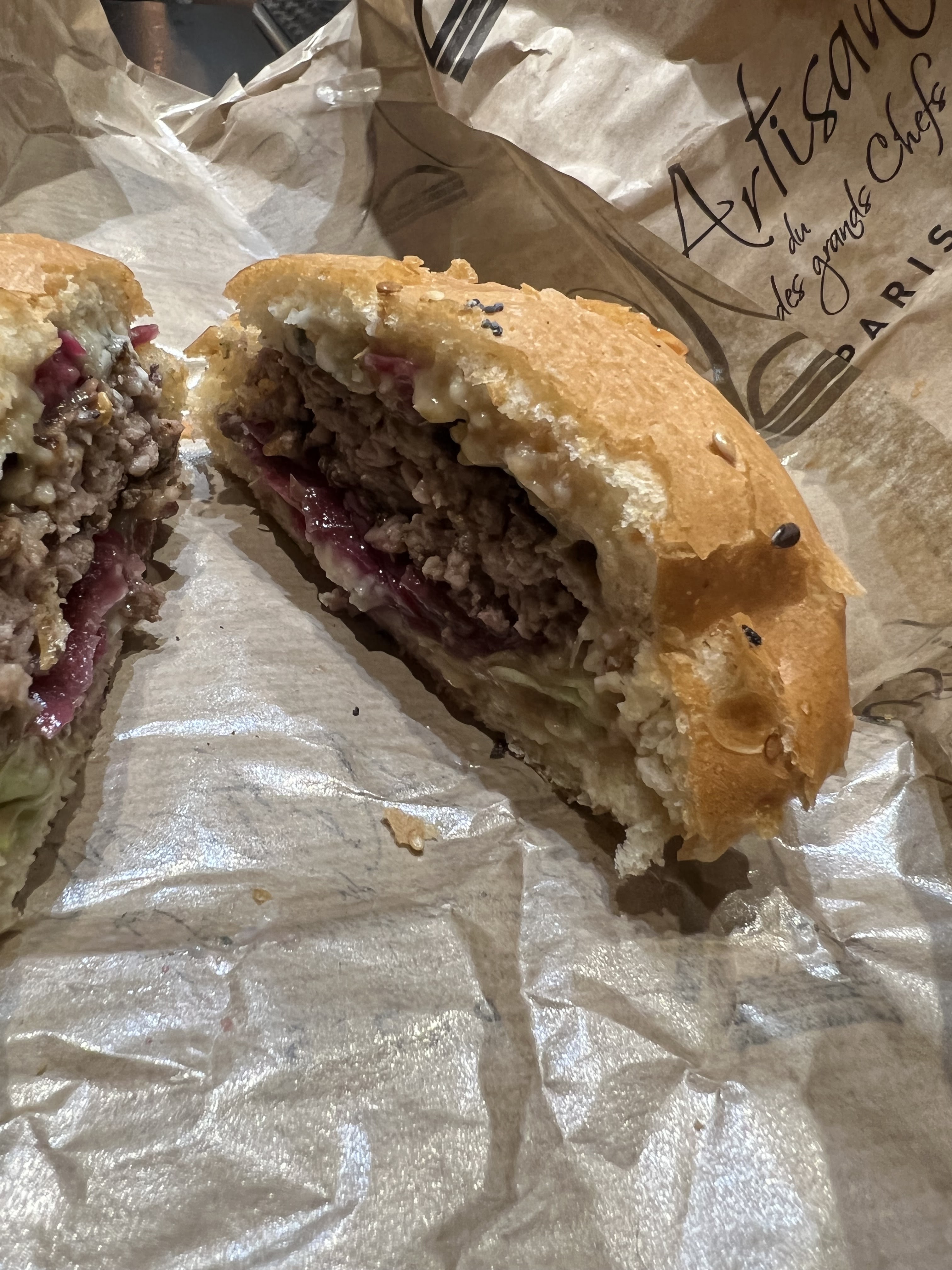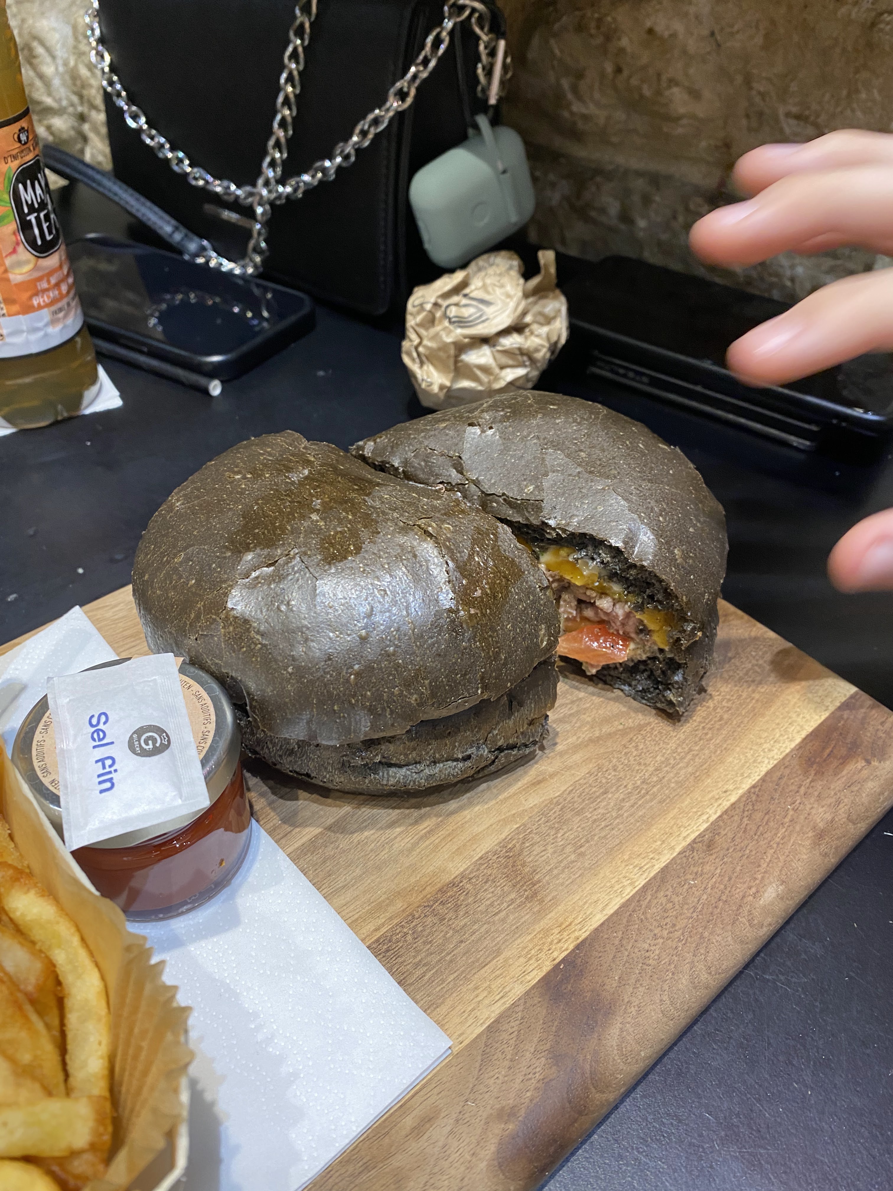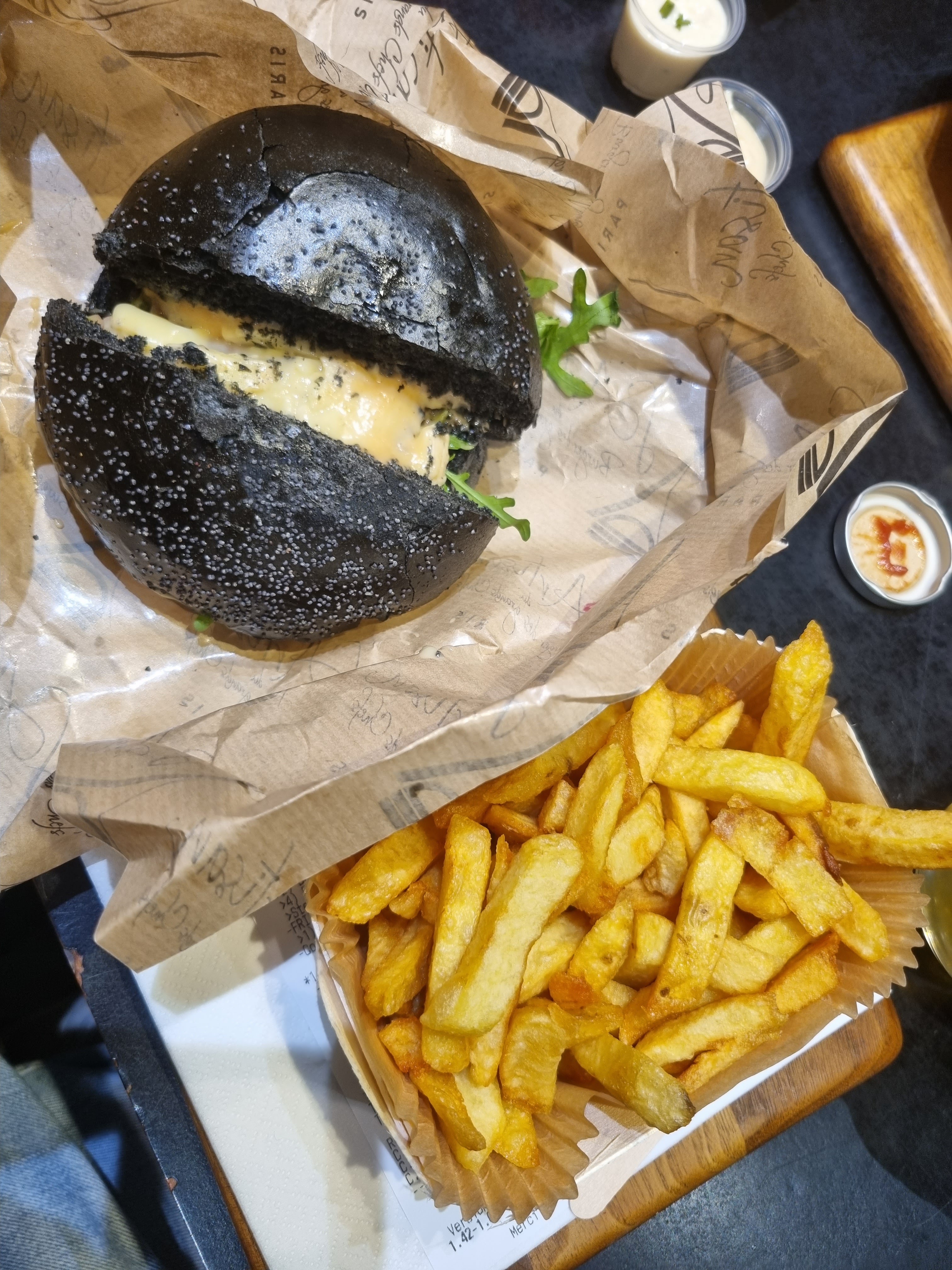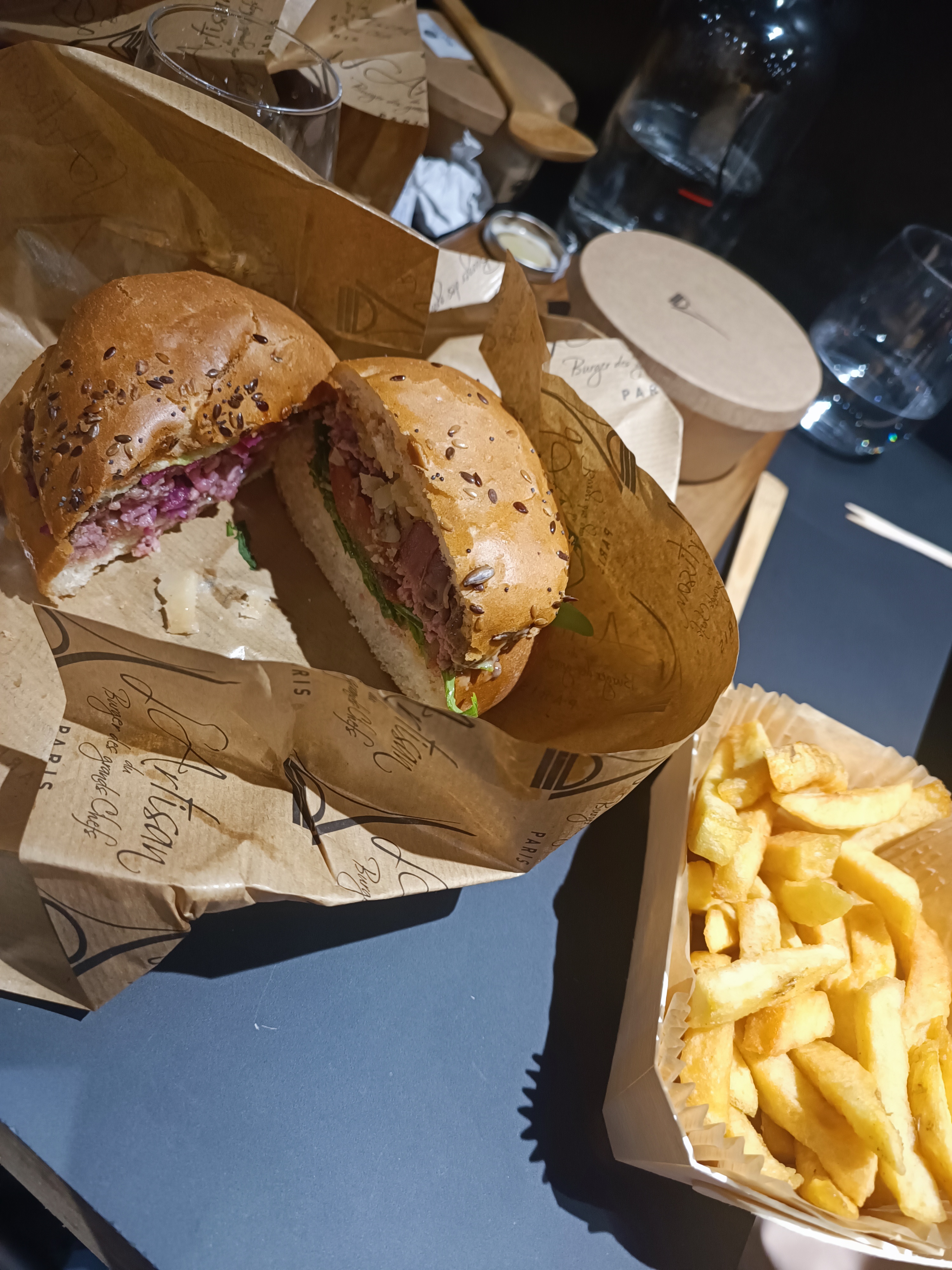 J’ai bien aimé le Montmartre (reblochon) pain Normal ( confits d’oignons un peu sucré mais délicieux !) J’ai moins apprécié le Champs-Élysées avec le pain charbon ( ça manque d’harmonie dans la bouche : on a le goût des ingrédients séparés pain + viande + reste ) mais pas le concept Burger 🍔 Serveuse avec grande boucle à l’oreille, lunettes, pas très grande 😅 elle est adorable, professionnelle et à l’écoute ! Prix / qualité = Bien +