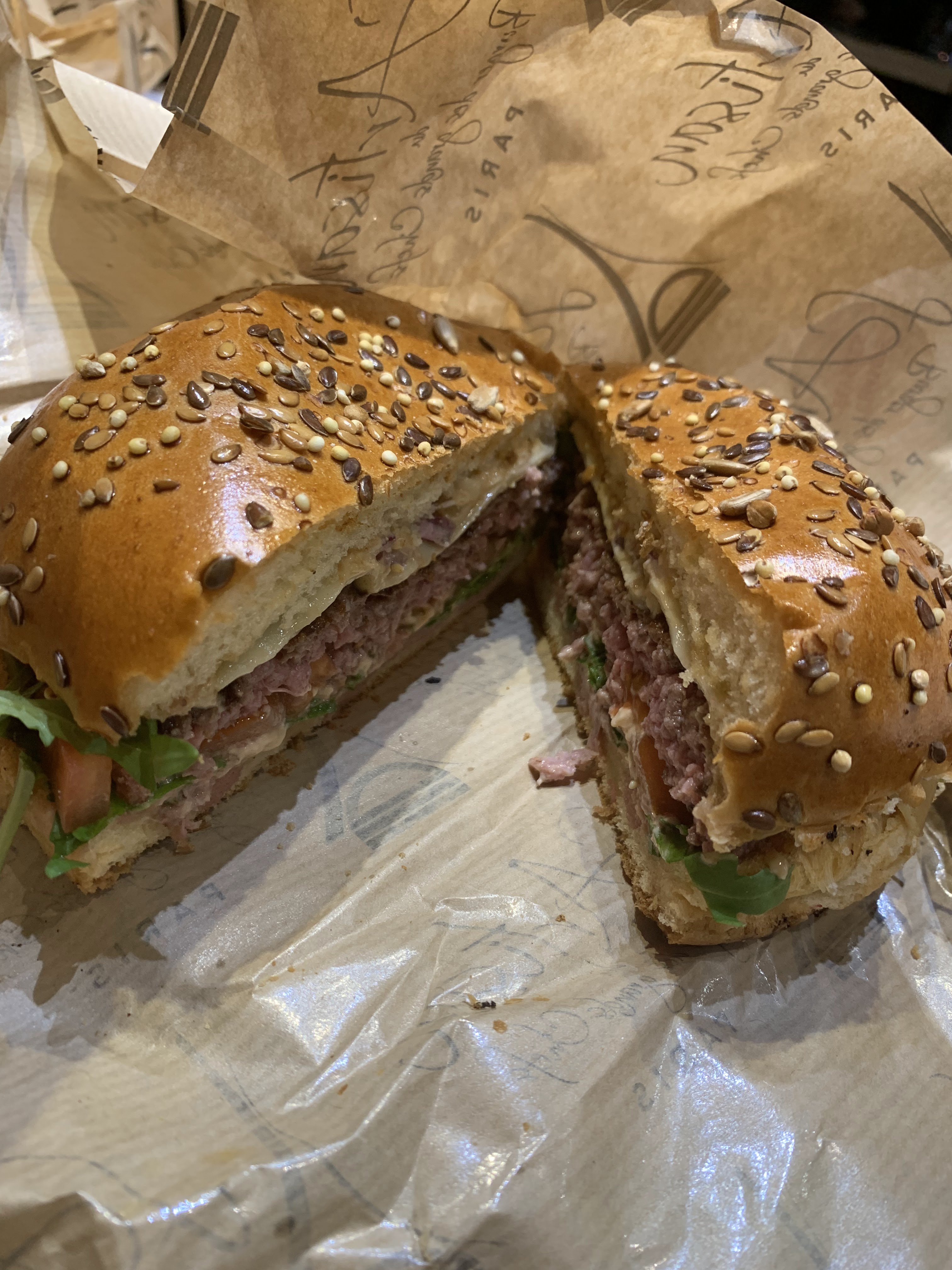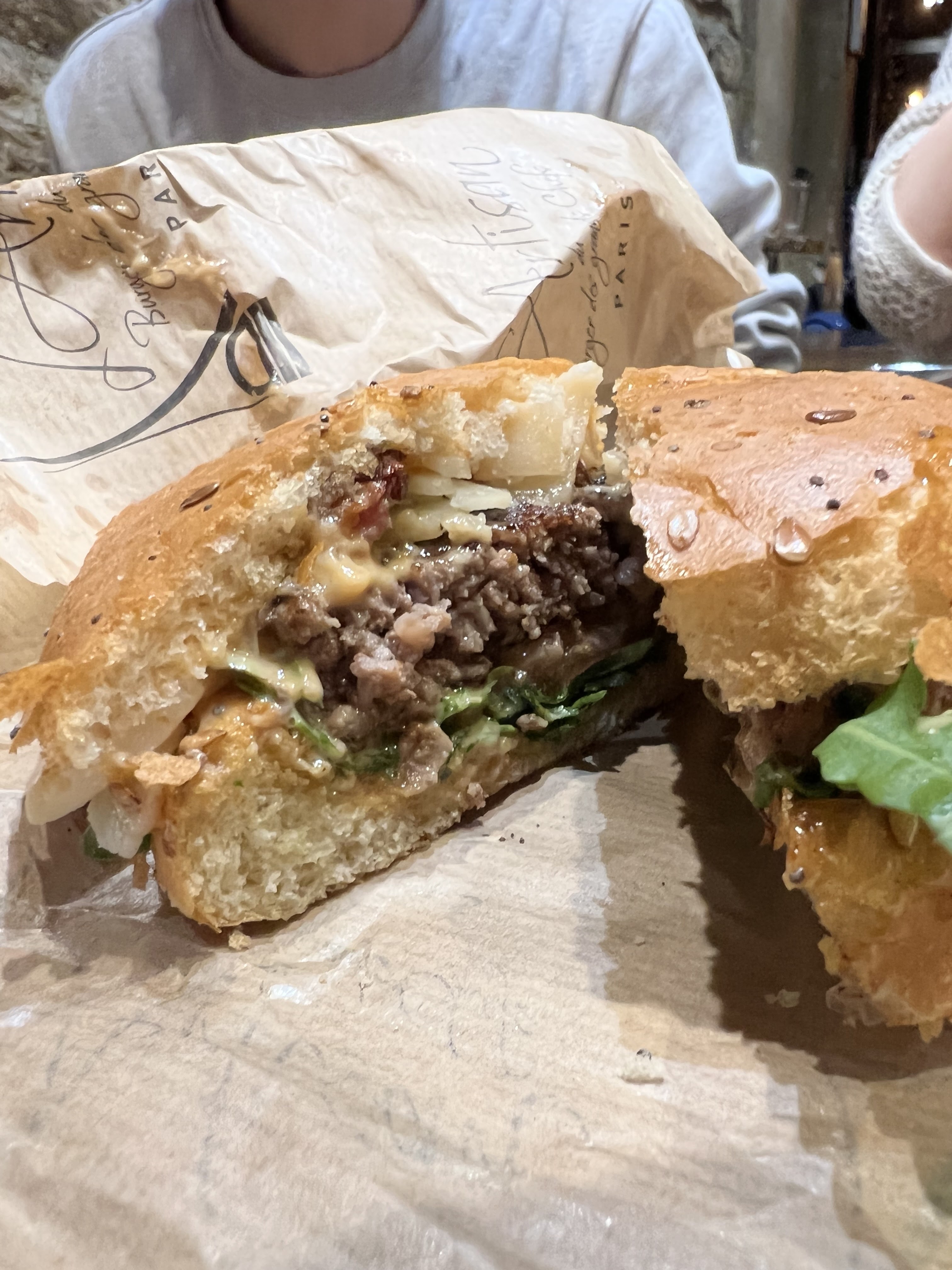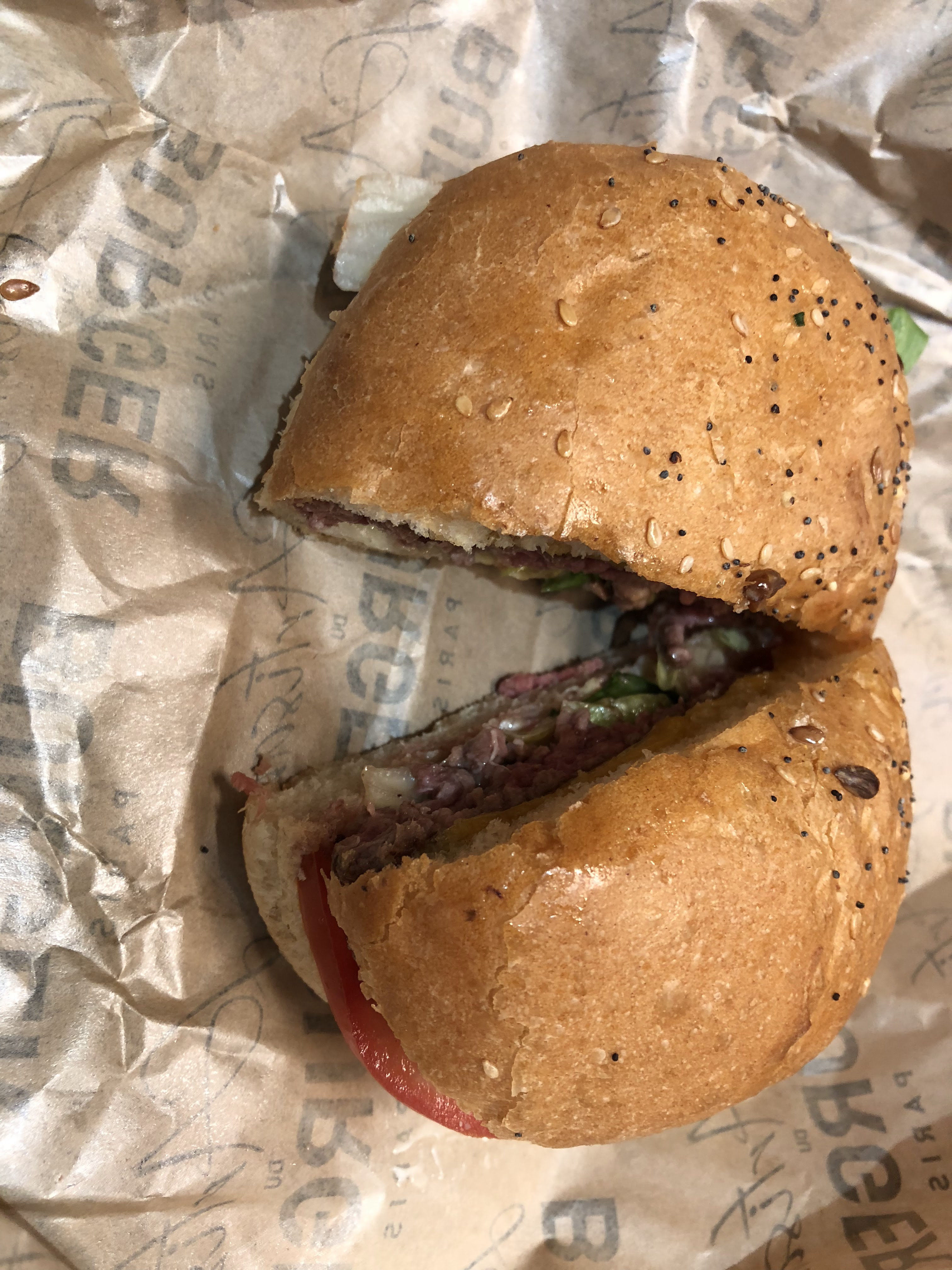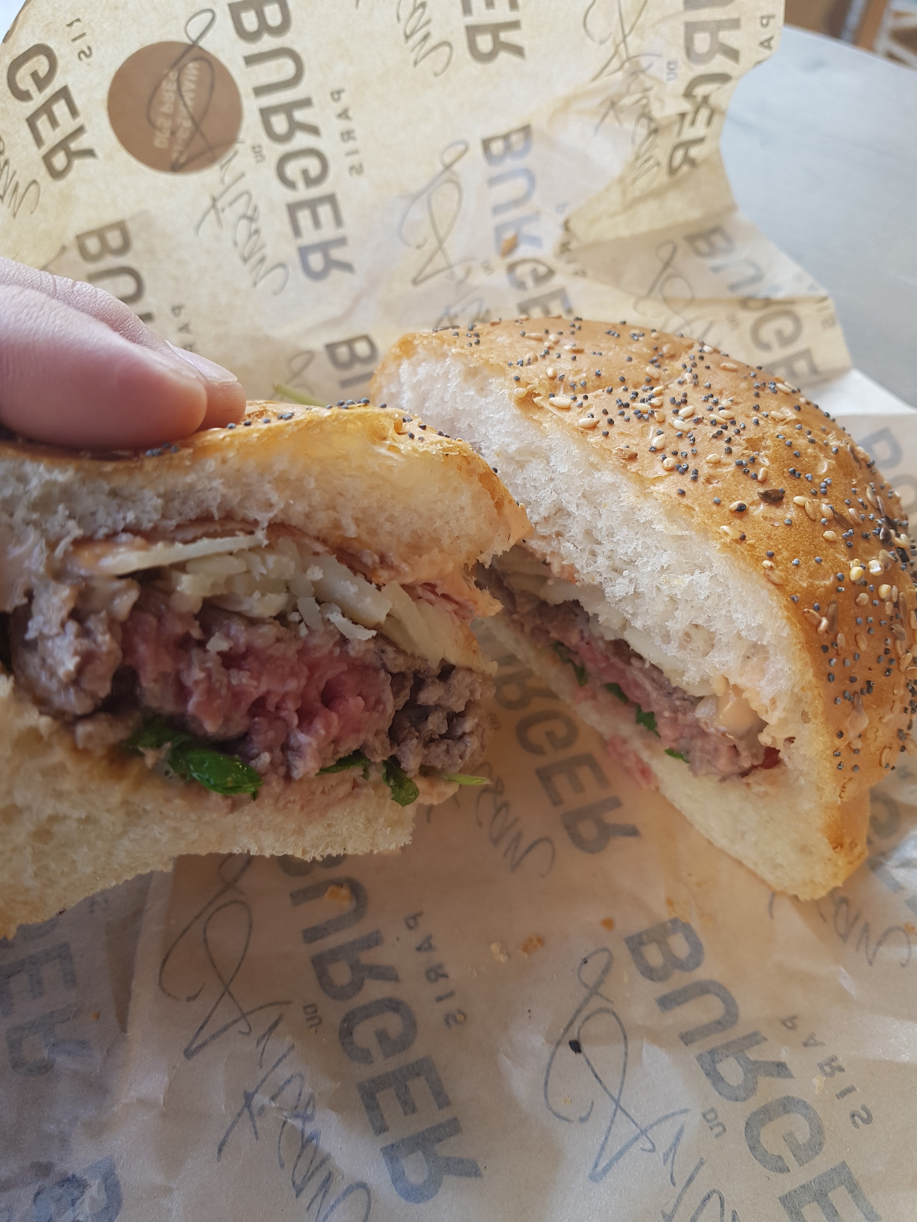 J’ai bien aimé le Montmartre (reblochon) pain Normal ( confits d’oignons un peu sucré mais délicieux !) J’ai moins apprécié le Champs-Élysées avec le pain charbon ( ça manque d’harmonie dans la bouche : on a le goût des ingrédients séparés pain + viande + reste ) mais pas le concept Burger 🍔 Serveuse avec grande boucle à l’oreille, lunettes, pas très grande 😅 elle est adorable, professionnelle et à l’écoute ! Prix / qualité = Bien +