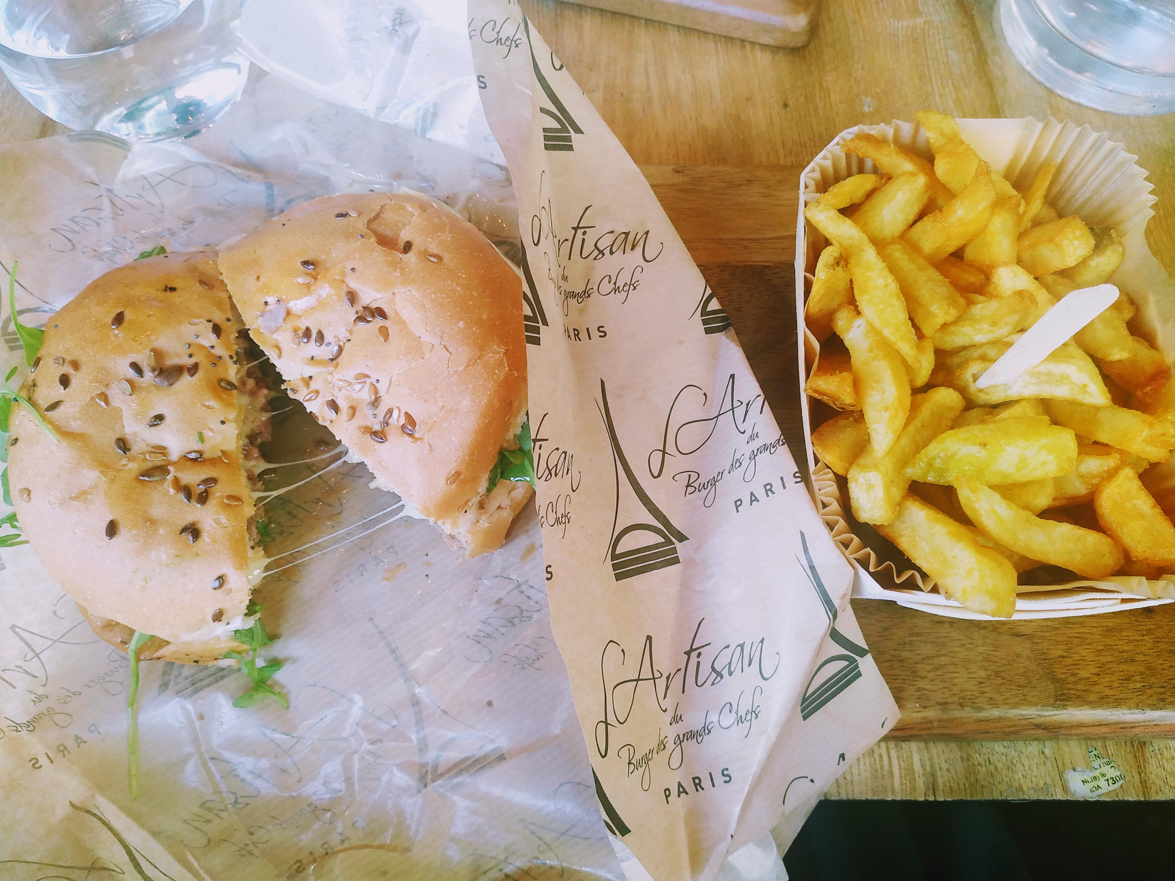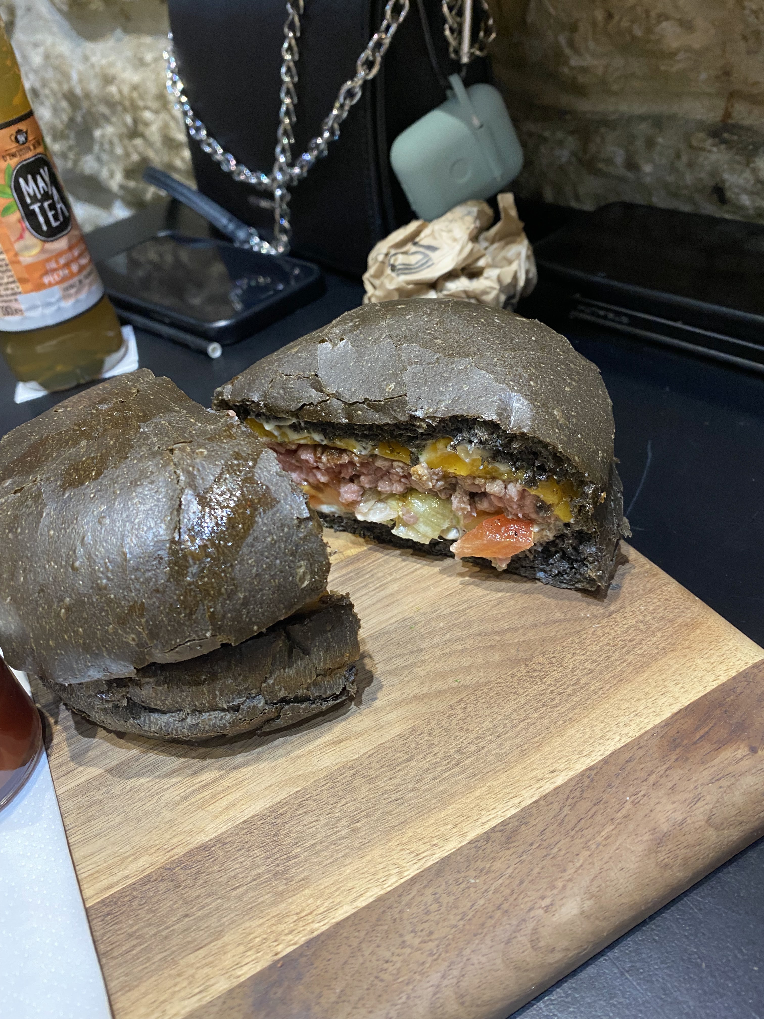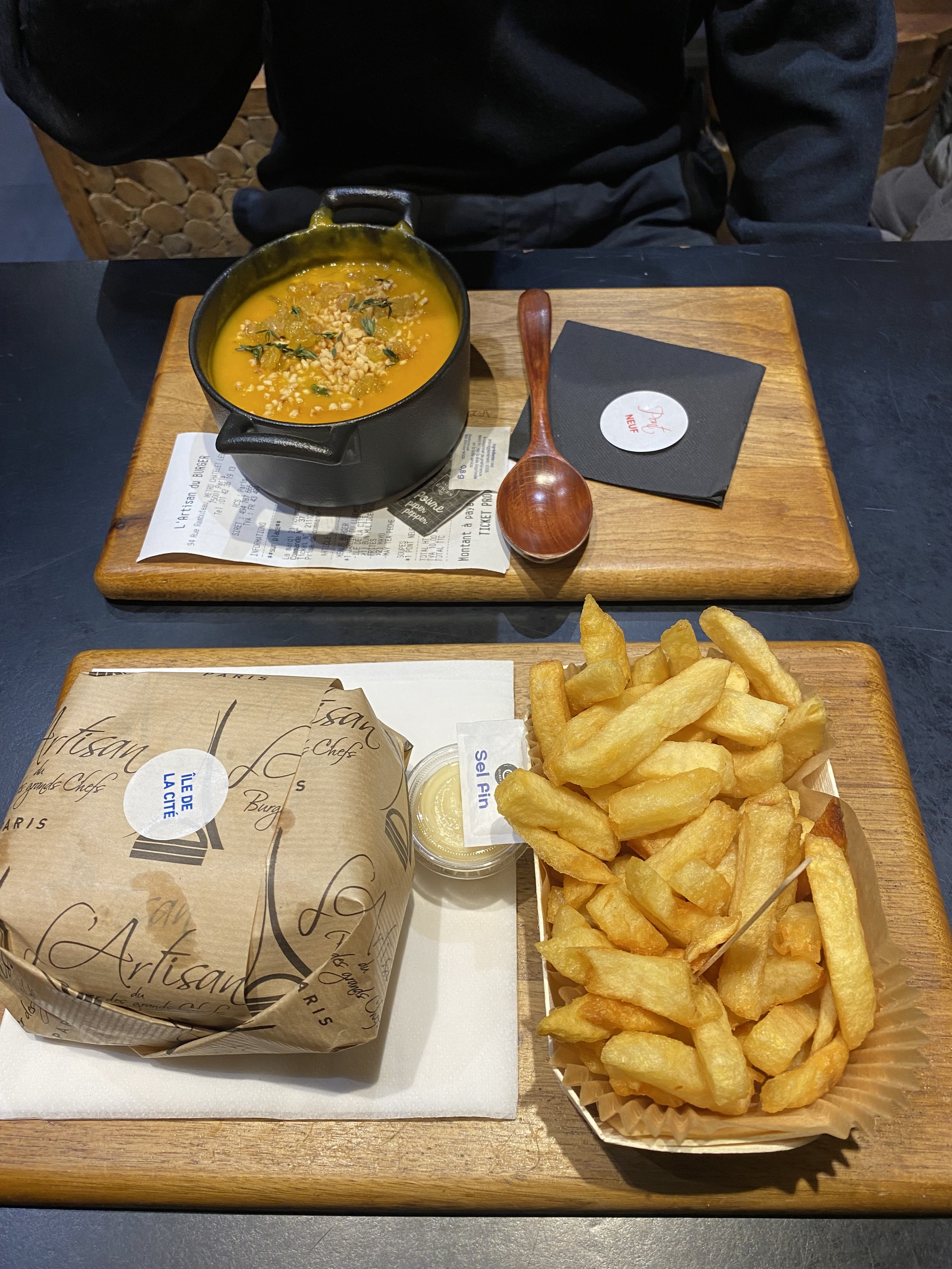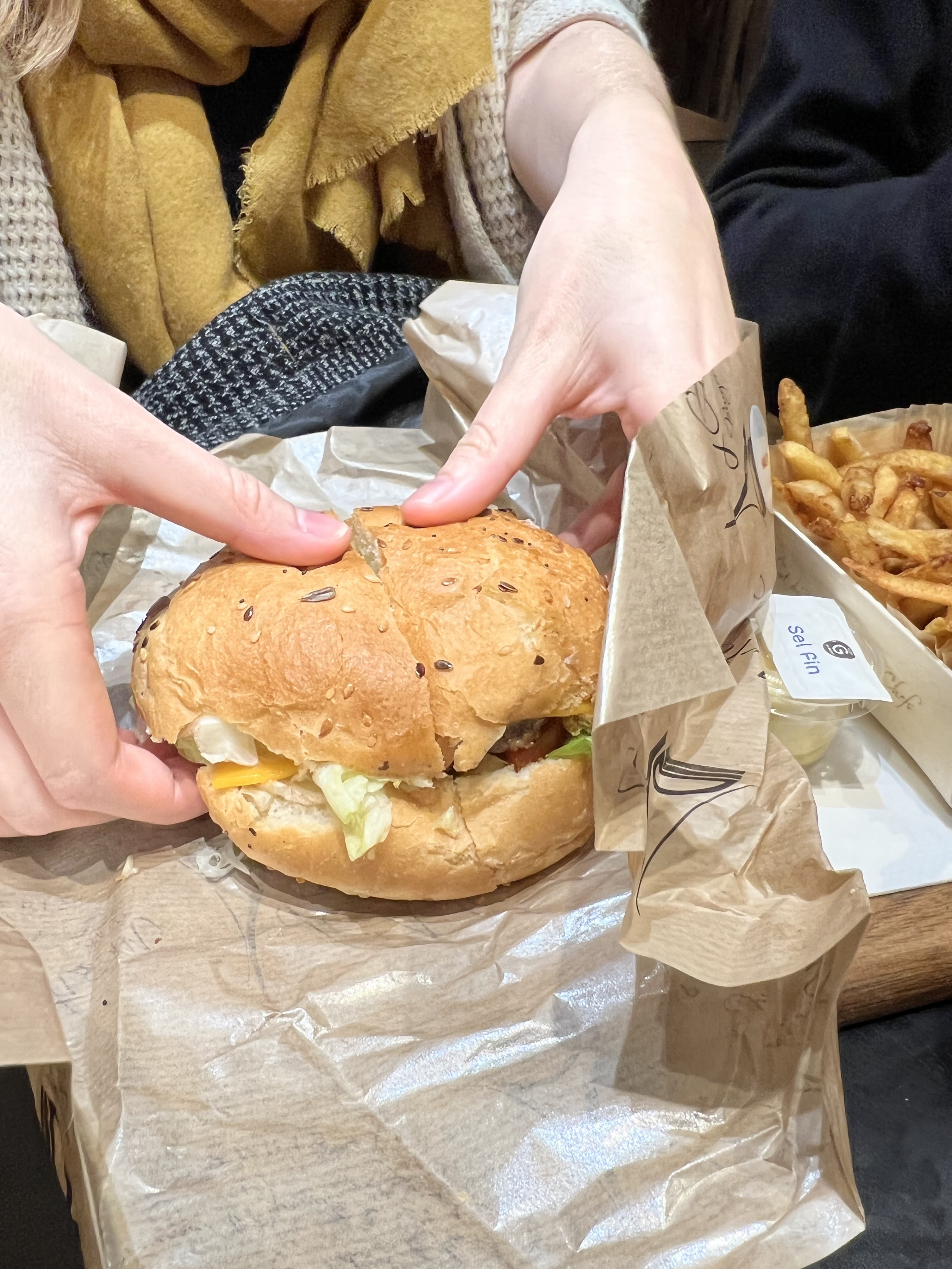 J’ai bien aimé le Montmartre (reblochon) pain Normal ( confits d’oignons un peu sucré mais délicieux !) J’ai moins apprécié le Champs-Élysées avec le pain charbon ( ça manque d’harmonie dans la bouche : on a le goût des ingrédients séparés pain + viande + reste ) mais pas le concept Burger 🍔 Serveuse avec grande boucle à l’oreille, lunettes, pas très grande 😅 elle est adorable, professionnelle et à l’écoute ! Prix / qualité = Bien +