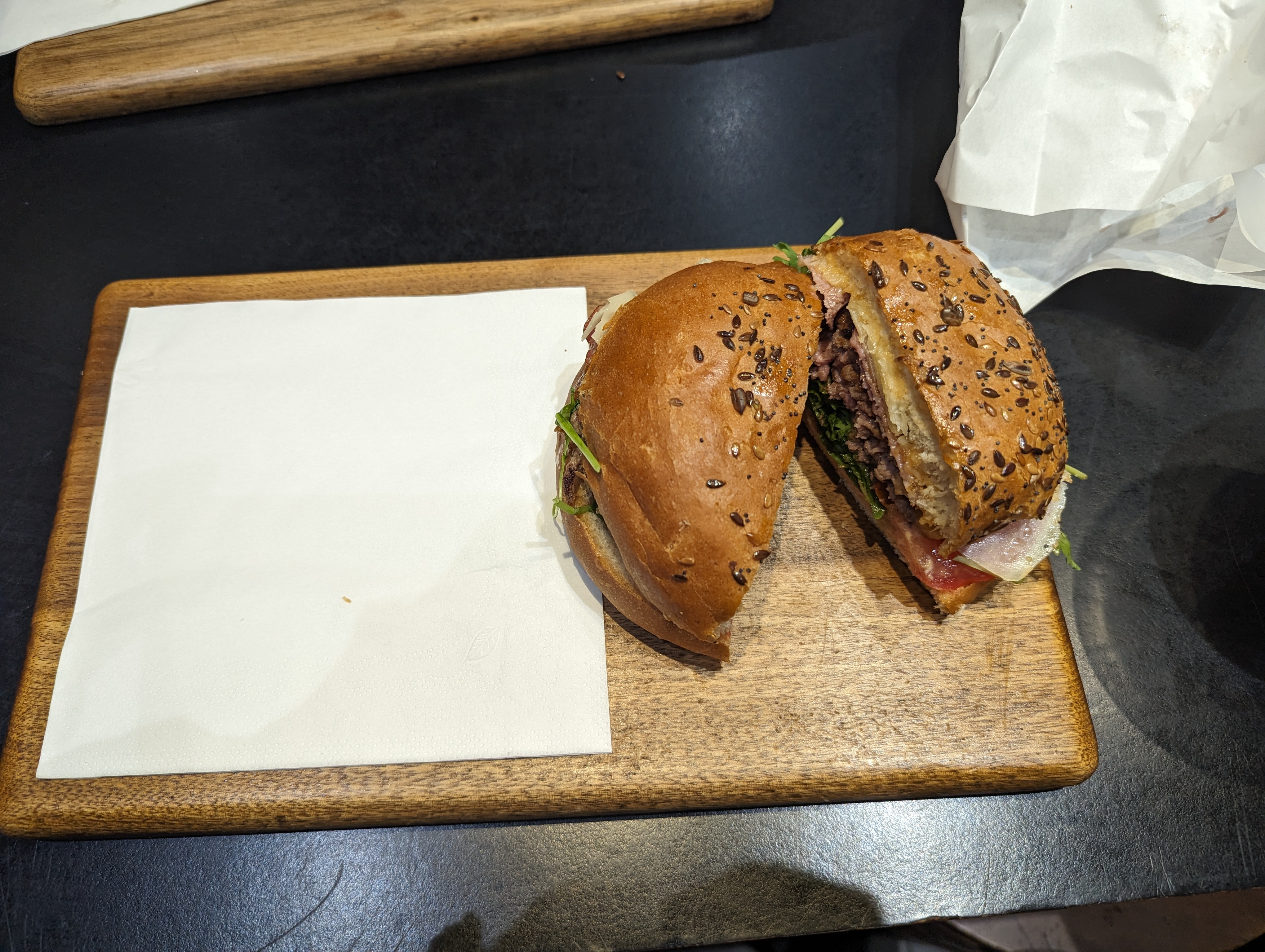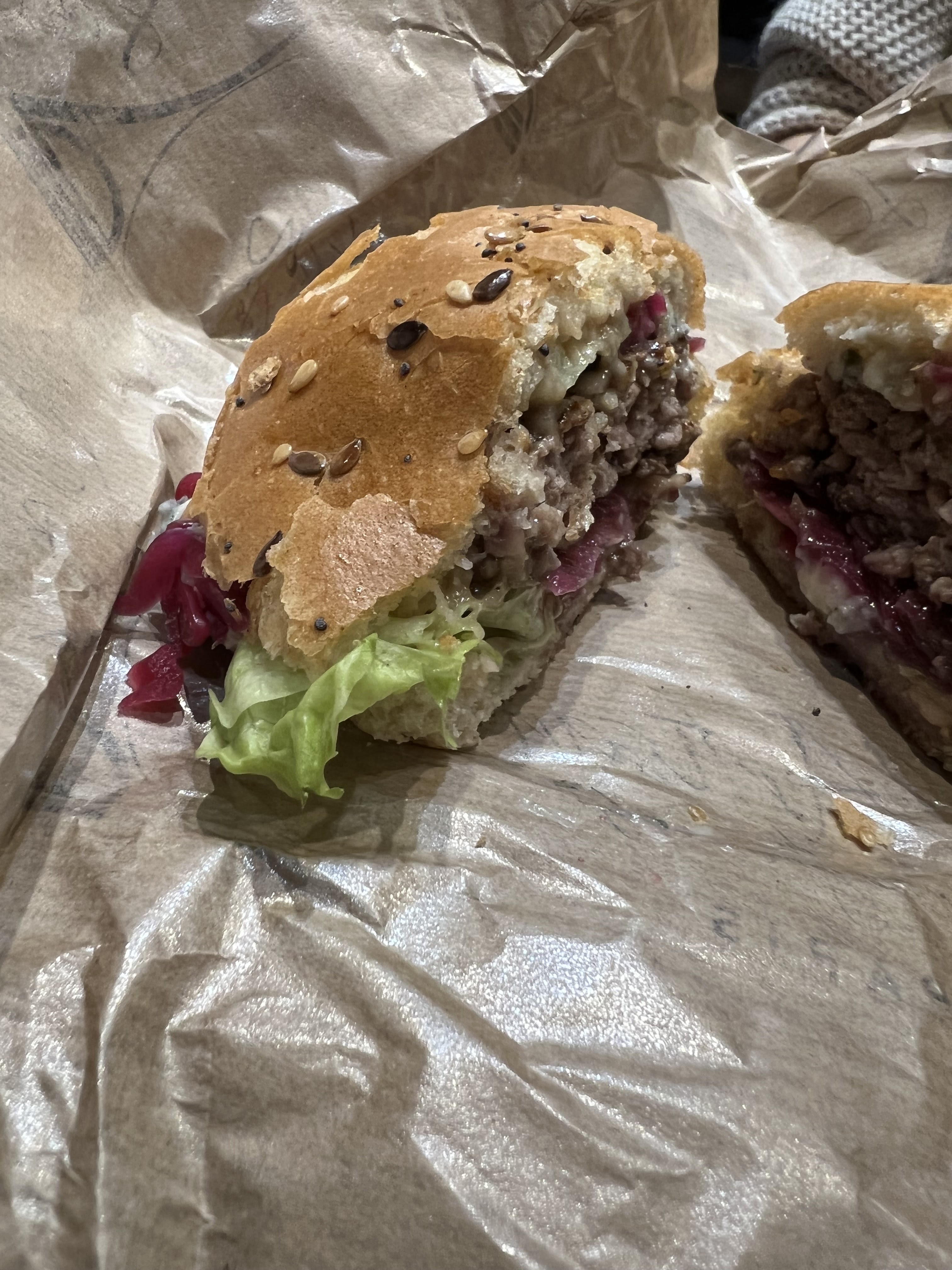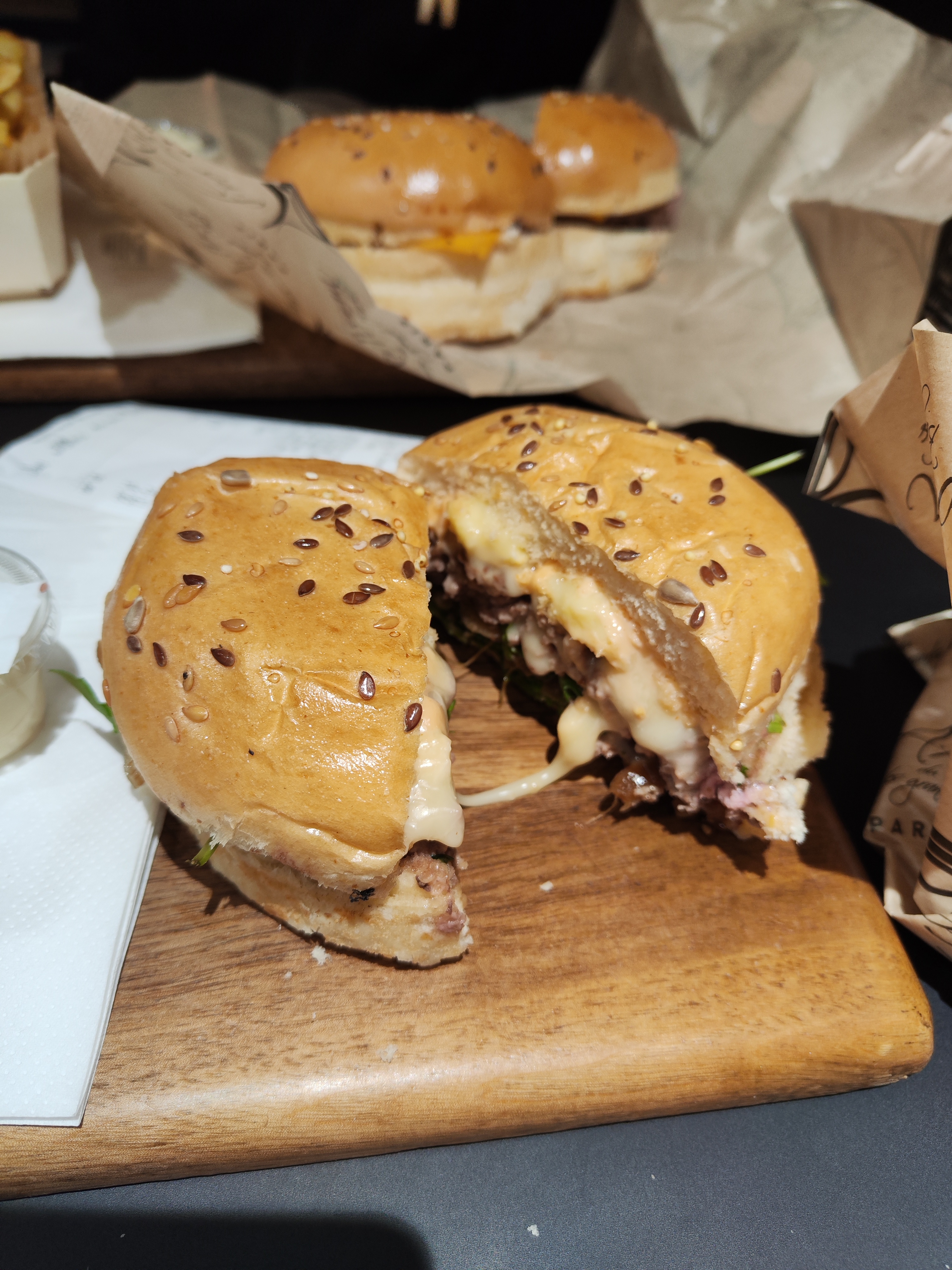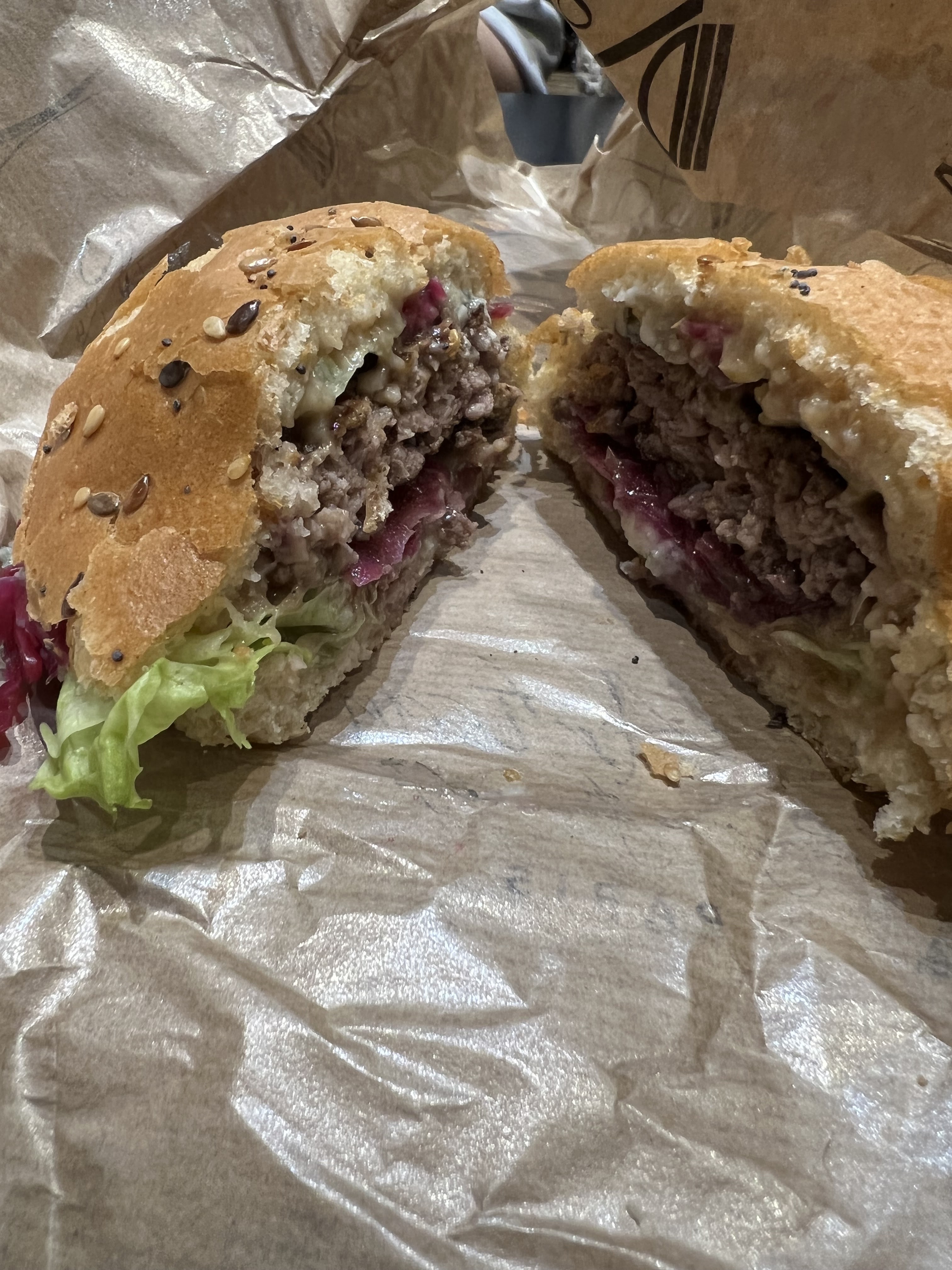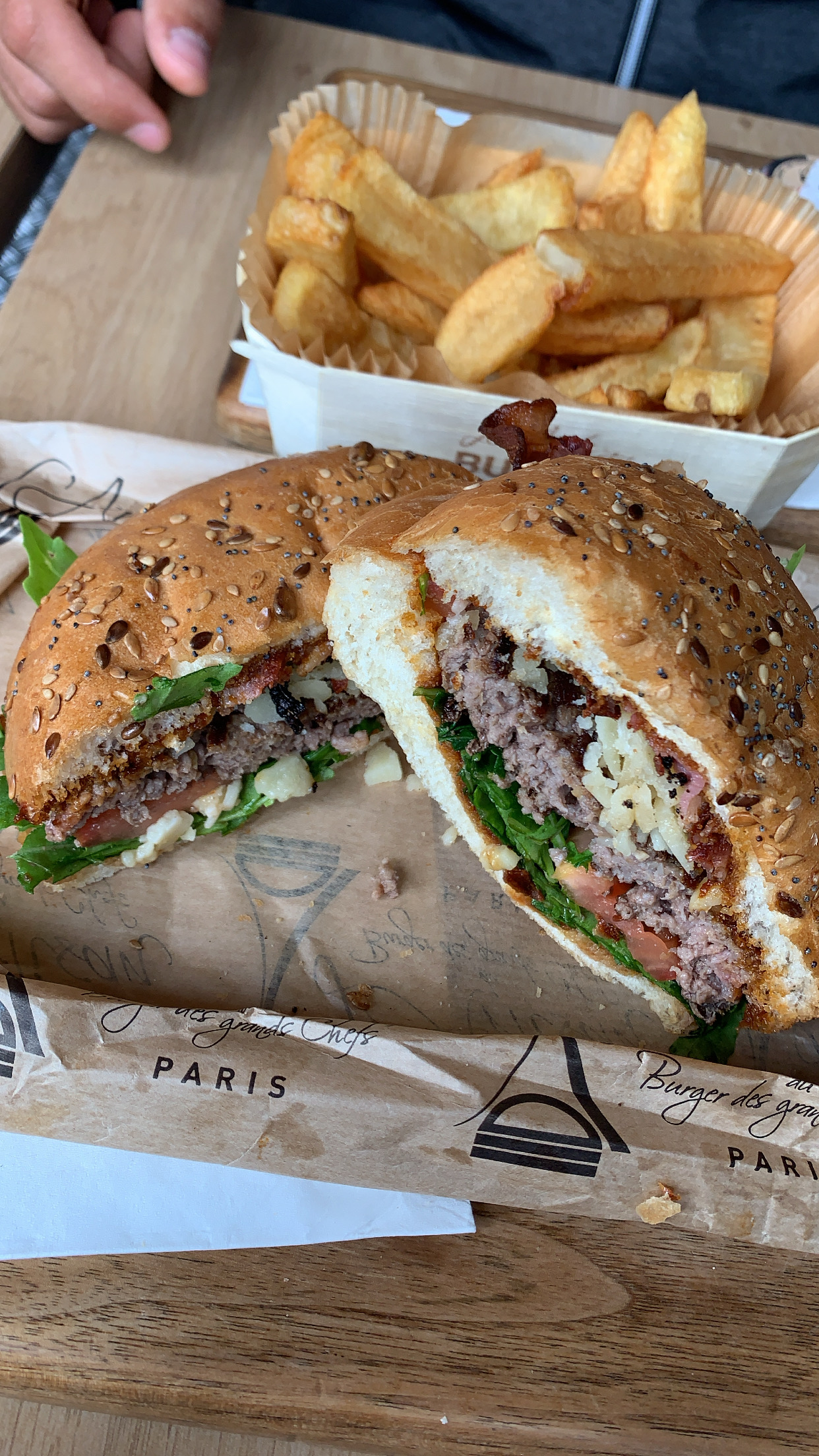 J’ai bien aimé le Montmartre (reblochon) pain Normal ( confits d’oignons un peu sucré mais délicieux !) J’ai moins apprécié le Champs-Élysées avec le pain charbon ( ça manque d’harmonie dans la bouche : on a le goût des ingrédients séparés pain + viande + reste ) mais pas le concept Burger 🍔 Serveuse avec grande boucle à l’oreille, lunettes, pas très grande 😅 elle est adorable, professionnelle et à l’écoute ! Prix / qualité = Bien +