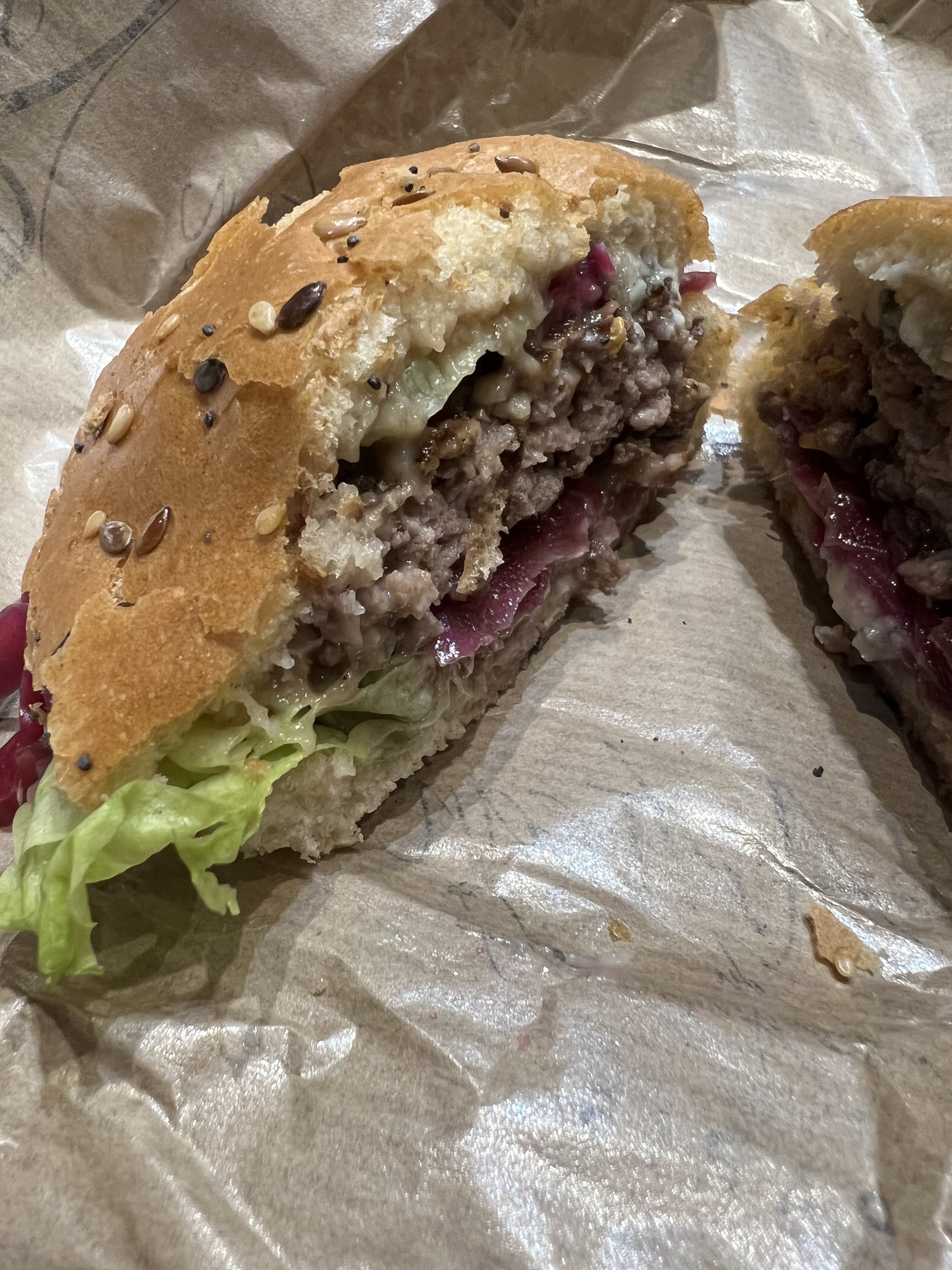 De très bon burger avec une bonne qualité de produit frais j’ai pris le bœuf roquefort. Je pense que celui devrais être revue en guise de dose le roquefort prend trop le dessus aux restes. Mais très bon et surtout pas chère pour des burger de MOF. Ce midi.