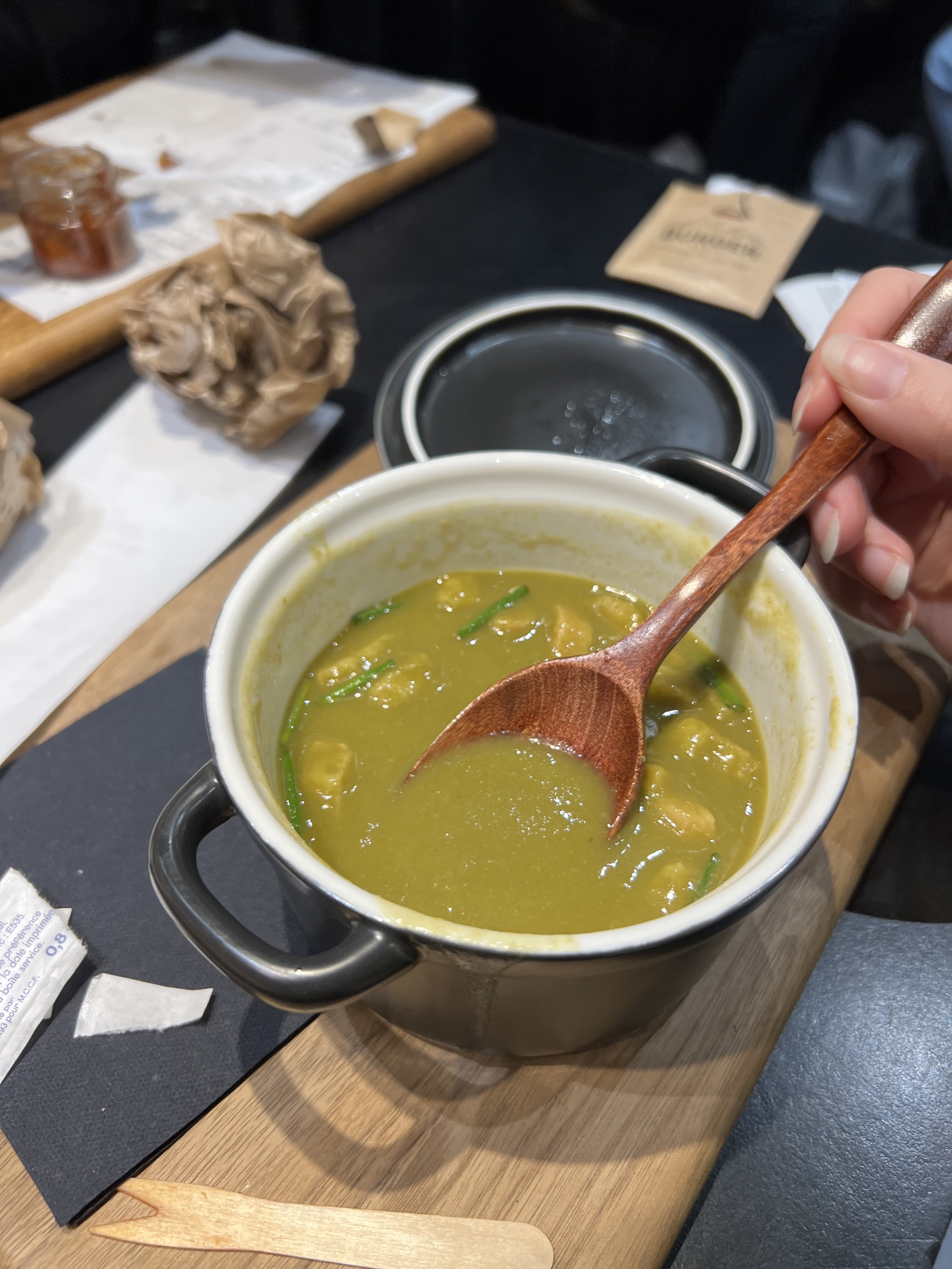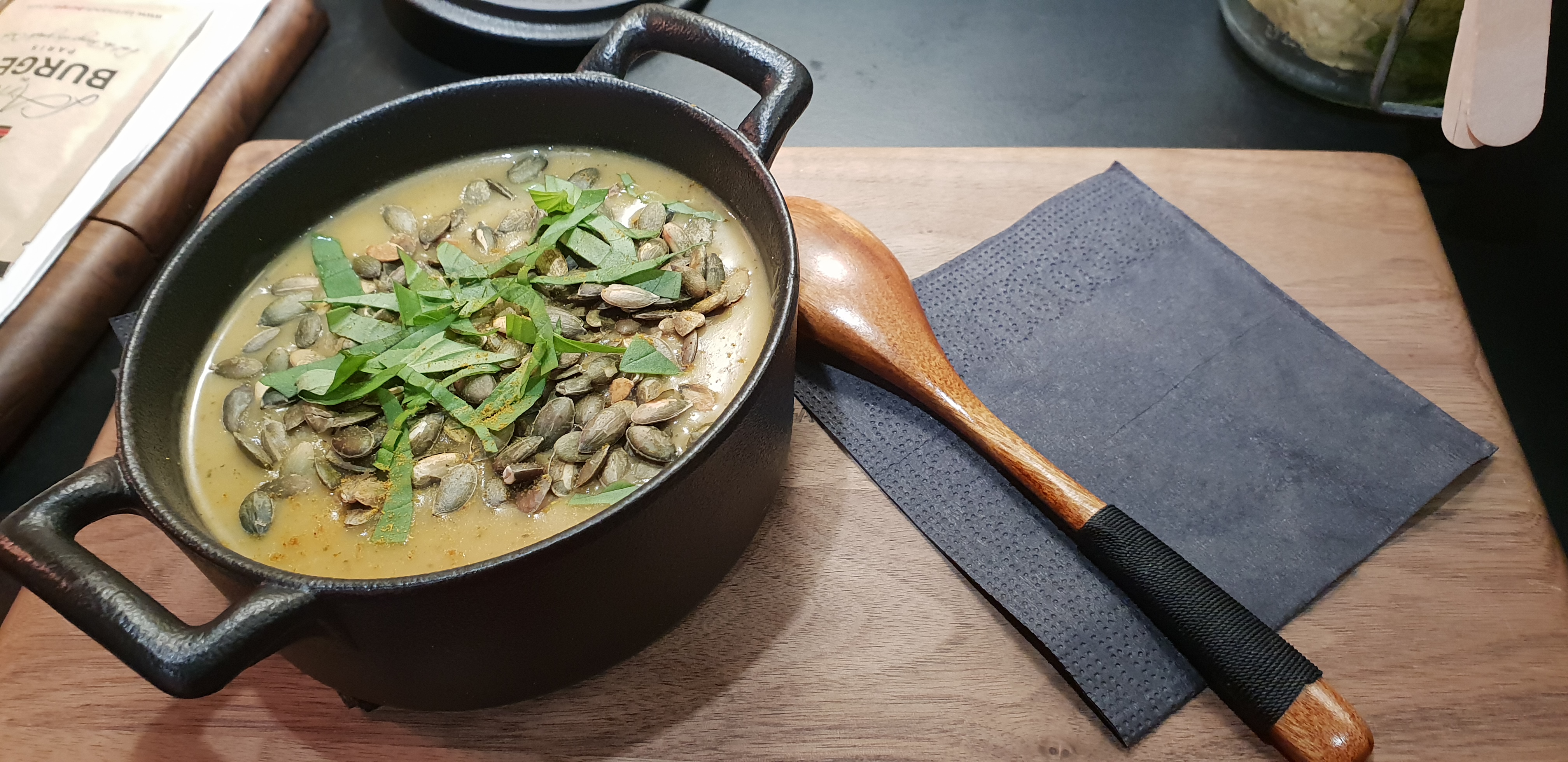 Menu soupe salade 9€, le choix des soupes est assez large pour un lieu qui est sensé être pour les amateurs de burgers. Merci d'offrir cette palette de choix en termes de soupes. La Bir Hakeim était super, les graines et épices un ++. Bemol au niveau de la salade, un petit pot avec quelques feuilles de salade et (comptées) 3 tomates cerises.