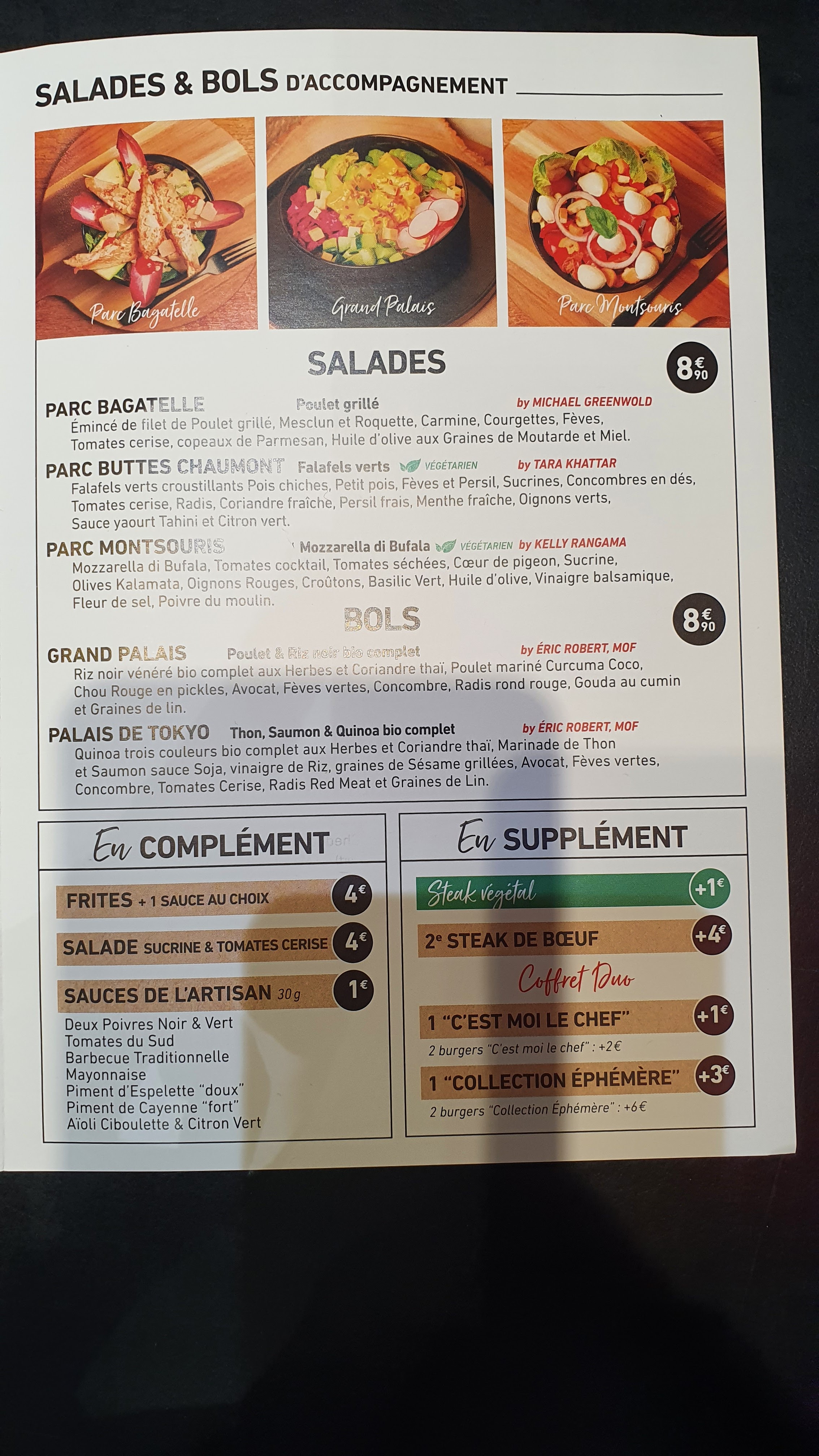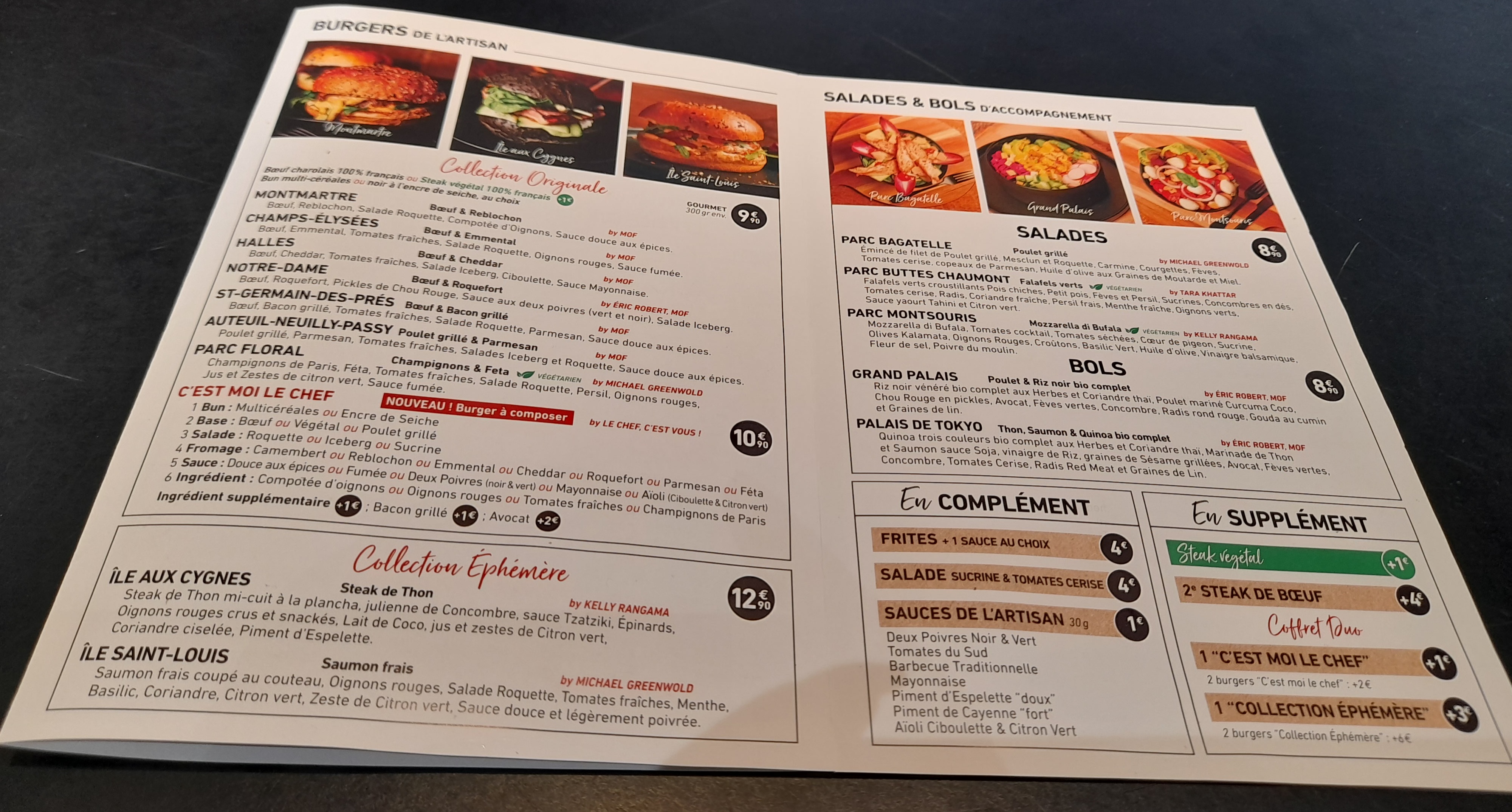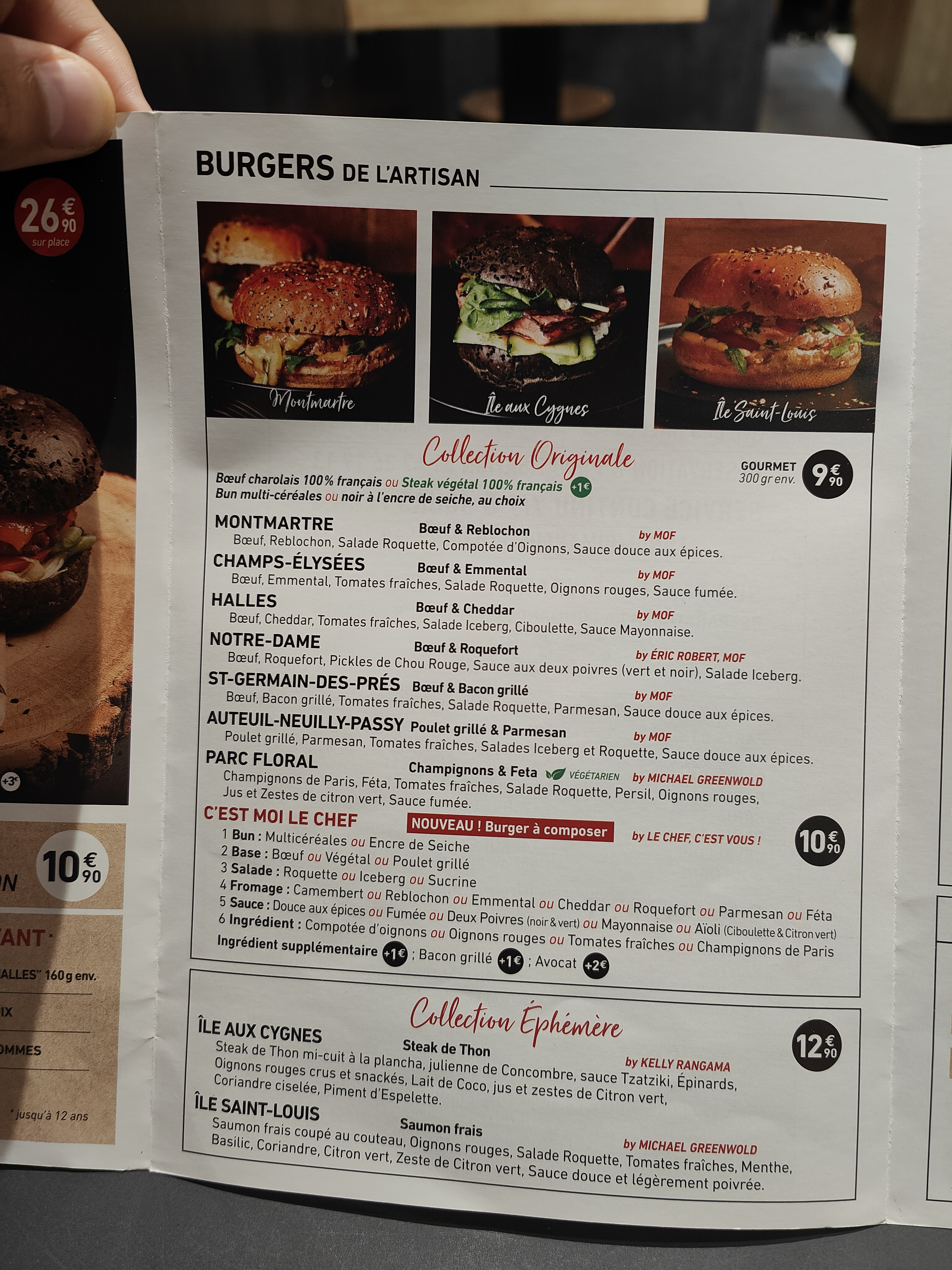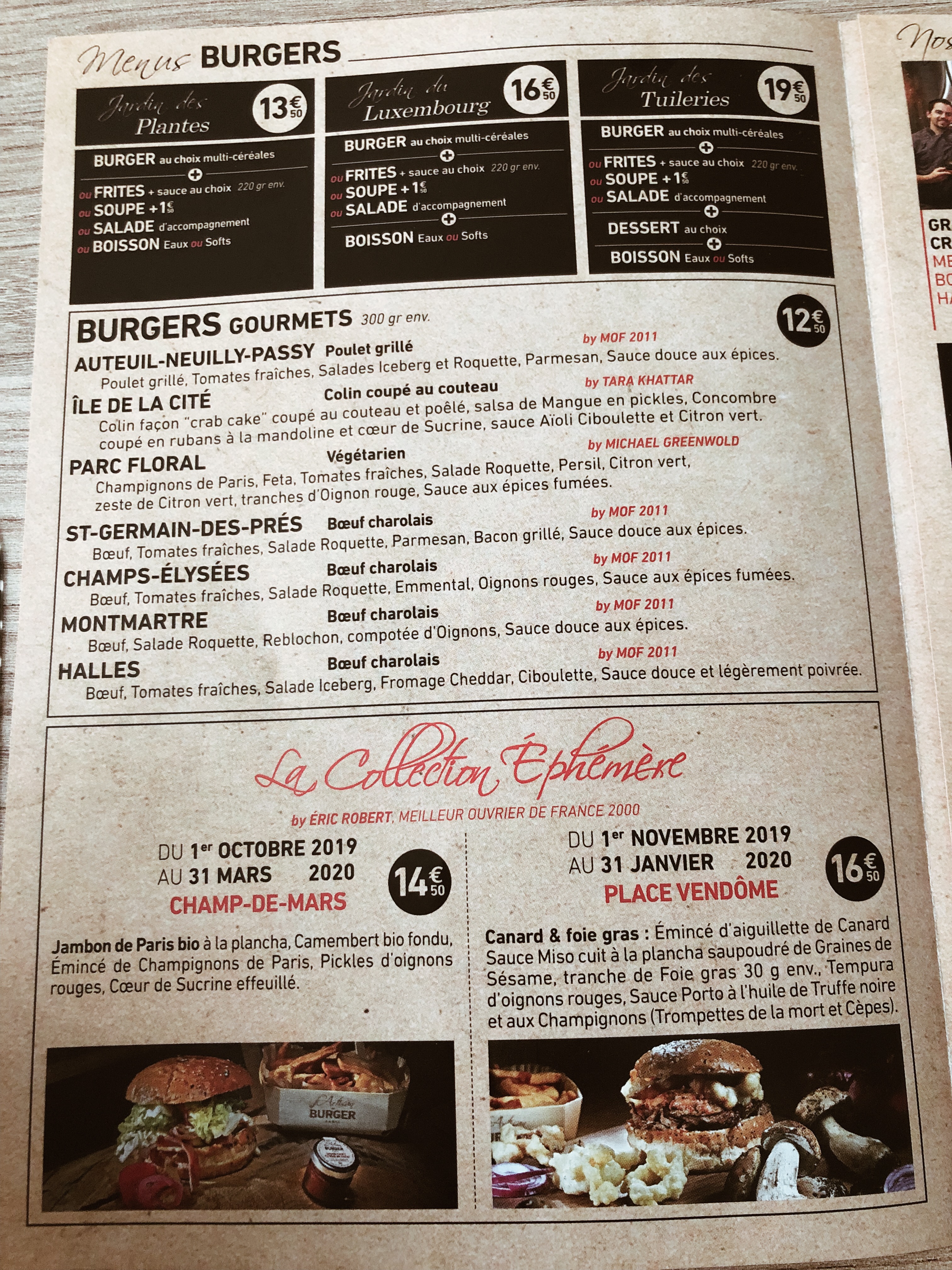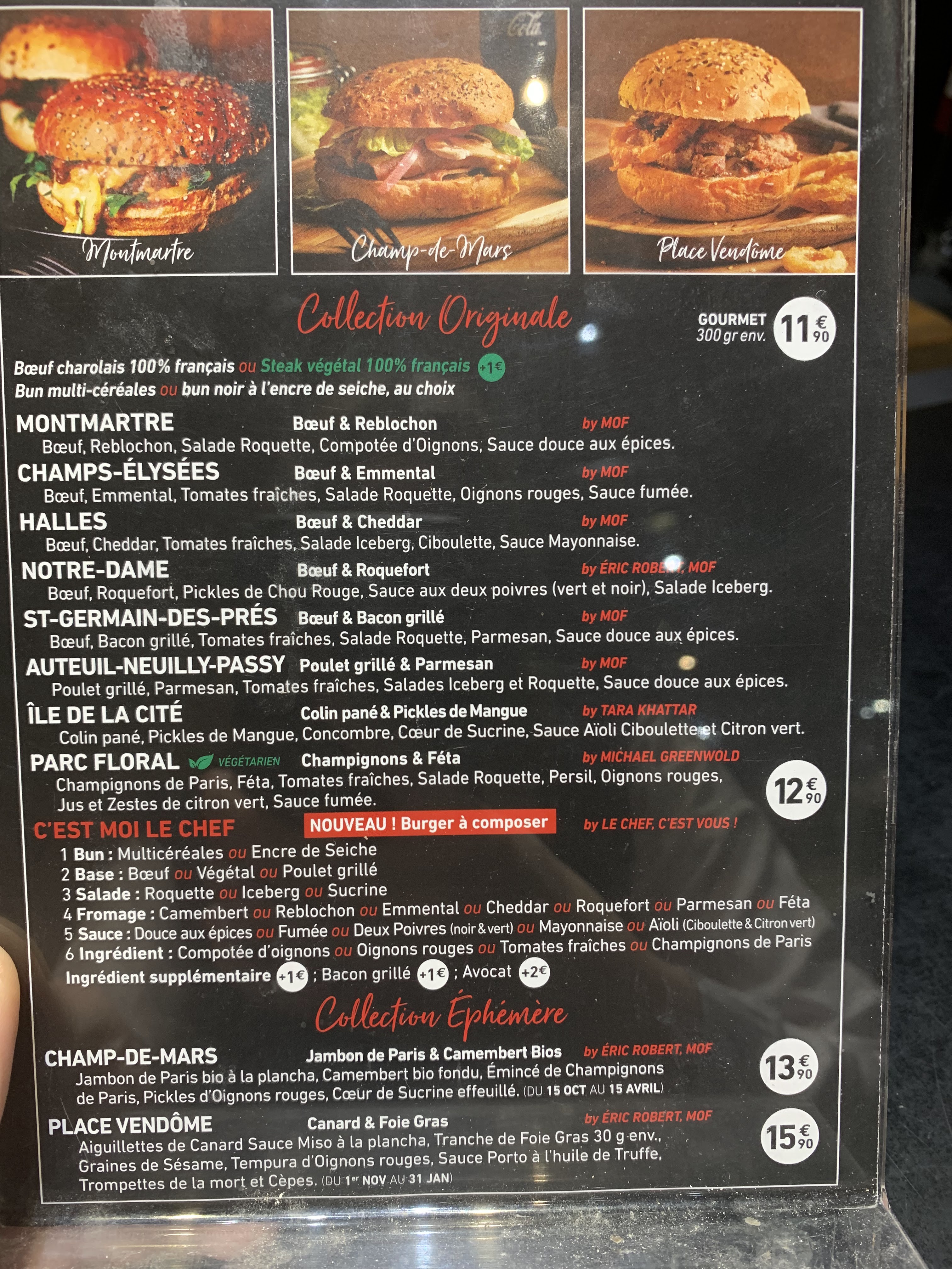 Plutôt décevant, les burgers n'ont pas vraiment d'intérêts. Et une communication très opaque : quand les chefs contributeurs ont le droit à un nom et une photo, le nom du chef principal n'est jamais indiqué, et sa photo est coupée en 2 comme pour éviter qu'on ne le reconnaisse. Très étrange !! Les Menus ont eux aussi aucun intérêt, si vous prenez l'option pour le menu supérieur, ils vous en reviendra le même prix que si vous prenez les éléments à la carte. On est ressorti avec la réelle sensation de s'être fait avoir...