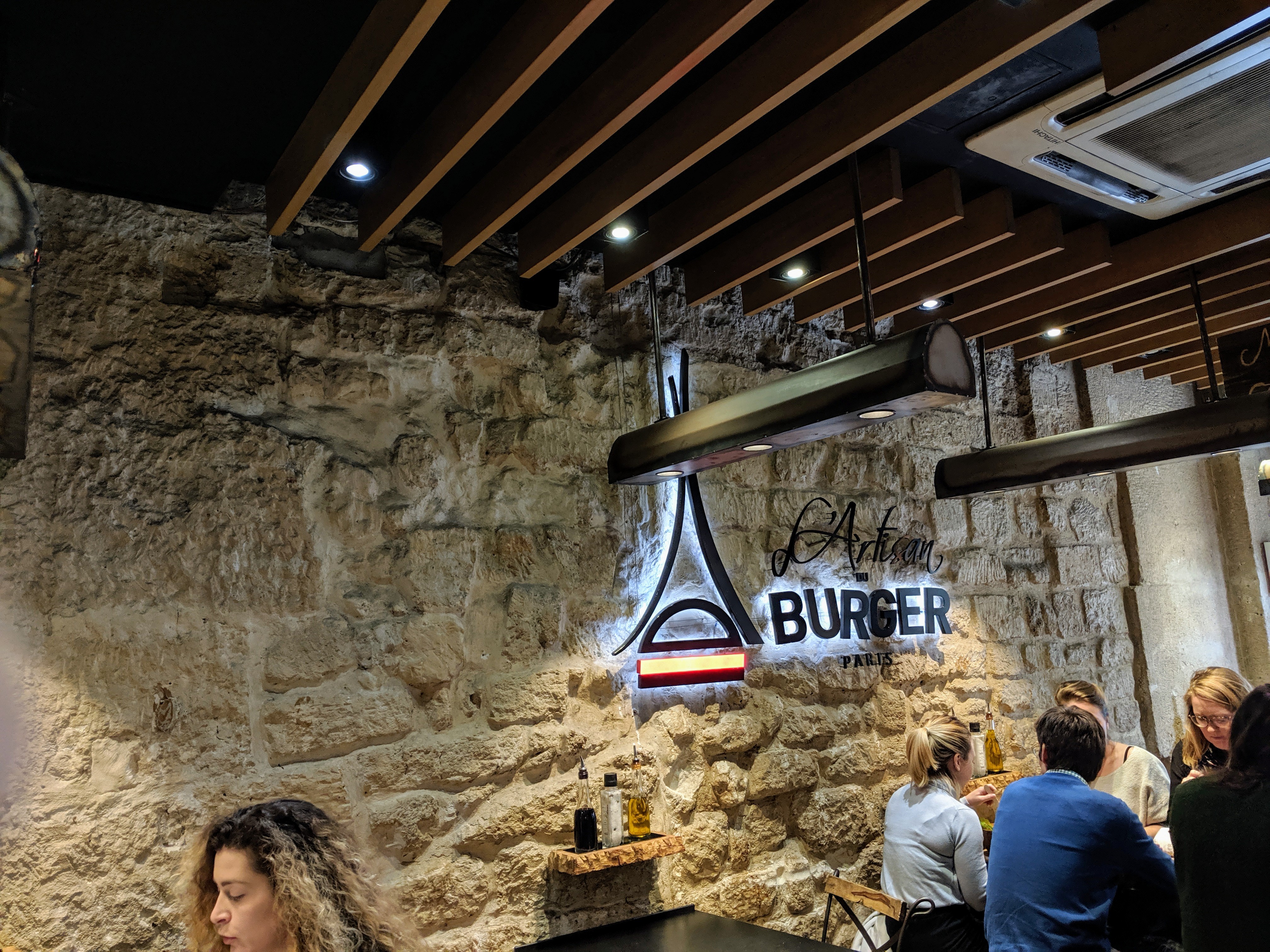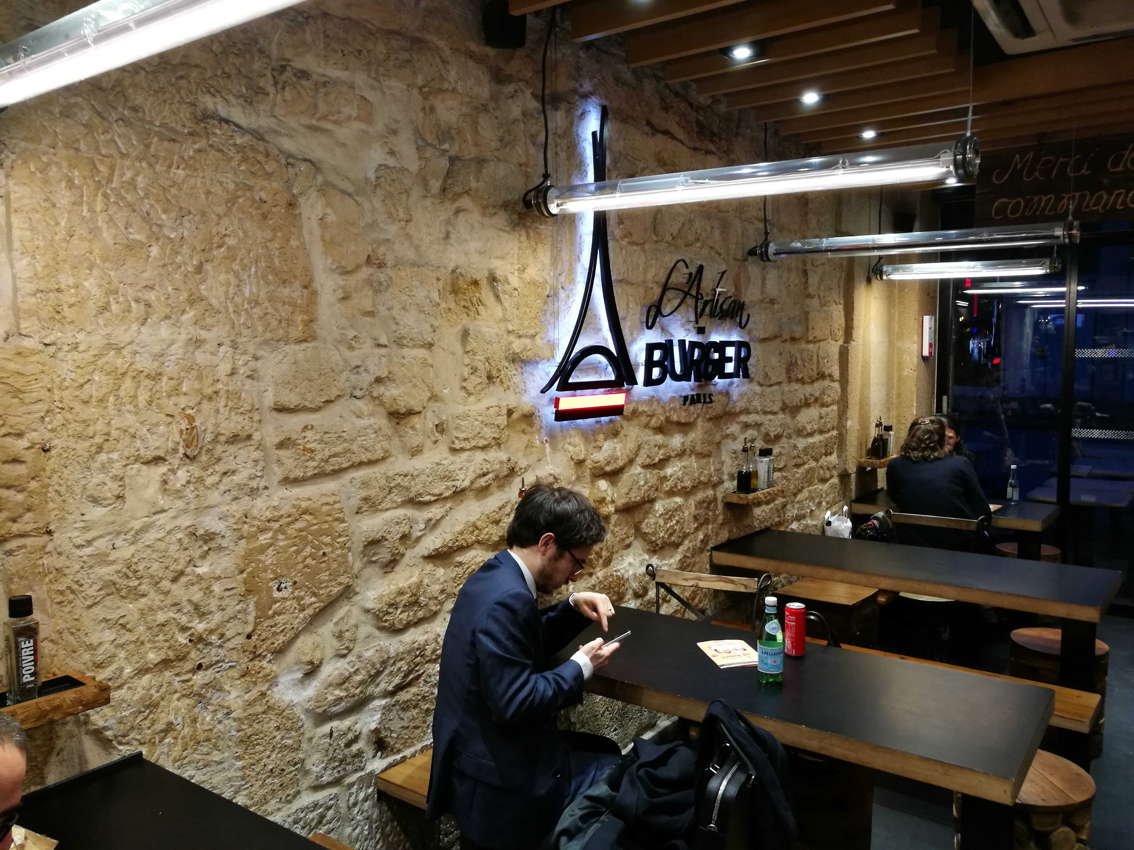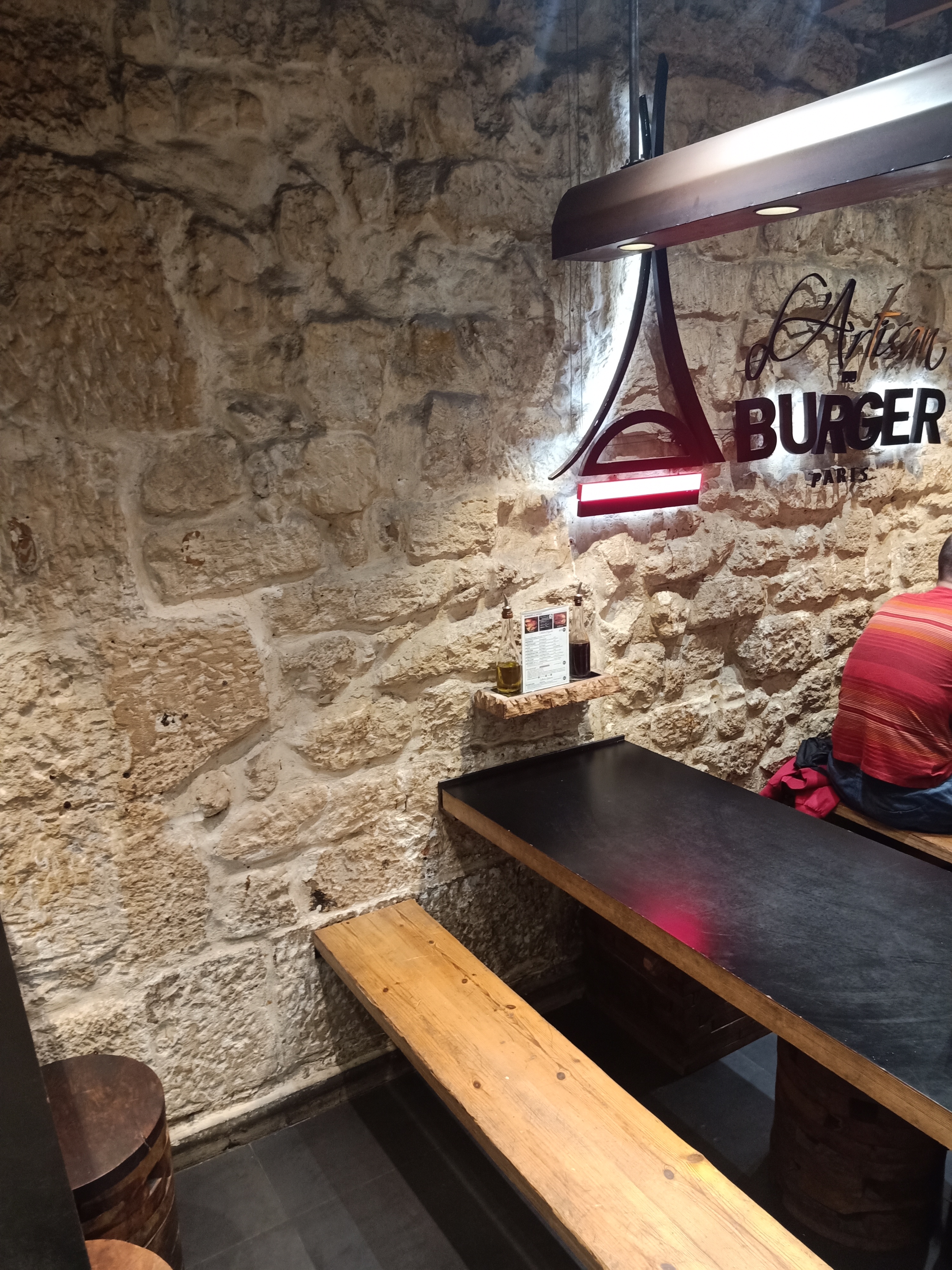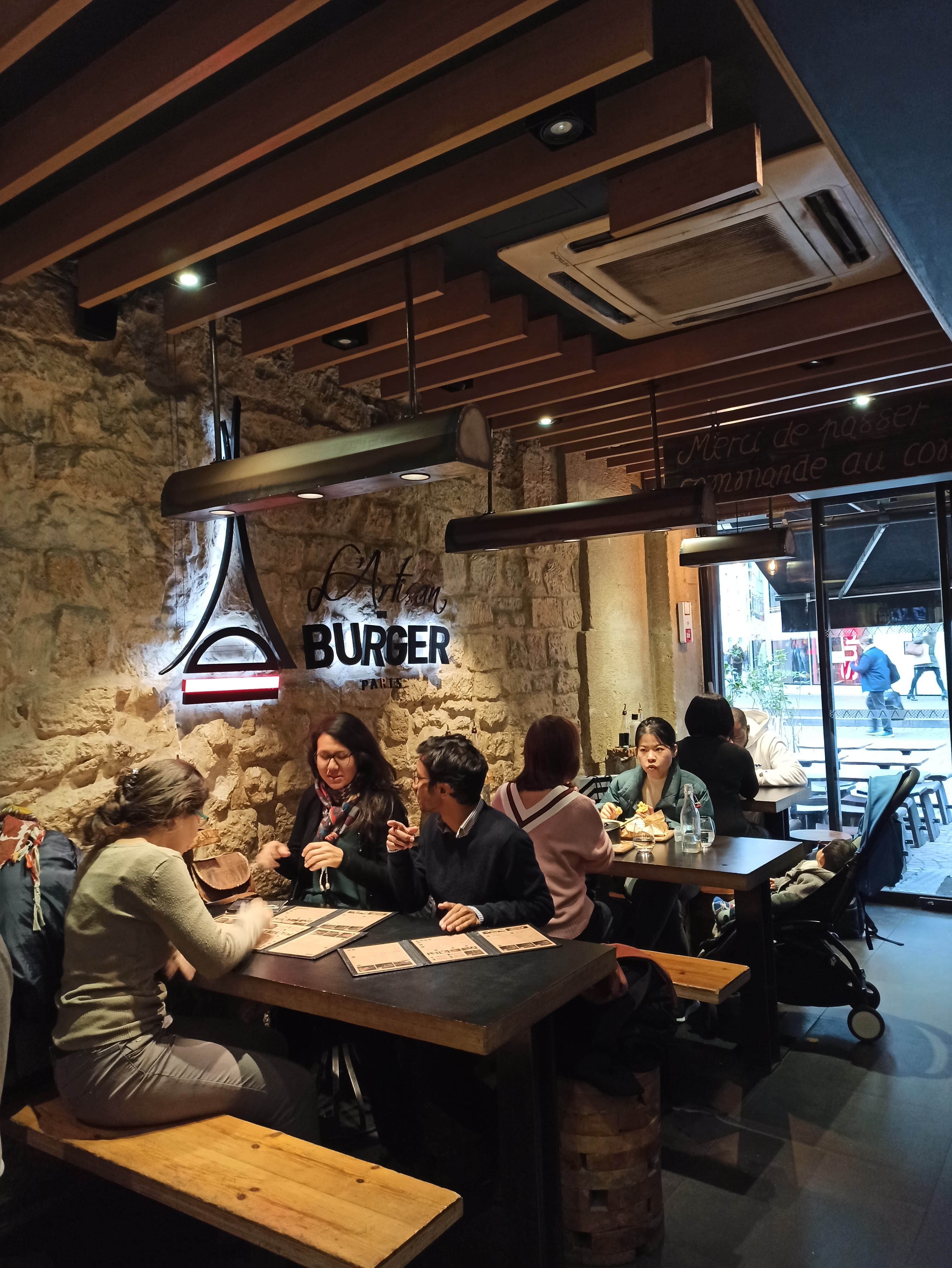 Après la (très bonne) découverte de l'Artisan du burger à Levallois, j'ai voulu faire découvrir ce restau à mes enfants en nous rendant à celui des Halles. Comparatif : Levallois : - on pait après le repas (un vrai service) - commande à table - couverts fournis - verre fourni - frites croustillantes - café offert Les Halles : - on pait au moment de la commande - la commande se fait comme au Mac Do en se rendant au comptoir. - pas de couvert - pas de verre, il faut boire à la canette - frites molles avec un cheveu trouvé dans le paquet - burger a priori identique (je n'ai pas pris le même) - j'ai du me lever pour commander un café (payant; ce qui est normal). Conclusion : Excellent à Levallois, médiocre aux Halles.
