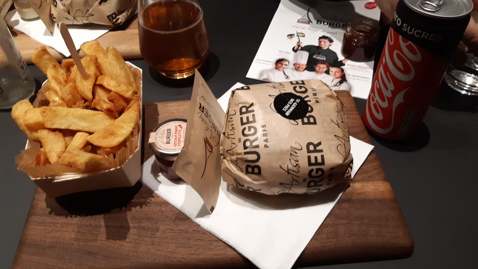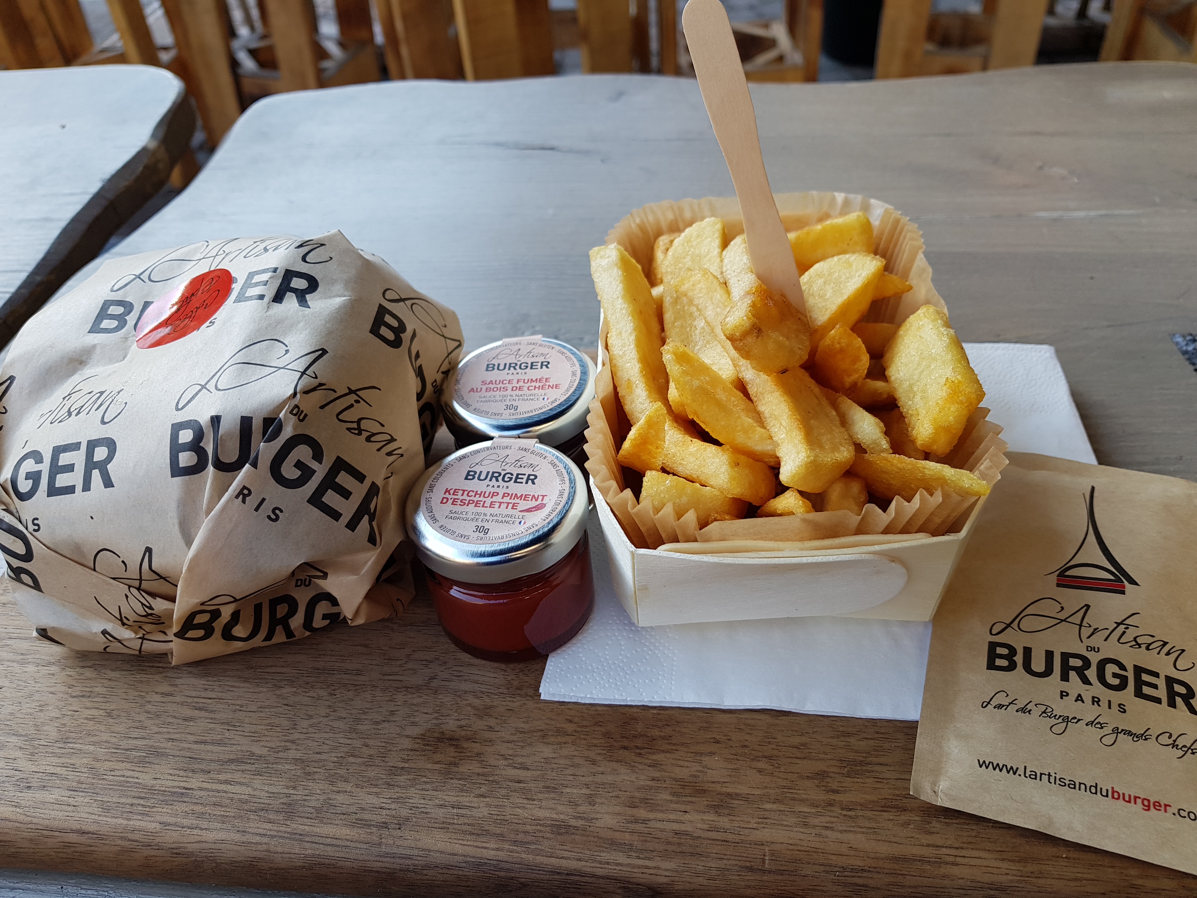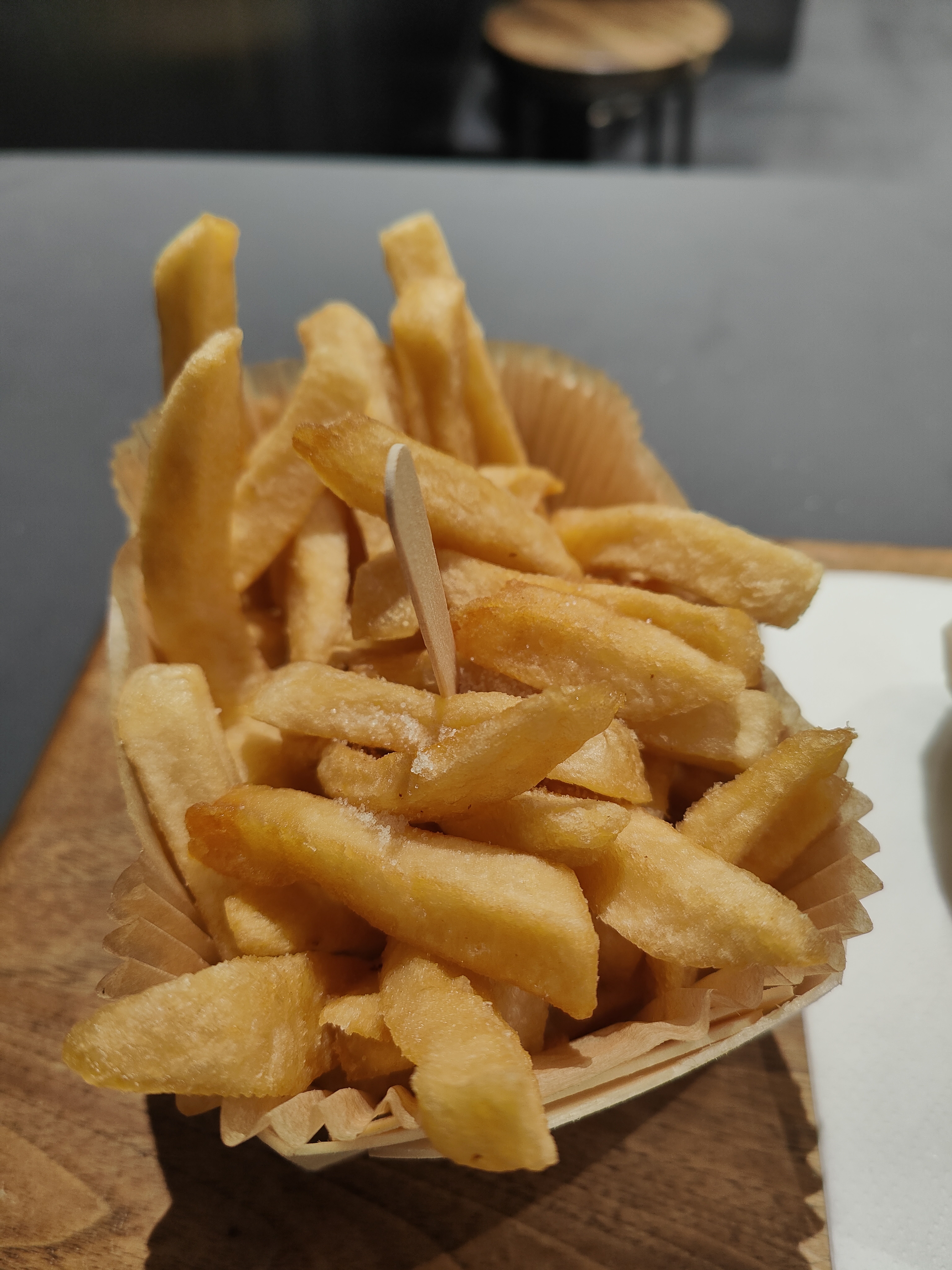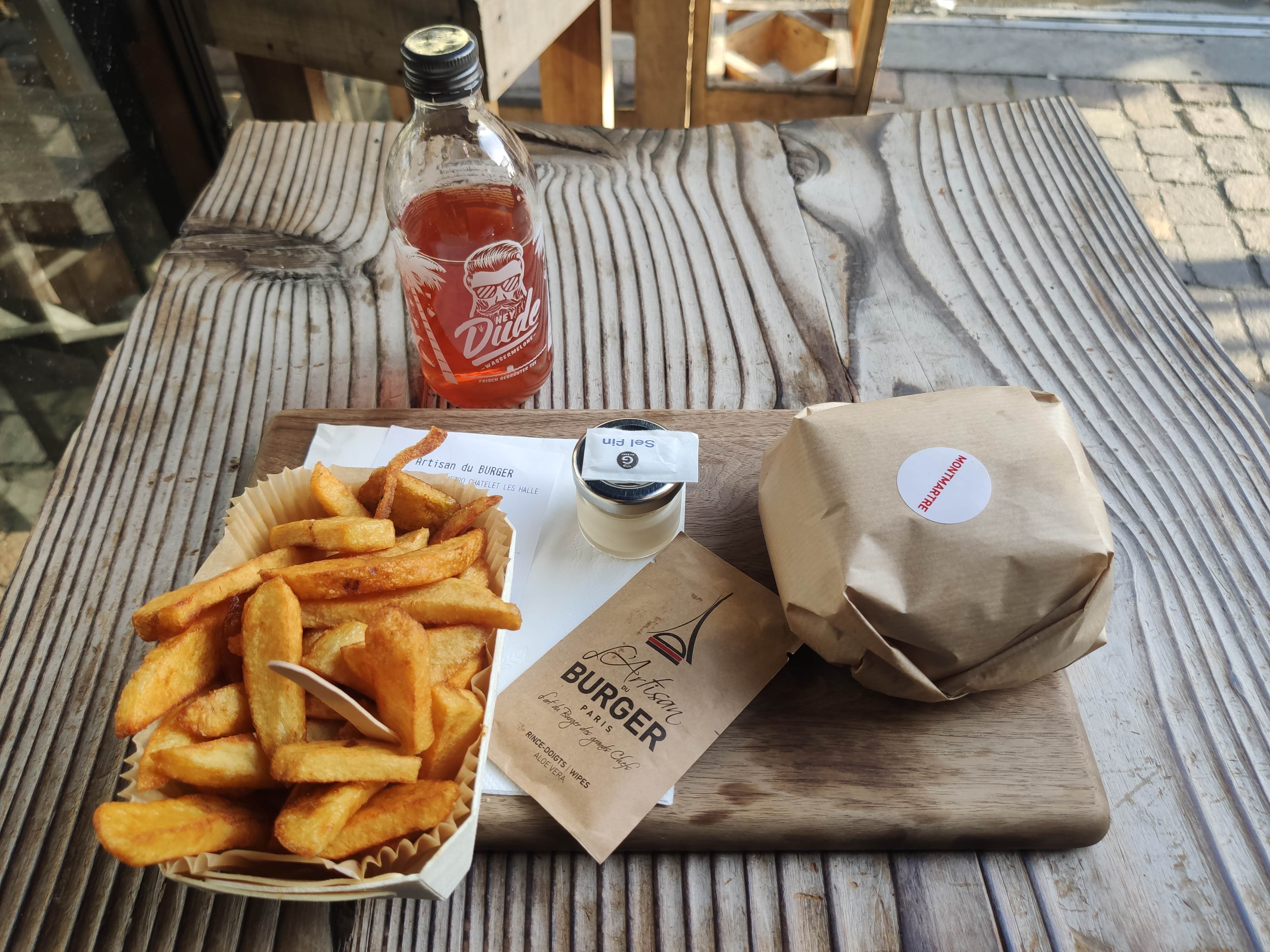 J'ai pris le menu burger Champs Élysées avec frites et un bière blanche locale. Le burger n'avait pas vraiment de saveur. La viande est réputé fraiche, mais n'apporte aucune plus value, pas de sauce. Les frites sont présentées dans une barquette en bois, elles ont le goût de surgelées. Un petit pot de sauce barbecue les accompagnait, mais cette sauce est trop sucrée à mon sens. Le tout est bien mis en valeur, le local est un petit peu petit mais déco sympa, mais on reste sur du burger, et un burger doit avoir du goût avant tout. Donc bof....