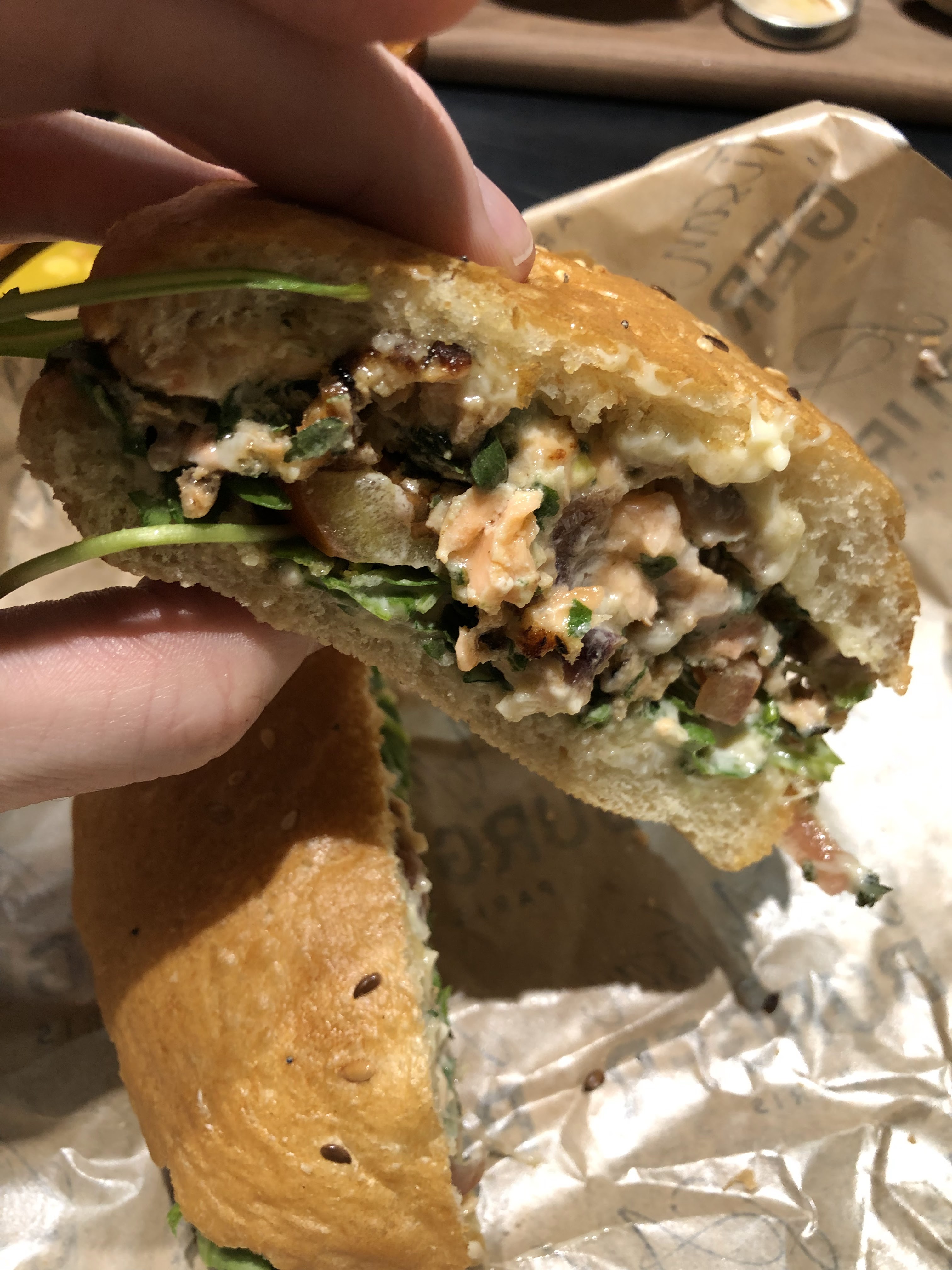 Bon mais sans plus. Le Burger était assez sec. Le thon était dur à mâcher, il y avait pas assez de sauce et il manquait la coriandre. La salade était composée de petites feuilles blanches et jaune. Il y avait peu de feuilles vertes. Les petites tomates n'avait pas de goût. Bref un peu déçu.