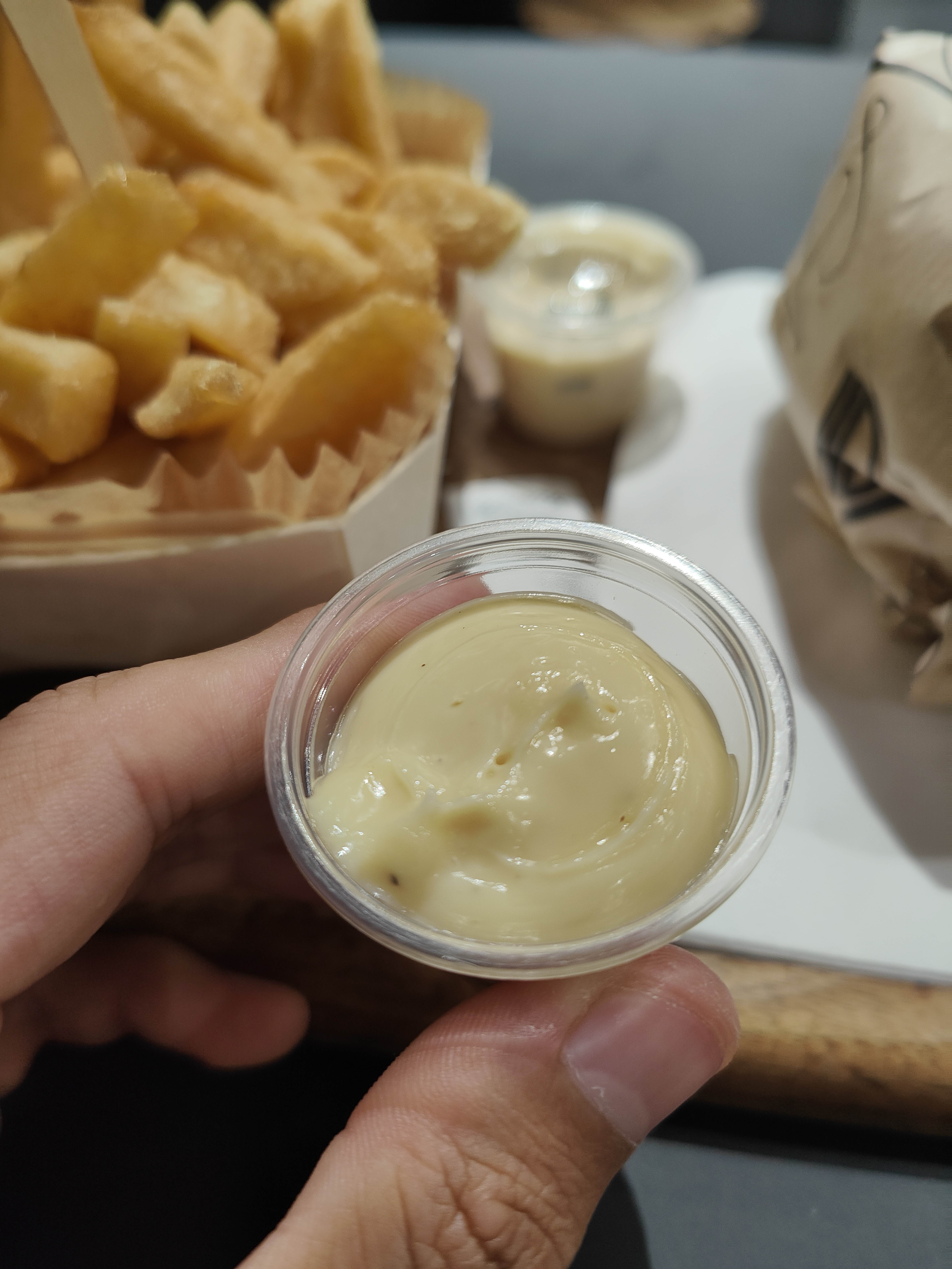 Les petites sauces sont justes divines et pour moi ce fut burger végétarien avec frites maison.... un régale et j'ai bcp apprécié la lingette pour nettoyer les doigts ... je recommande vivement ! En tt cas je reviendrai