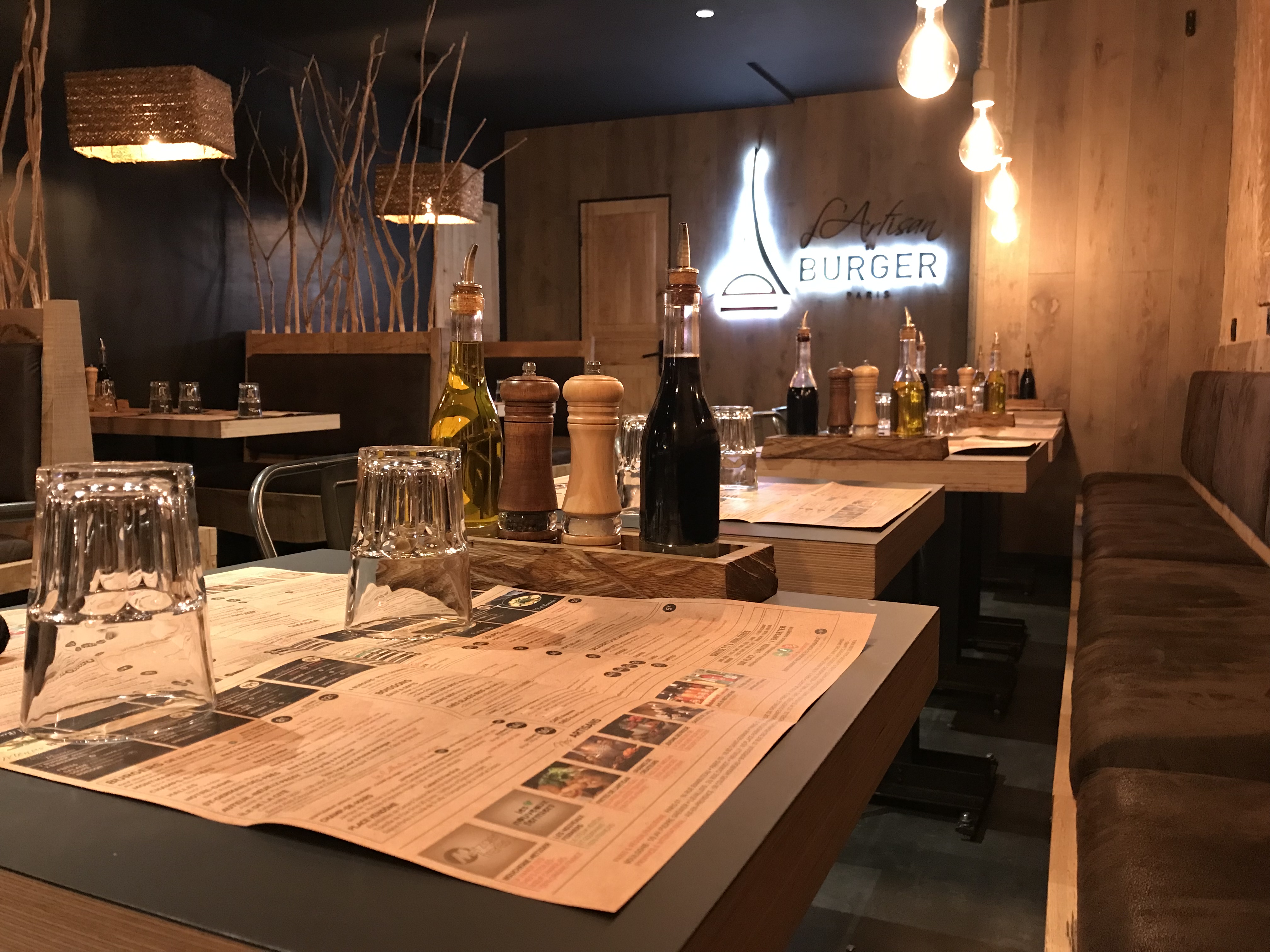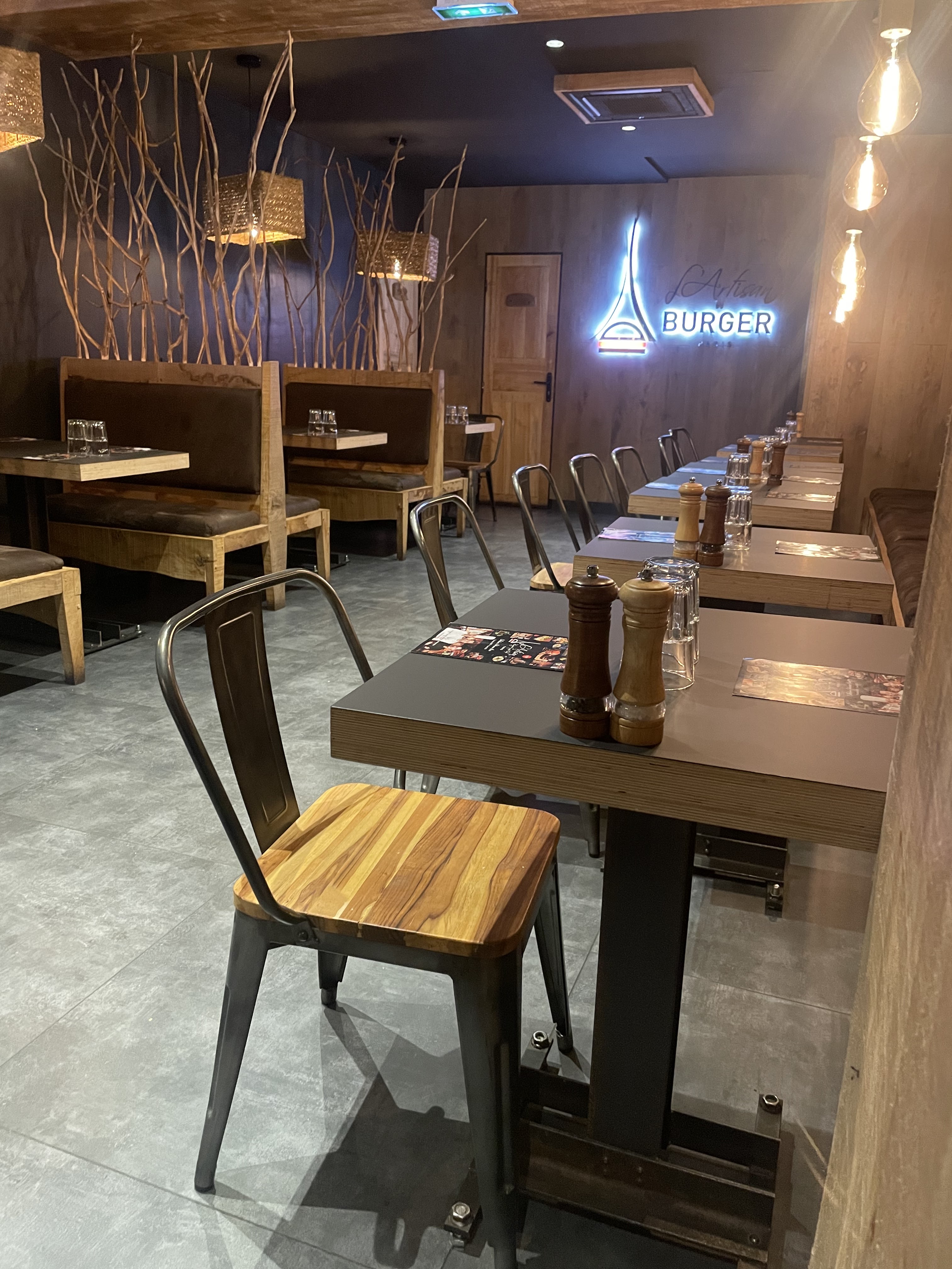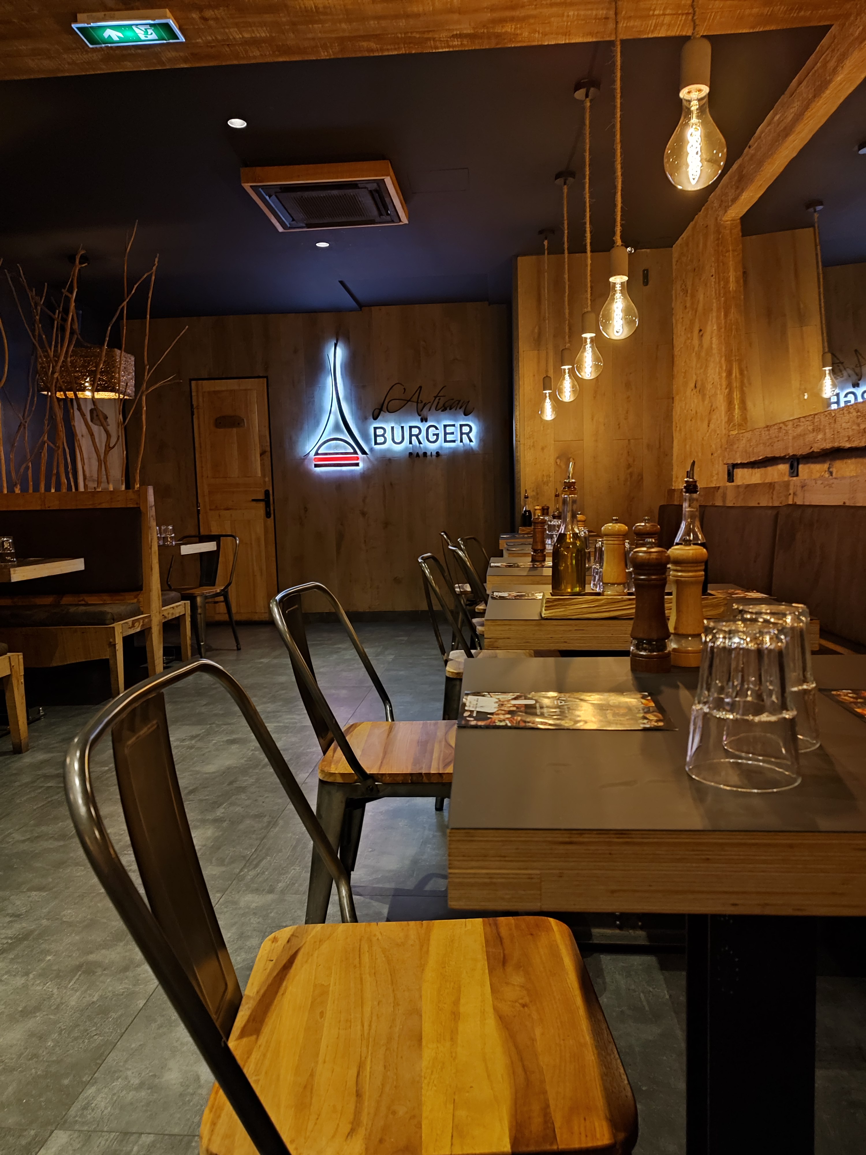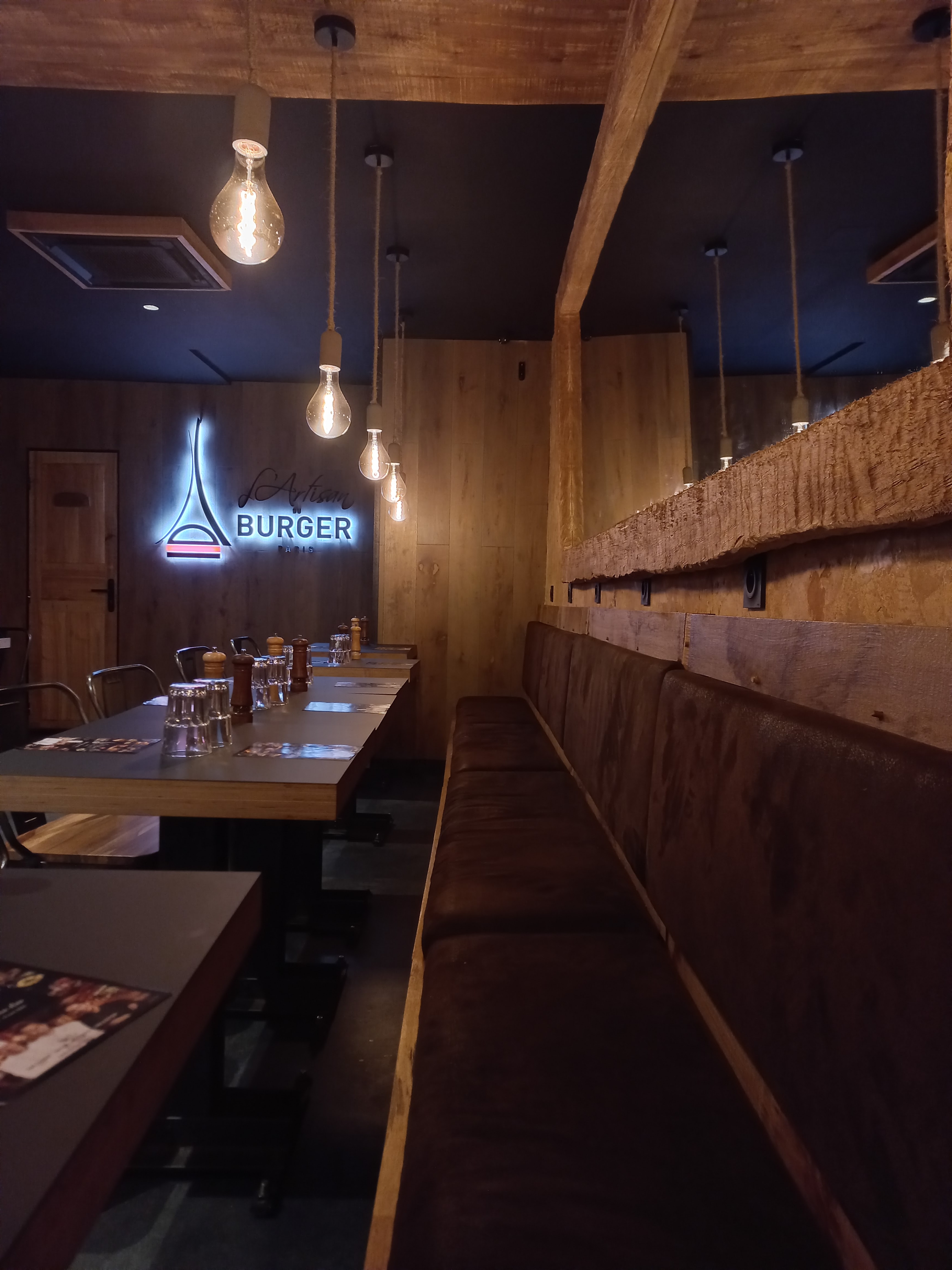 Cadre à améliorer ! Manque d'éclairage à l'intérieur (travaux en cours vu les fils électriques apparents), carton empilé, palette, planche de bois entassé. Les burgers étaient très bon, il mérite très bien son nom de l'artisan du burger ! Un seul burger au poulet en espérant en avoir d'autres. Celui au saumon c'est une tuerie 🤣! Sinon dans l'ensemble un personnel accueillant et à l'écoute. De la cuisine à la salle. 👍🏾