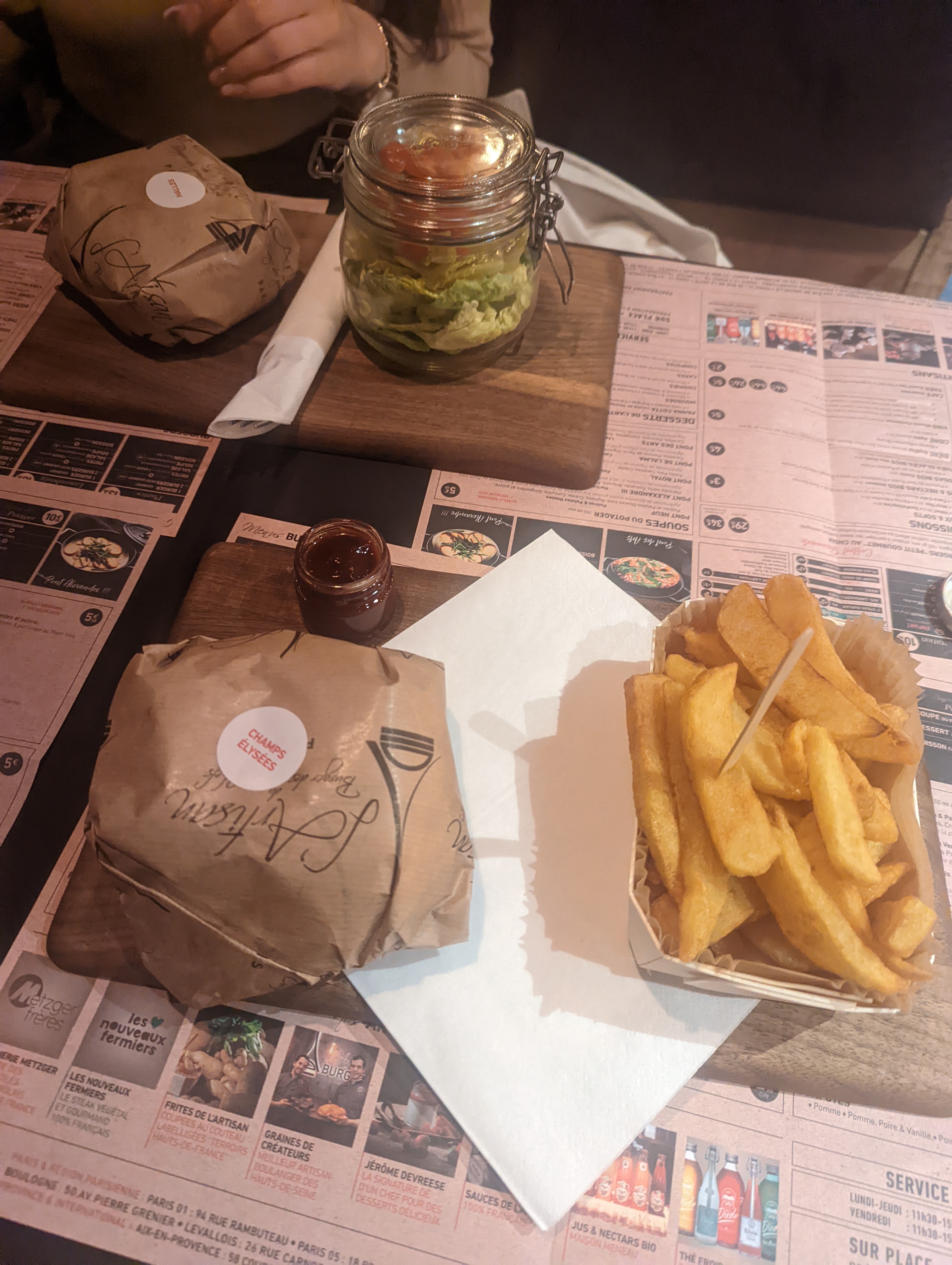 Je suis allé à la fête d'anniversaire d'un ami. J'étais reconnaissant que le personnel soit si sympathique et m'a aidé à préparer la fête d'anniversaire. Deux d'entre nous ont choisi le set comprenant deux hamburgers et deux frites. Le burger Notre-Dame et le burger Montmartre étaient délicieux. Je ne mange généralement pas de hamburgers, mais je pense que j'y retournerai la prochaine fois.