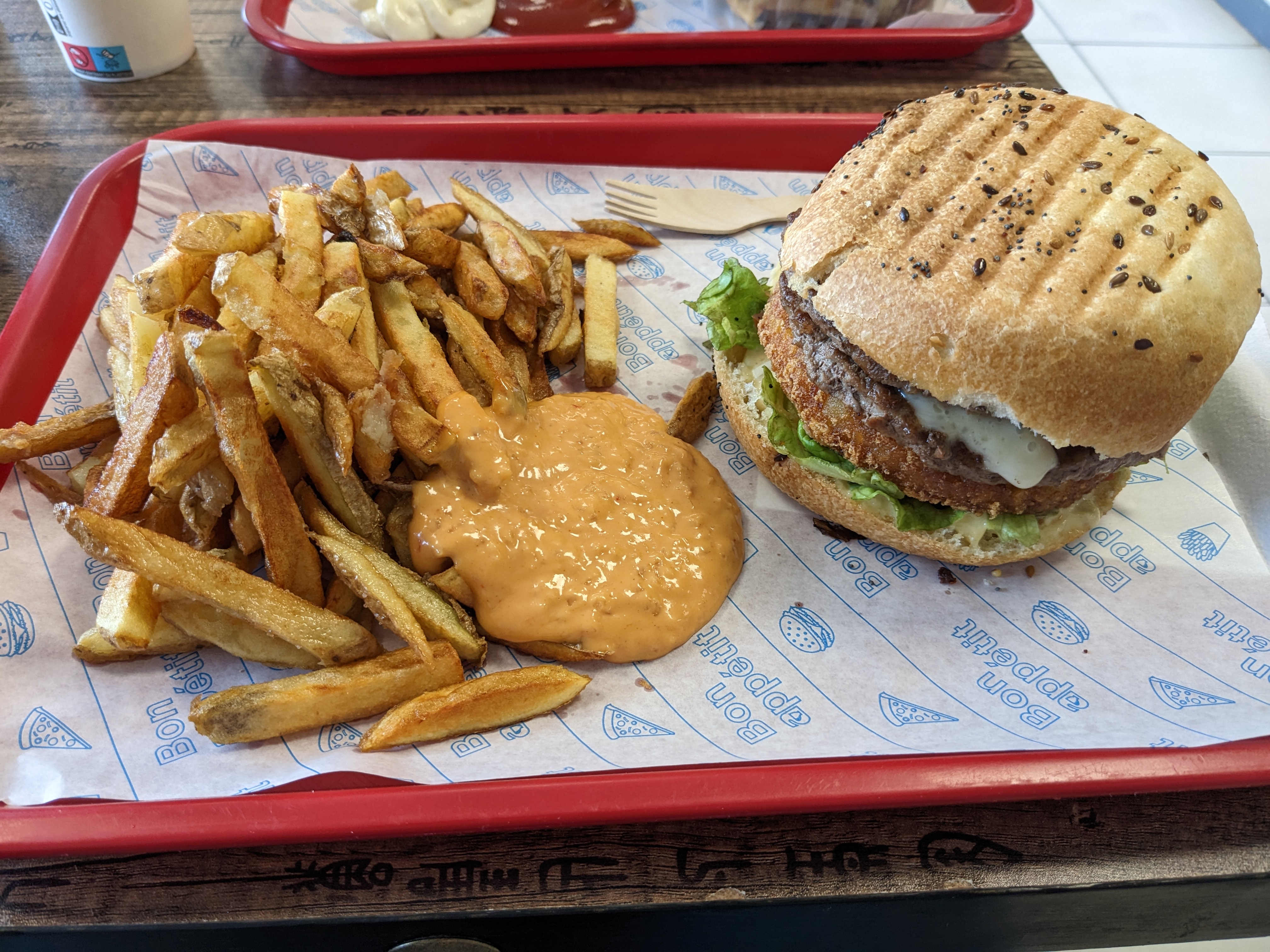 Pris à 2 reprises, vrais bons burgers et très bonnes frites! Je recommande !