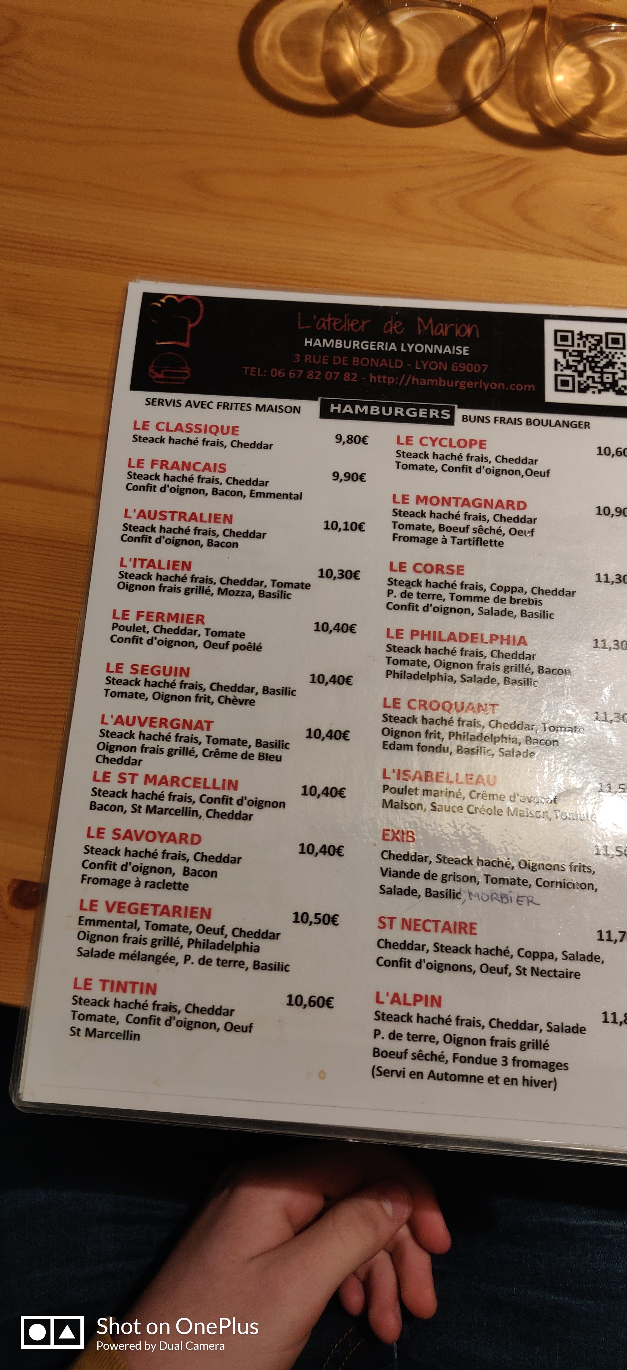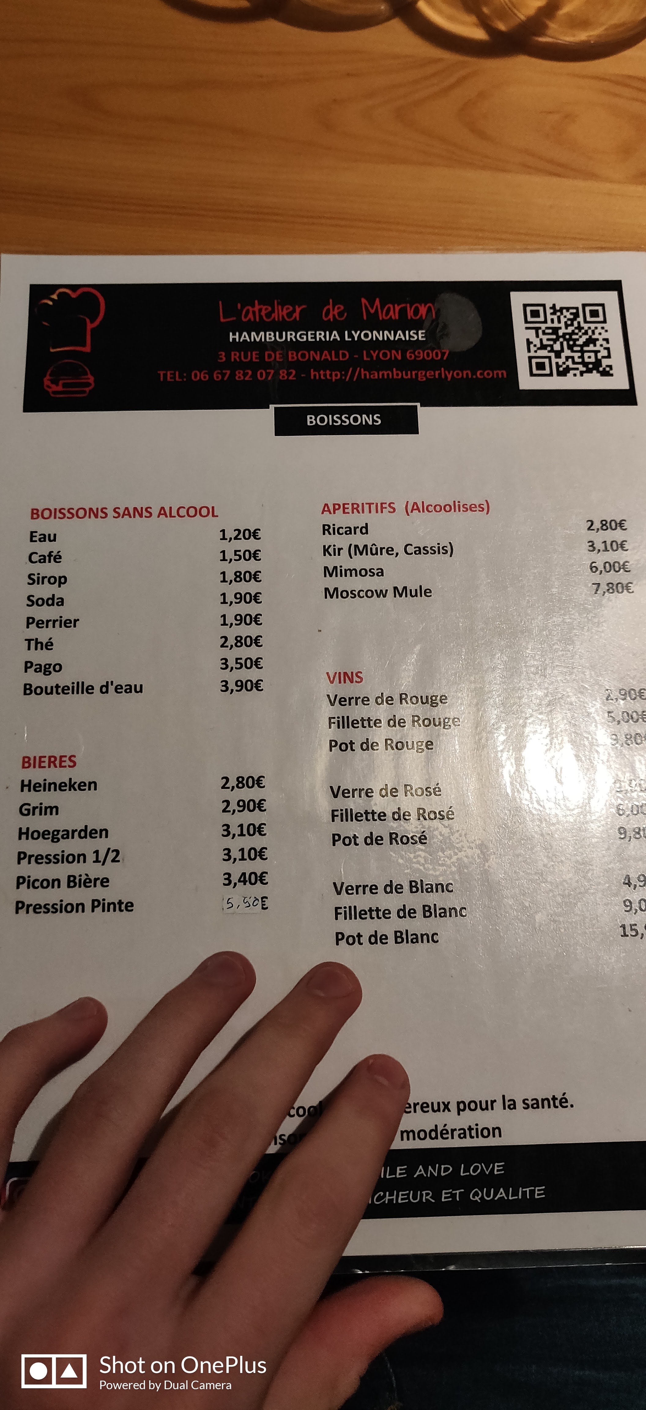 Bien qu'assez confidentielle, cette échoppe est une des meilleures adresses burger de Lyon. Un accueil sympa, un service au poil, un choix de dingue, un burger goûtu, des frites maisons (et oui, ça se perd) et tout ceci à prix raisonnable. Que demande le peuple ? Mince, déjà victime de son succès, l'Atelier va se retrouver avec de nouveaux clients !! Longue vie à cet Atelier magique ! ========== Autre avantage : service possible jusqu'à 22h00. Un grand merci 👍😊