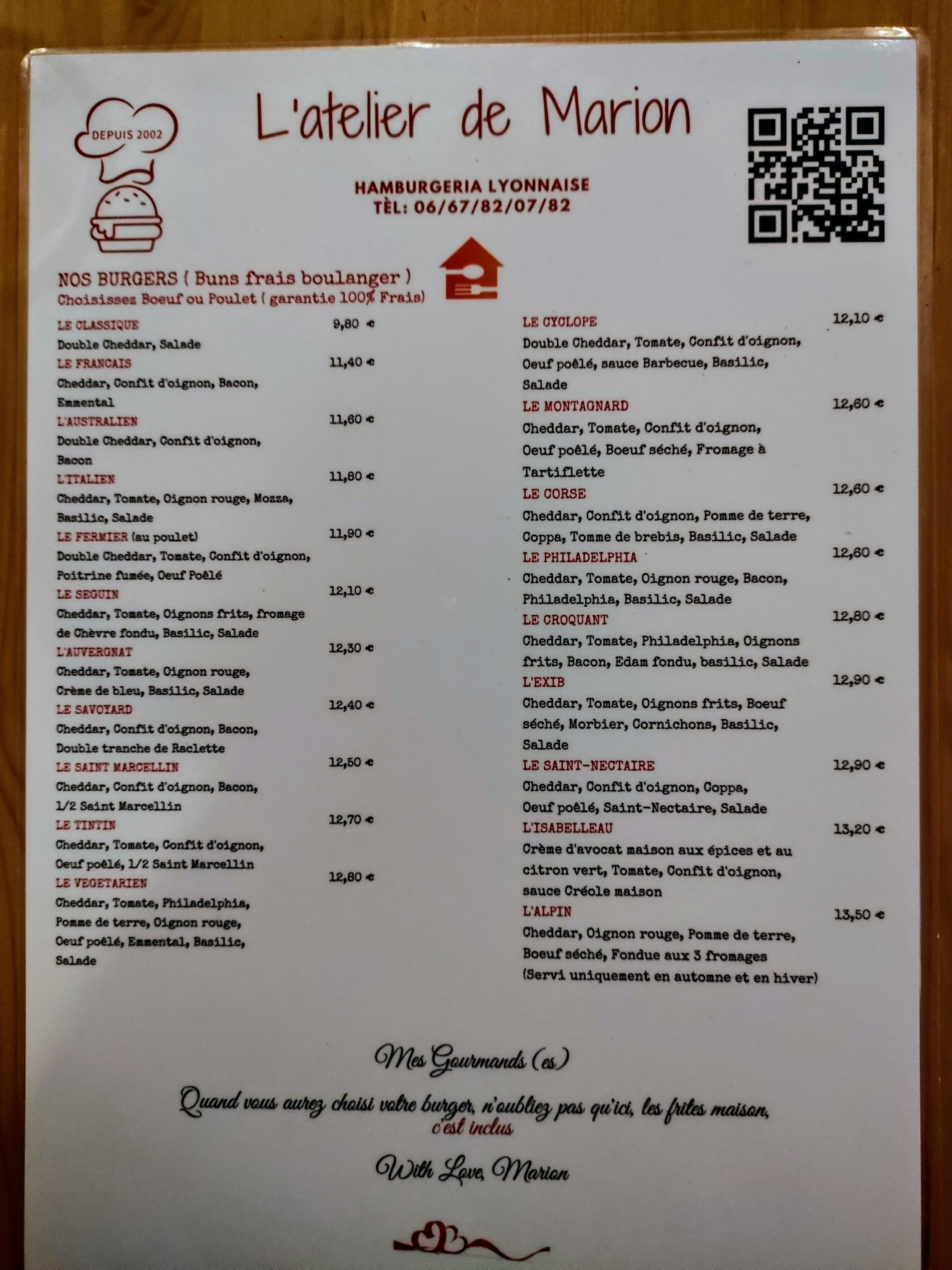 Expérience unique chez Marion. Les Burgers sont fantastiques et le service au top ! On se sent comme à la maison. Je recommande 😍😍😍