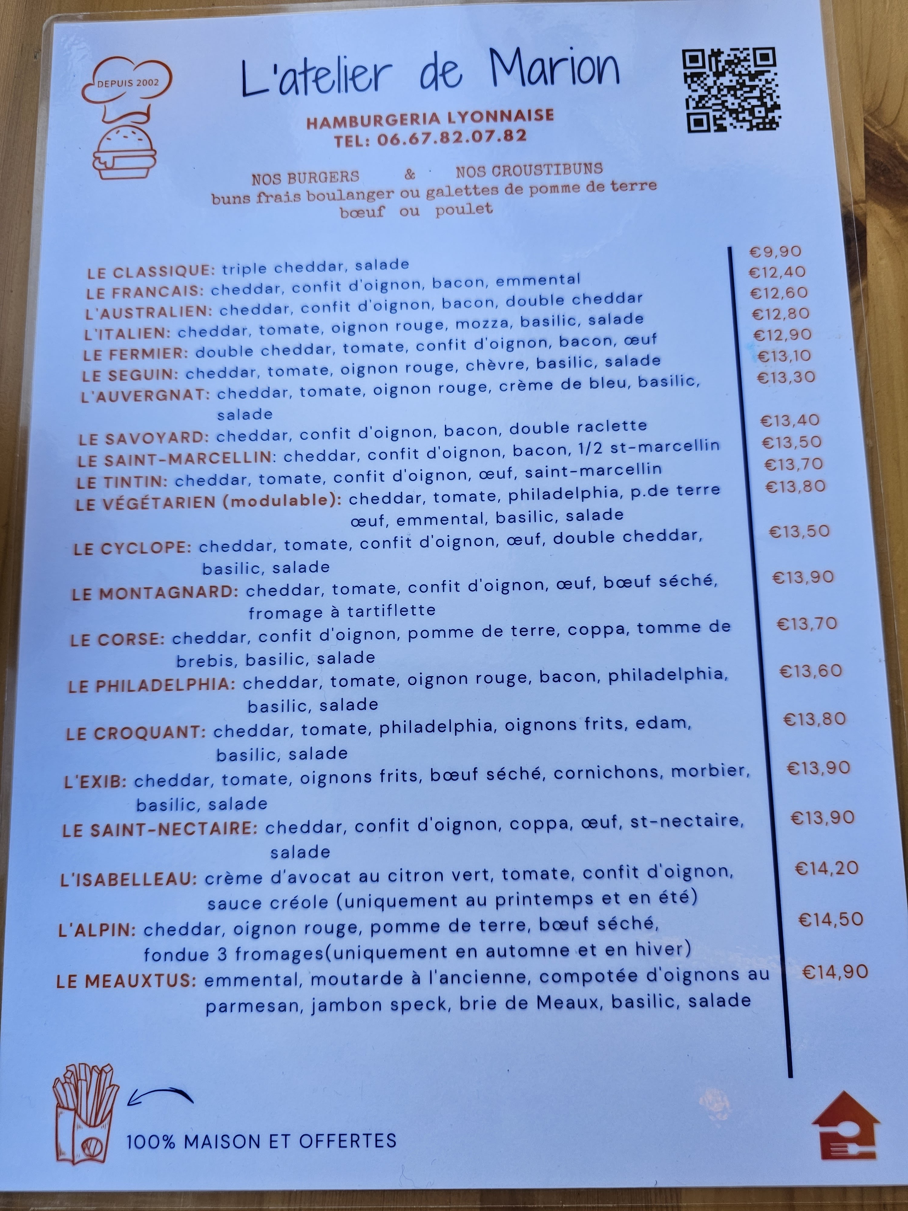 J’aime beaucoup les burgers de Marion, ils sont tous différents et ont chacun leur originalité. On s’y sent comme à la maison. S’il y a du monde et que vous prenez en emporter, pensez à appeler pour passer commande en avance En espérant que mon avis aide.