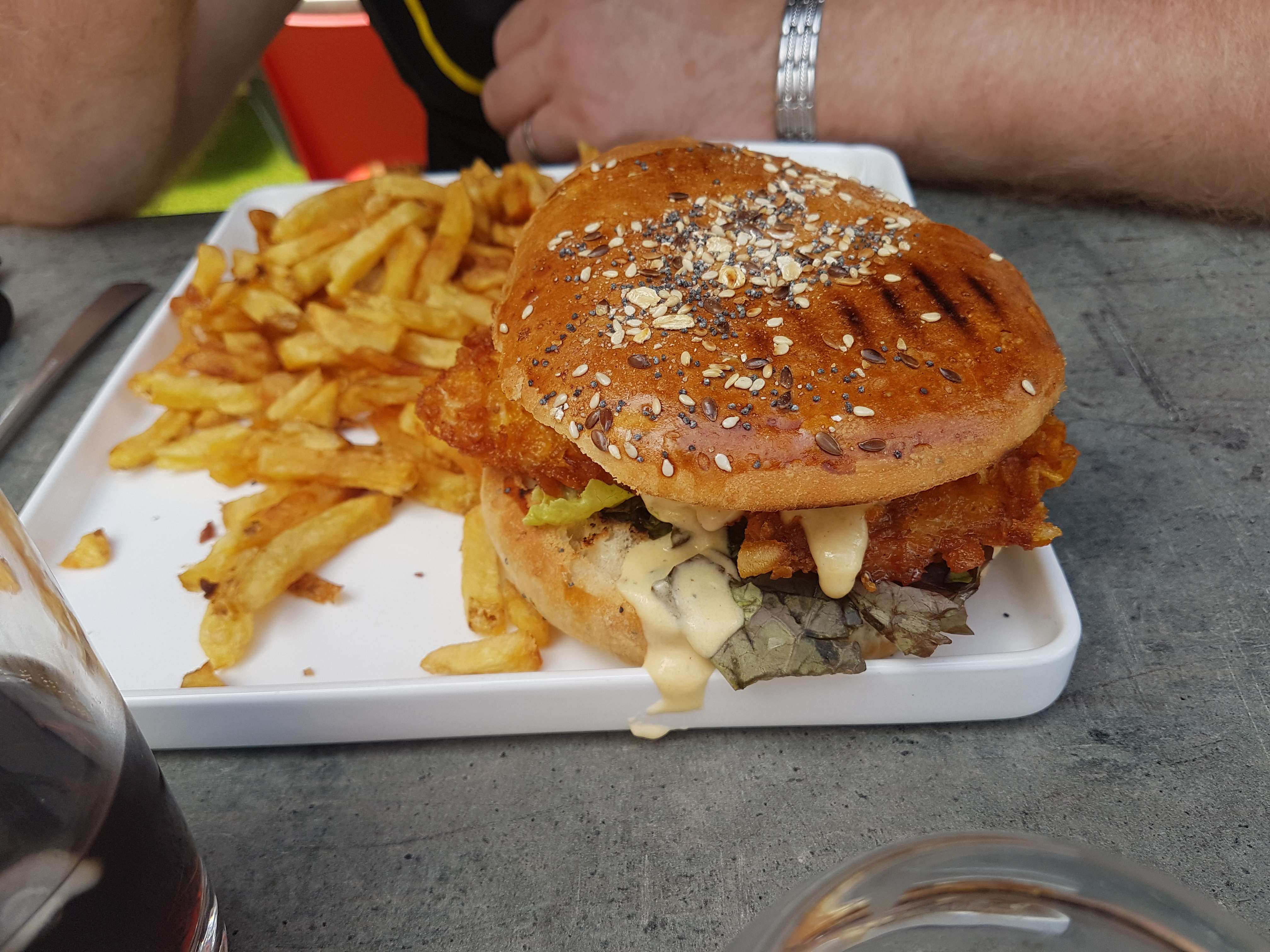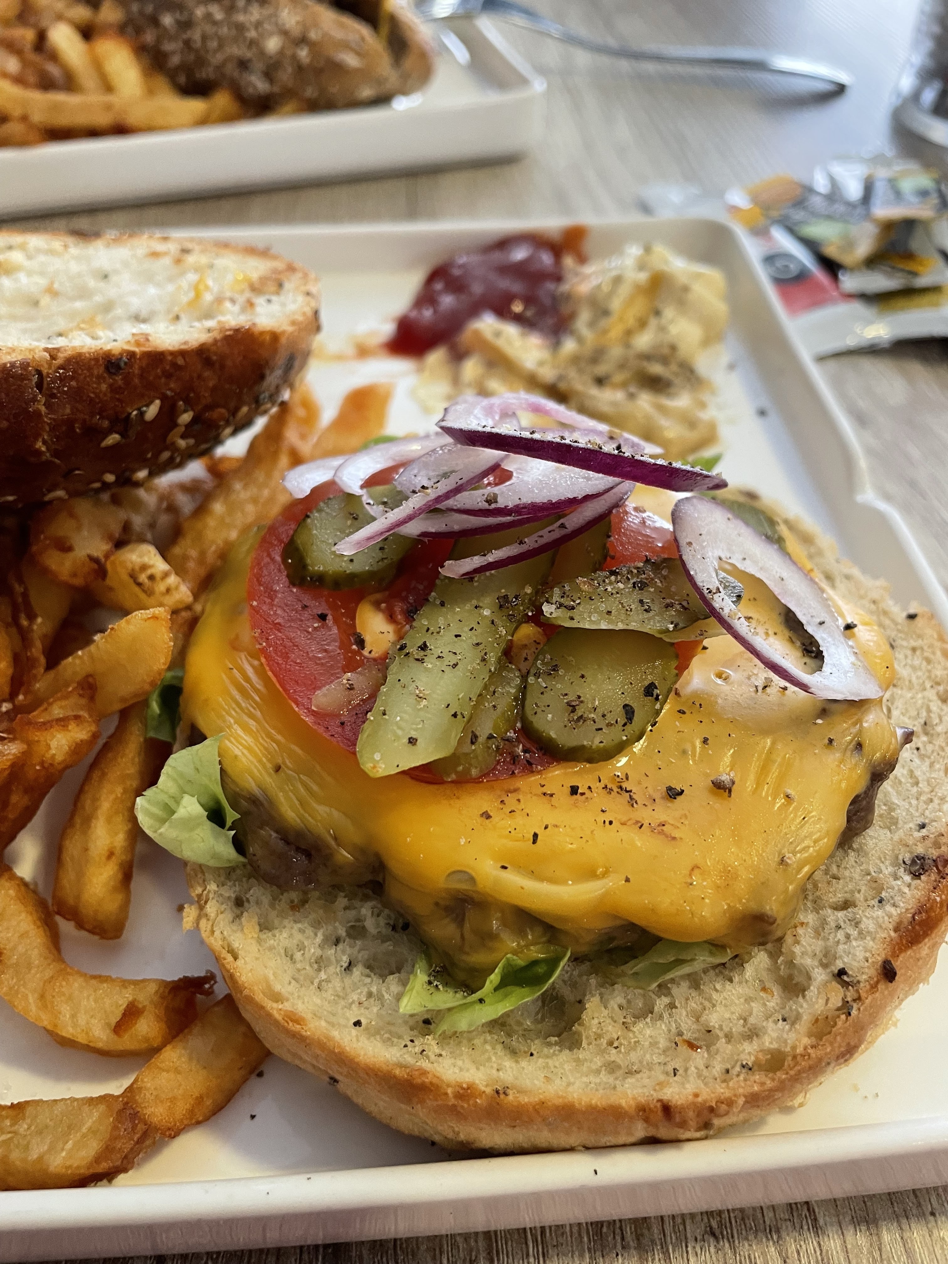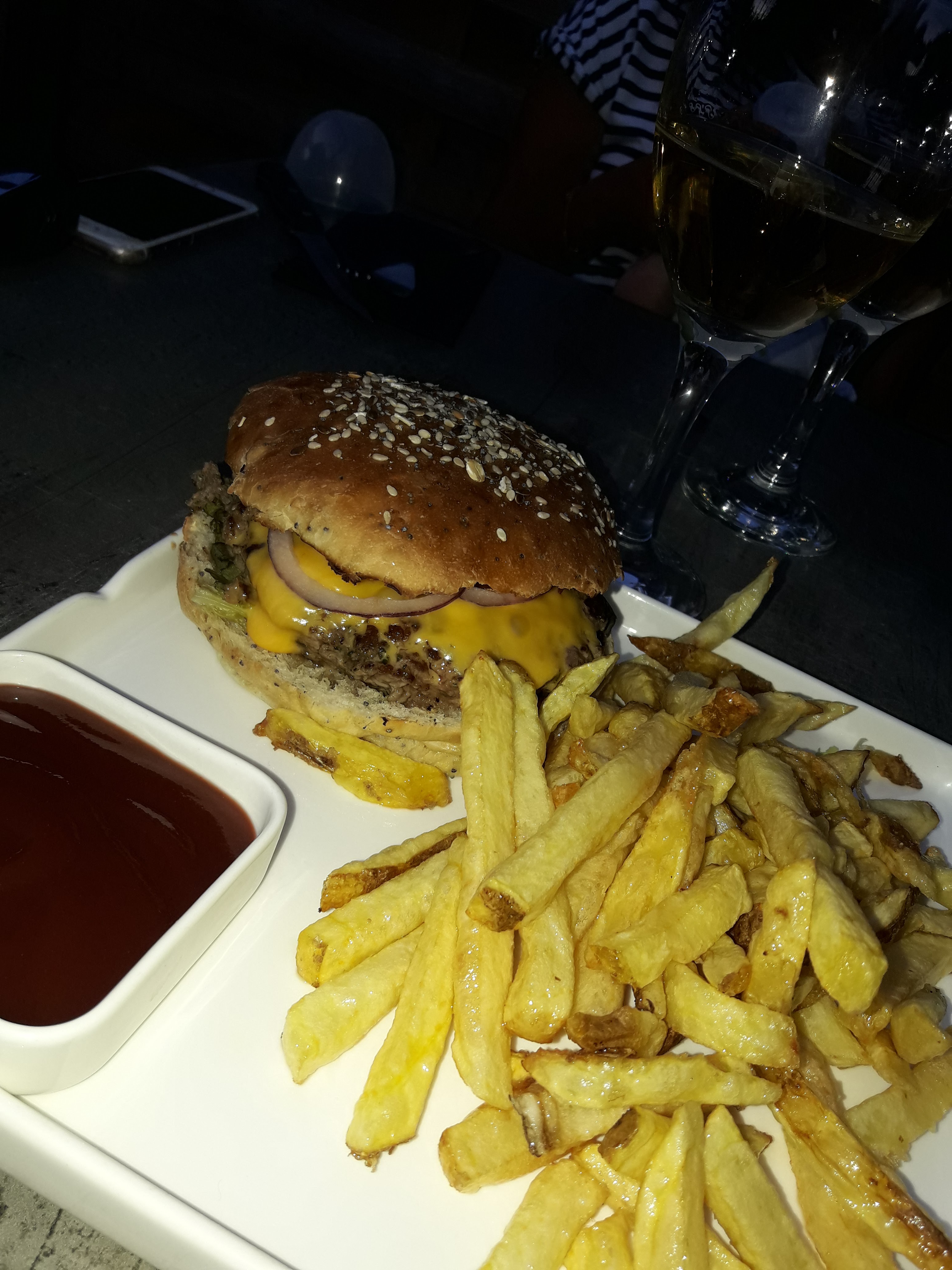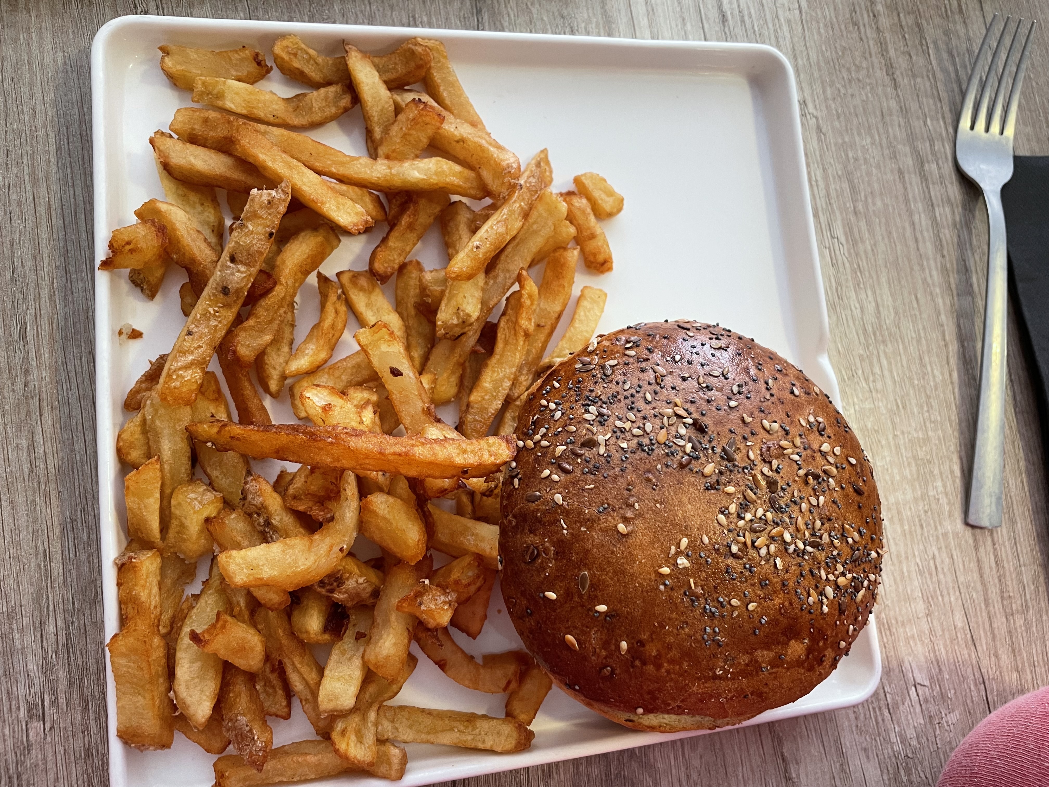 Frites brûlées et ramollies, hamburger pas super. Très cher pour cela. Très déçue C'était la première fois mais dernière fois aussi.