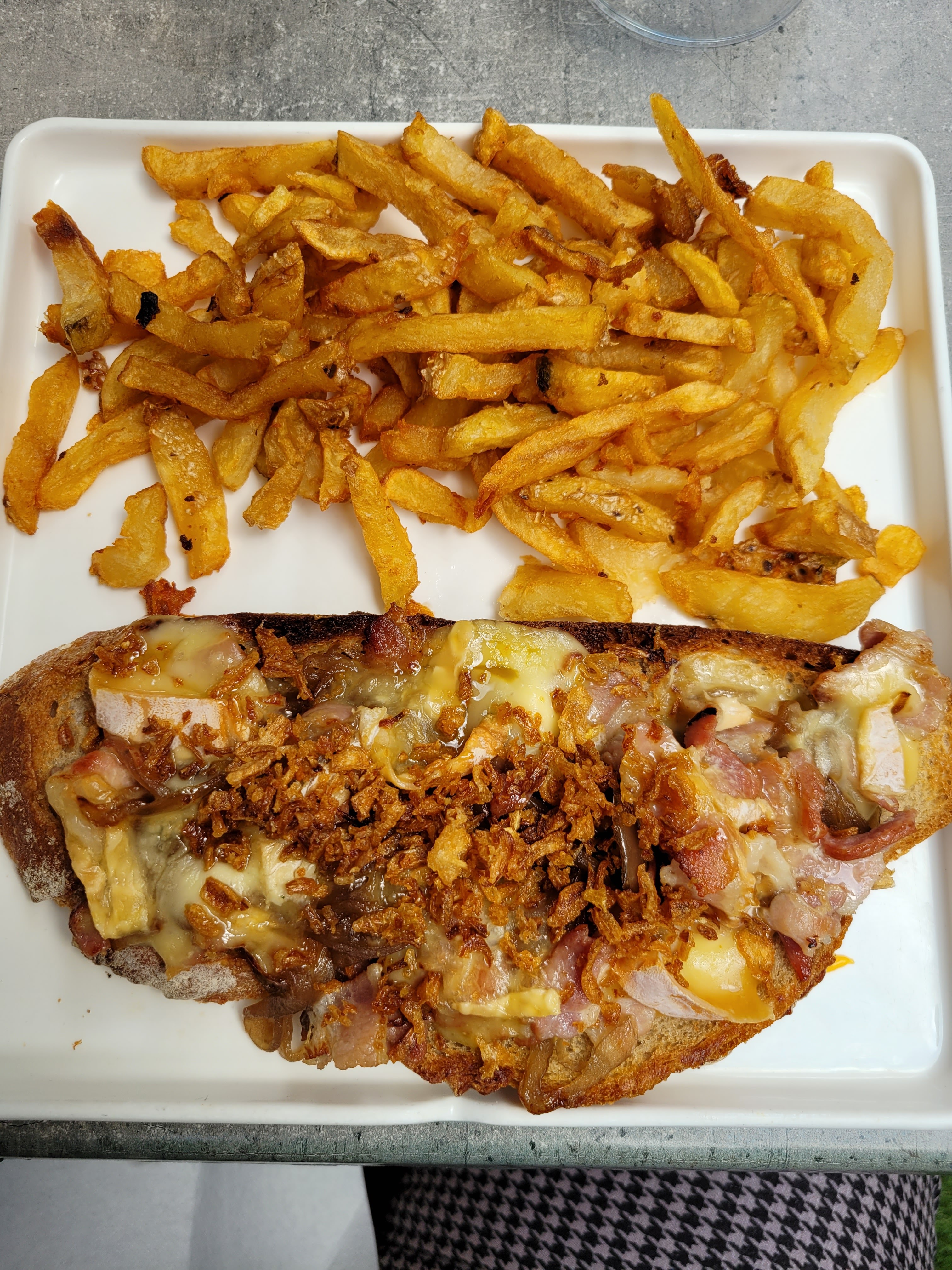 un pur délice 😋 ici recette adaptée (le corse) avec steack végétarien , pour notre plus grand plaisir gustatif ! Tout est bon !! le pain , la sauce , le fromage, les frites (en tant que chti, je suis intransigeante lol) je recommande +++