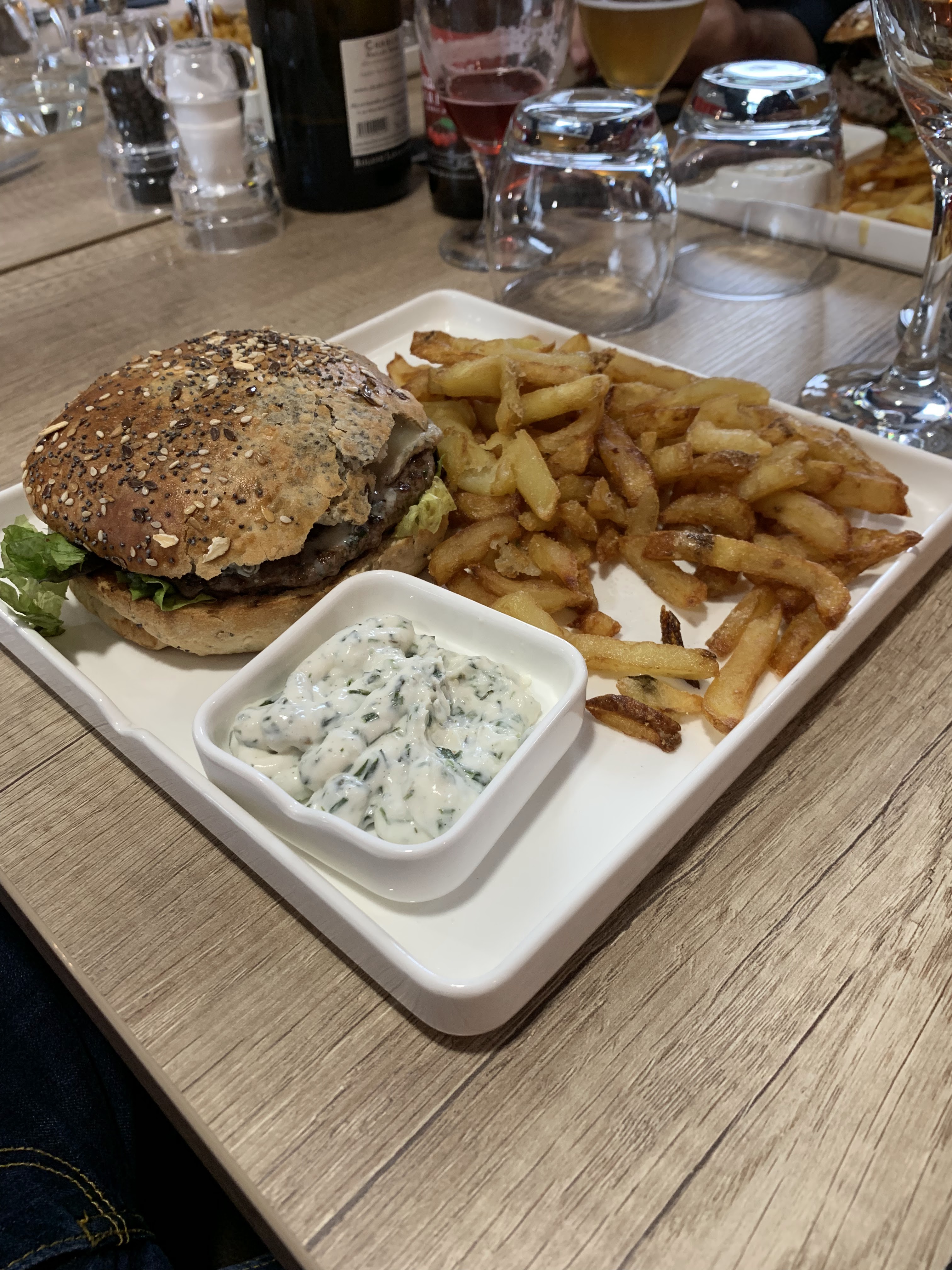 Très bon accueil, serveur très agréable, de bons conseils pour la cuisson et le choix du burger qui était très très bon, le pain incroyable bon et tendre et moelleux bref une tuerie, viande au top également et très bien assaisonné. Frites maison très bonnes et sauce maison très fraîche pour l’été. Le chef vient vous voir à la fin de votre dégustation, j’ai apprécié le personnage, assez charismatique et sympathique. Petit bémol pour les desserts mais on y va pas pour ça à vrai dire. 3 salles de dispo, SAM basique, véranda ou terrasse. Parking, difficile de trouver une place et pourtant énorme emplacement. Propreté des toilettes laissant à désirer et pas d’essuie-mains. Mais si vous avez envie de manger un bon burger maison avec des produits d’hyper bonne qualité, je vous recommande ce resto. Comptez 15€ avec sauce Et 5€ le dessert … en gros Bon App !!!!