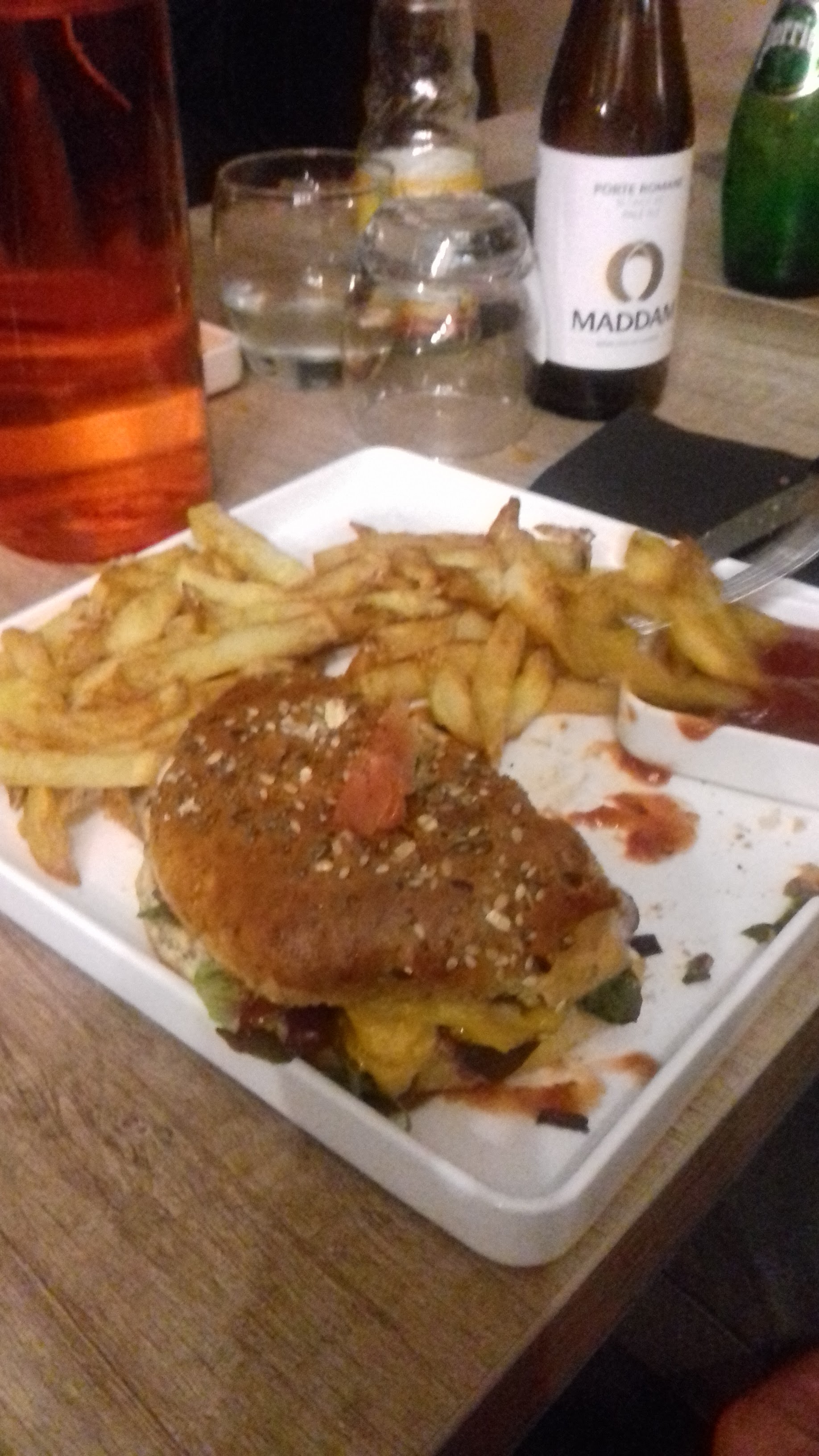 Les burgers sont de qualités et fait maison avec des produits locaux. Ils sont bien présentés et bons. En revanche les frites maison font un peu de la peine, elles ne m'ont pas convaincu plus que ça. Dans l'ensemble le restaurant est très bien, niveau burgers c'est un 20/20 ! Je modifie mon commentaire car apparemment on ne peut pas en rajouter un.. Donc avec mon mari on y est retournés récemment verdict: en vente à emporter ça ne vaut pas du tout le coup !!! Burgers vraiment mauvais par rapport à ceux commandés sur place.. très déçue surtout pour le prix. En plus on avait commandé 2 sauces et ils ont oubliés de nous les mettent.. heureusement le propriétaire nous a promis de nous en offrir la prochaine fois ou de nous faire une remise.