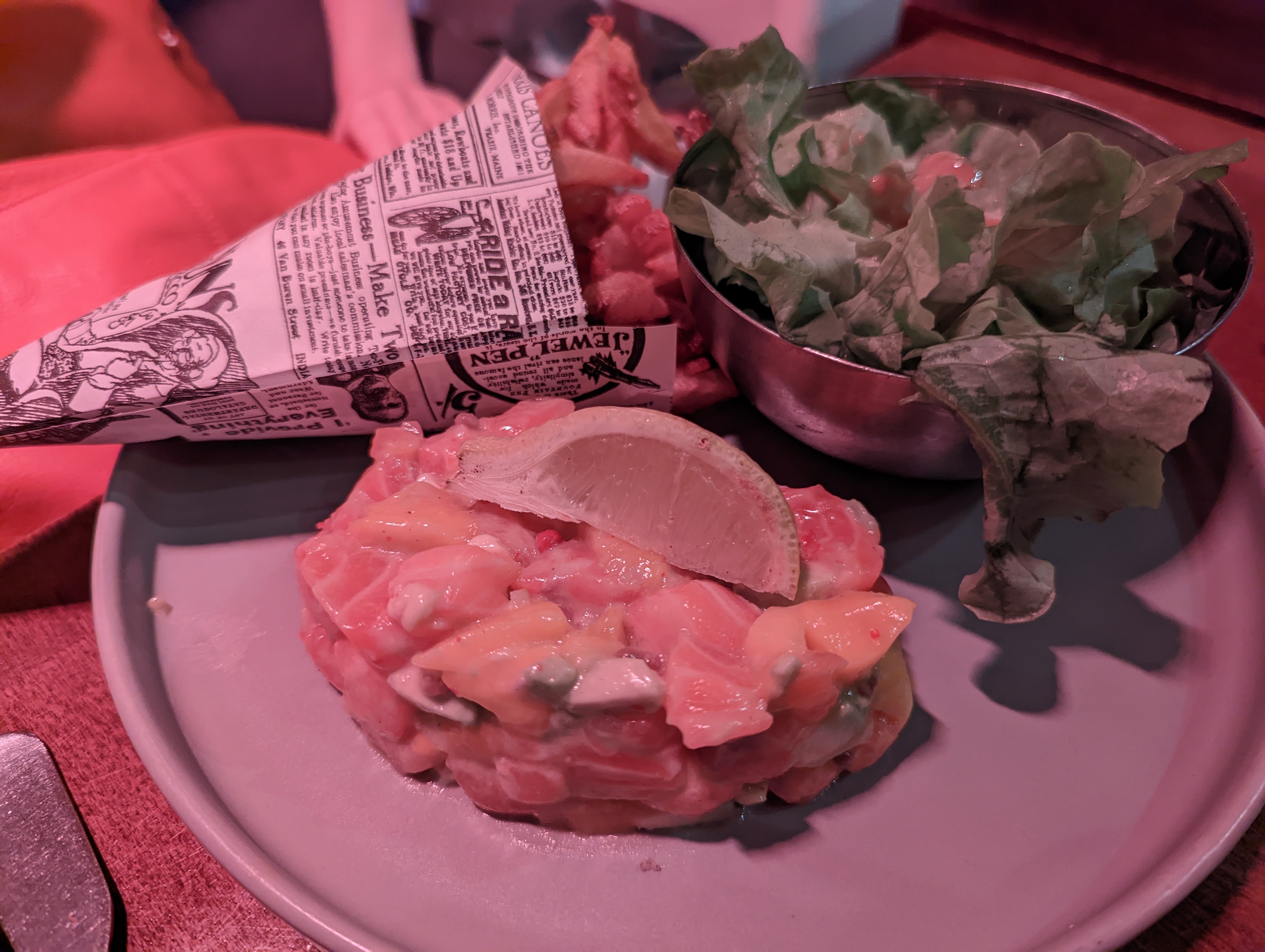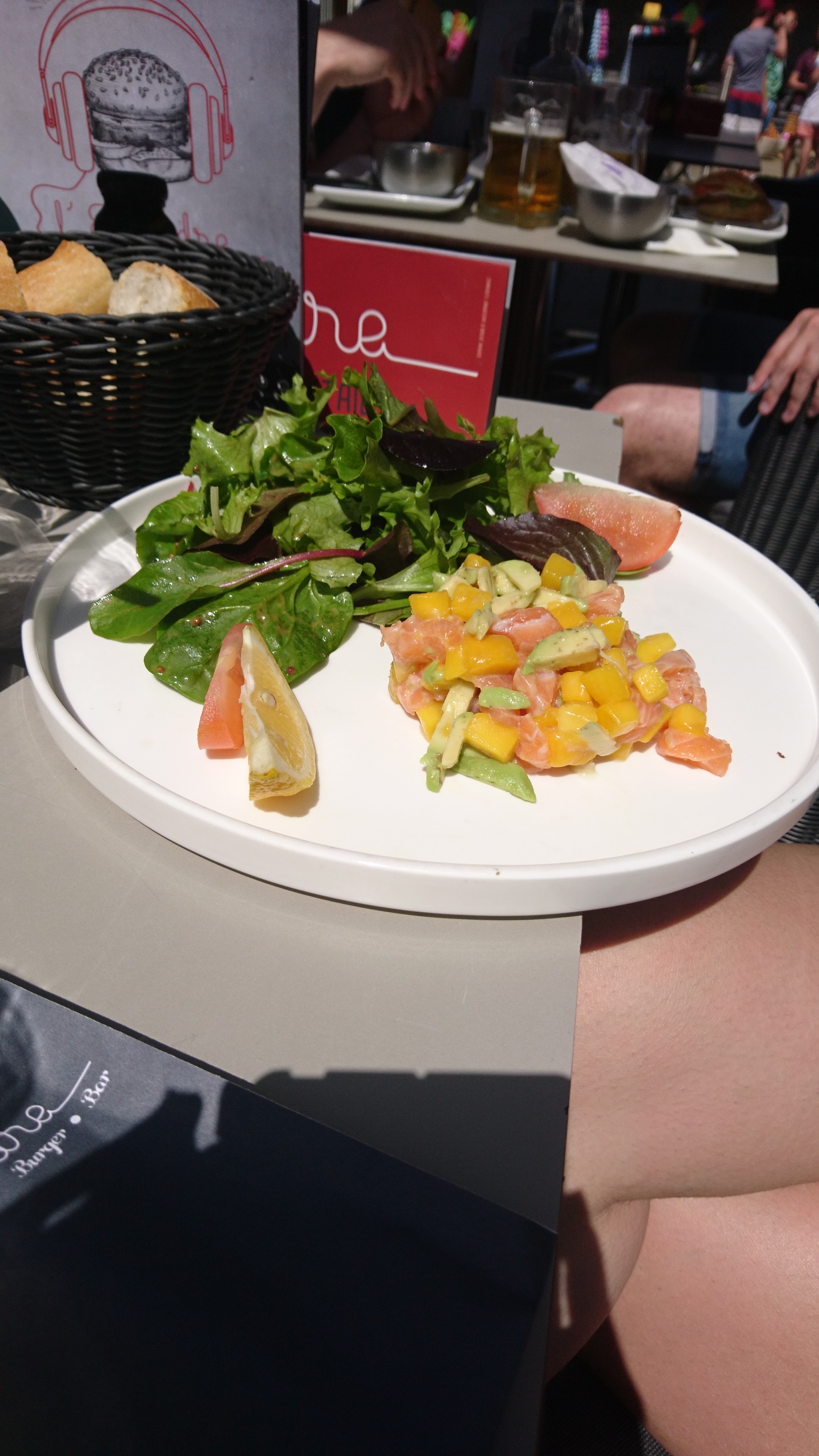 Tartare de saumon : quantité correcte de poisson, mais avocat et mangue très durs et secs car pas mûrs. Plat gâché.