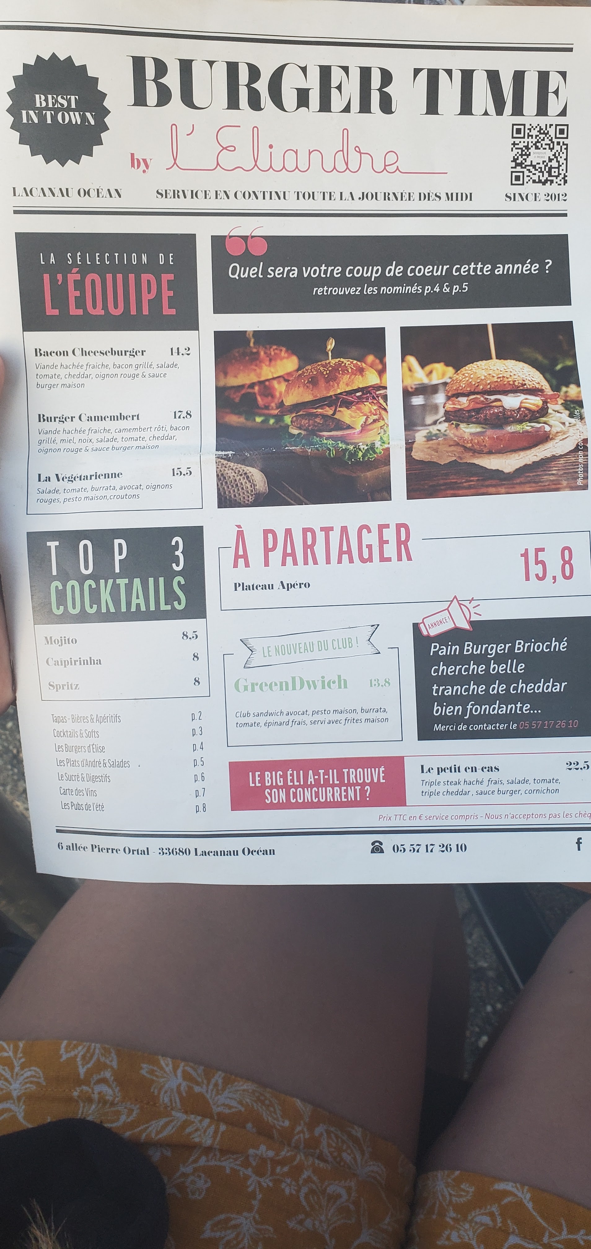 Pour notre dernière soirée à Lacanau, nous avons dîné dans ce restaurant, apprécié particulièrement pour ses burgers ! Nous avons donc tous les quatre, testés les burgers, et nous avons été ravis de la qualité des produits (frites maisons, pain à hamburger type brioché, produits frais) Un vrai régal 👍👍 Le café gourmand était également délicieux (~10€) un peu cher pour la quantité tout de même, mais la qualité y était. Nous reviendrons! Je recommande 👍 (Vs trouverez le menu ci joint avec les photos des plats pour ceux qui veulent survoler la carte avant de tester)