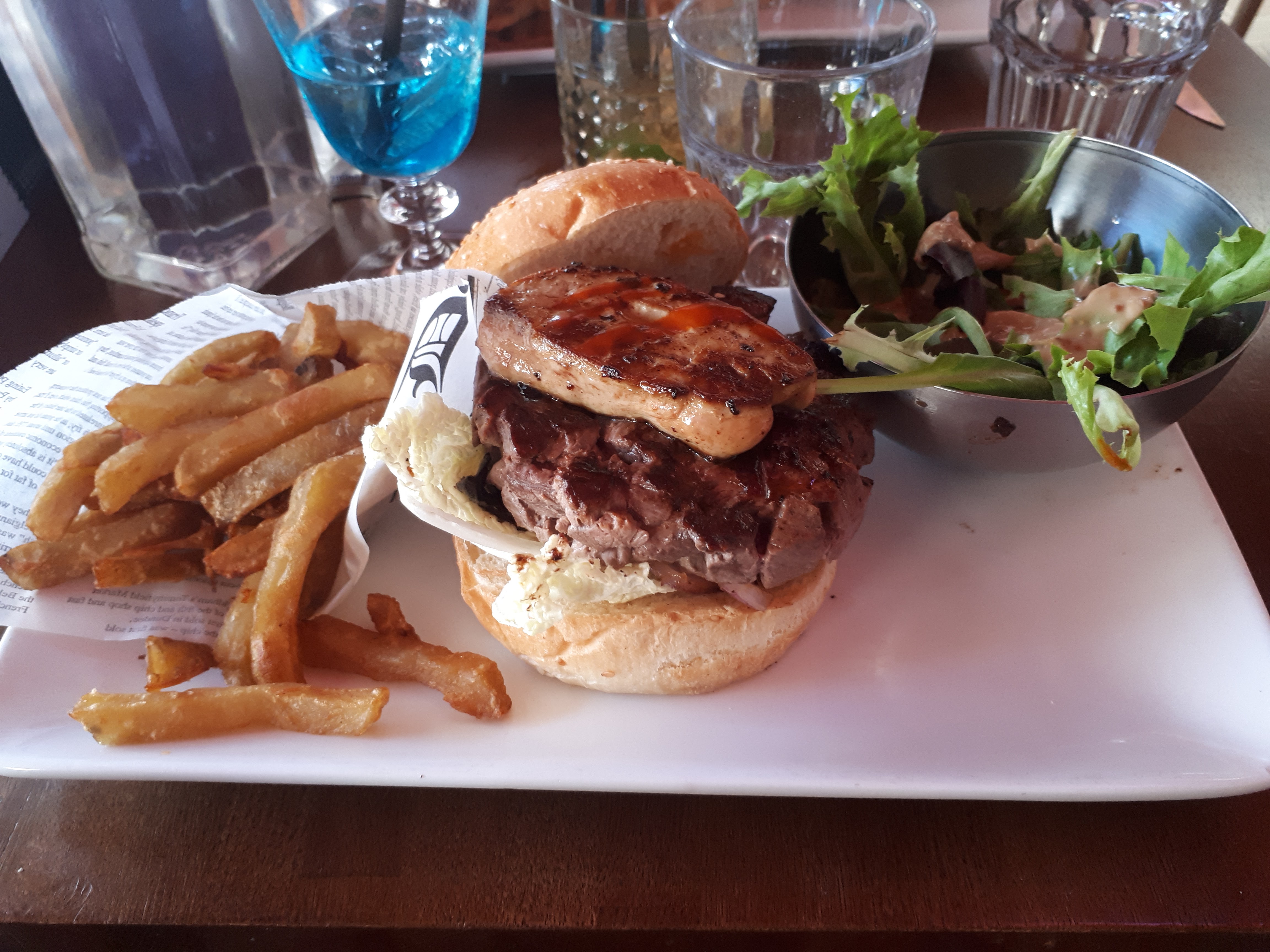 Très bon. Un emplacement parfait, une cuisine très bonne et des serveurs au top, j'ai mangé un burger rossini et la préparation était parfaite les gouts étaient très répartis et la cuisson était niquel, petite remarque au niveau des frites qui sont bonnes mais qui pourraient être faites maison et le burger qui pourrait être légèrement plus gros.