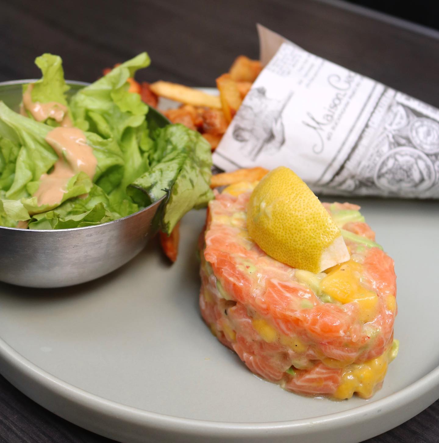 Délicieux tartare savoureux et rafraîchissant : dés de saumon, mangue et avocat, Accompagné de frites maison croustillantes. Je recommande !