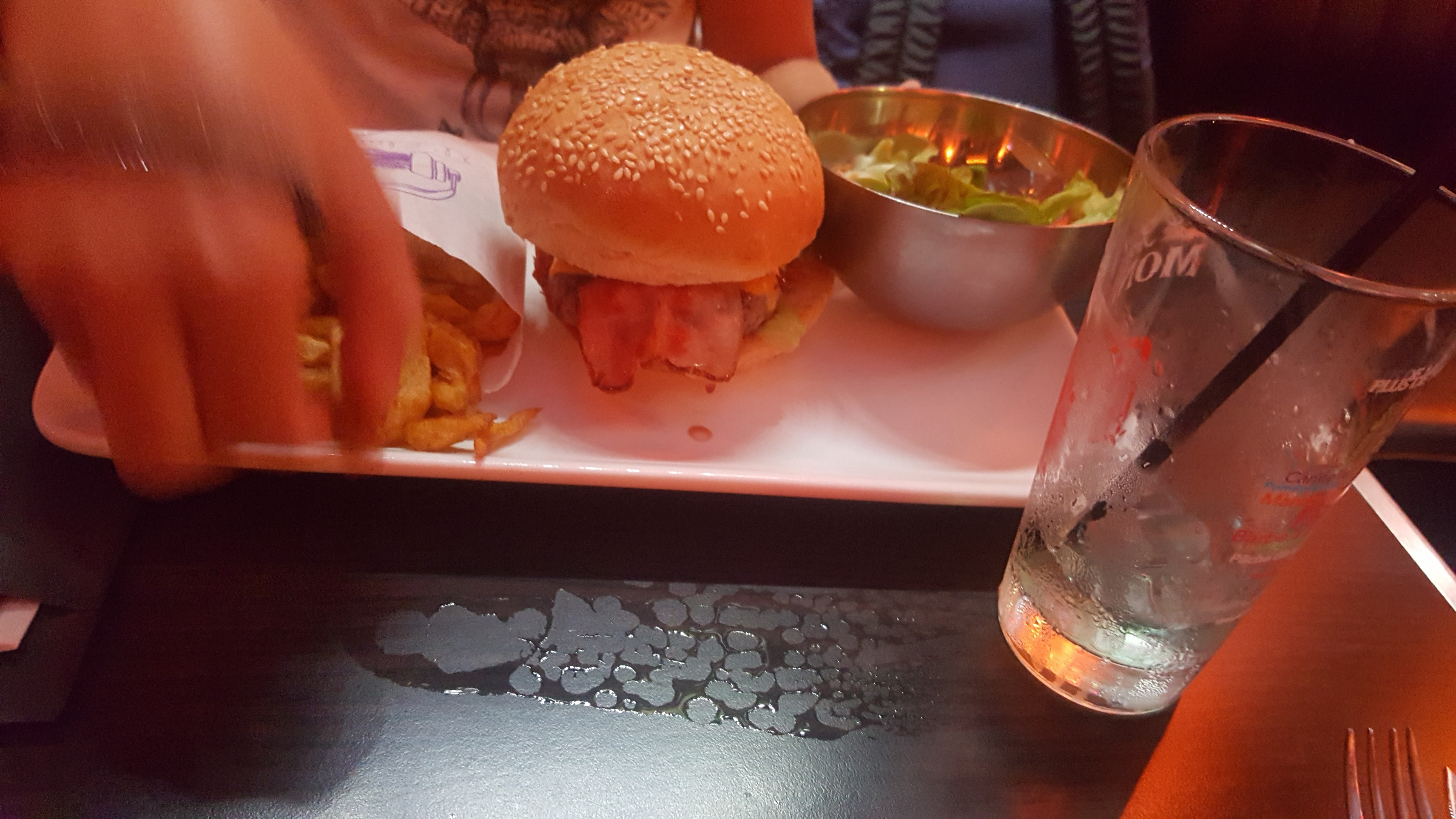 Bière renversée, saucisson non coupé PUIS tombé par terre et non changé ! Couteau à bout rond donc très difficile de couper ! Steack haché froid. Et d'une lenteur, mais d'une lenteur...