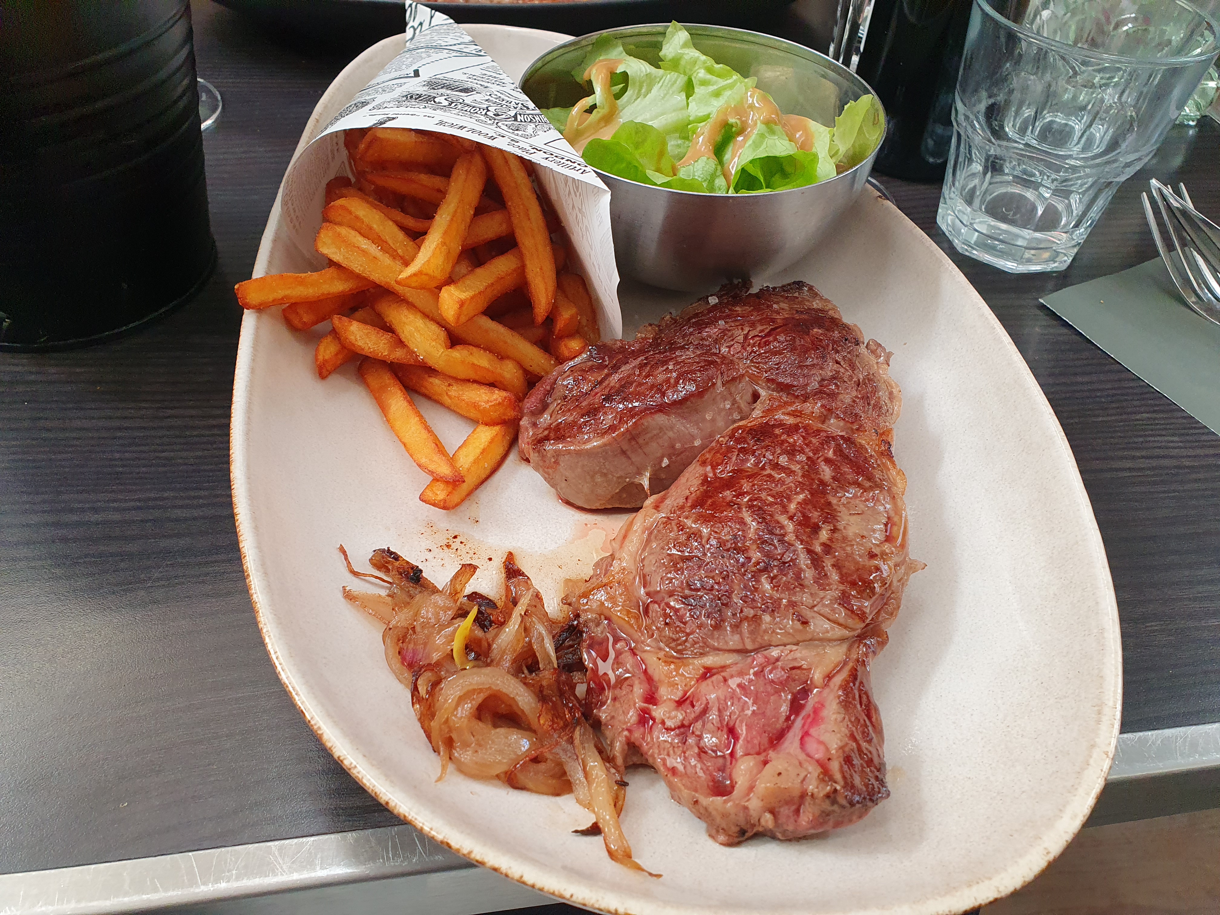 Frites trop cuites et très grasses et 2 feuilles de salade inondées de vinaigrette en guise d'accompagnement. On ne m'a même pas demandé la cuisson de la viande à la commande. Vu le prix par plat pour la qualité délivrée je dirai que c'est un excellent piège à touristes. On me m'y reprendra plus. Et si je peux éviter à d'autres personnes de se faire avoir comme nous mardi dernier,alors mon avis ne sera pas inutile.