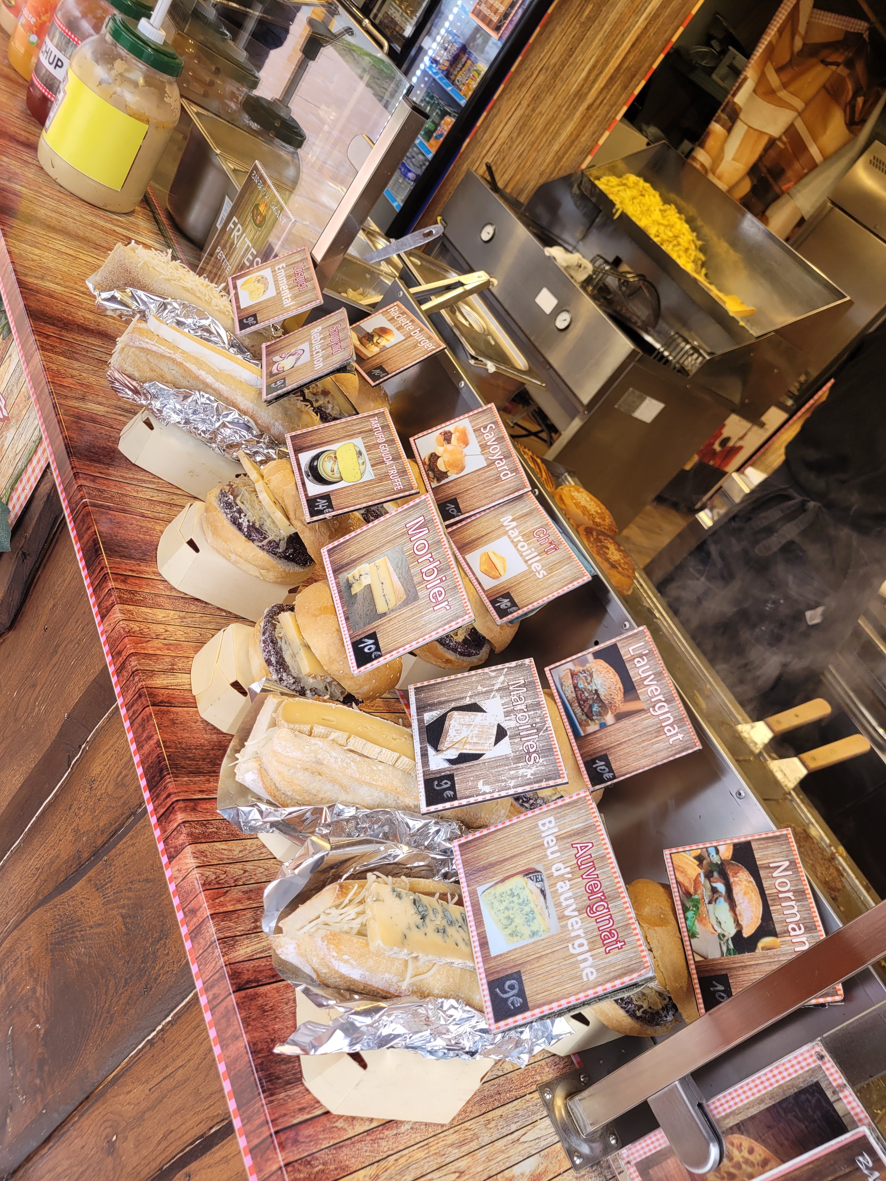 J'ai acheté aujourd'hui un sandwich Maroilles à 9€ avec un grande frite à 6€. Les frites étaient molles et gorgées d'huile. J'avais mal au ventre et j'ai jeté la moitié des frites. Les frites baignent dans l'huile. Je déconseille cet établissement.