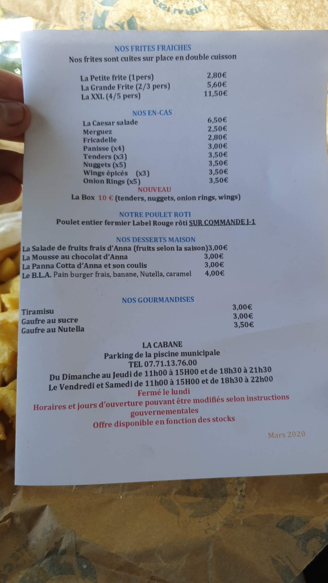 Bonsoir John et Lachlam Deux commentaires à deux étoiles pour une même commande, je me permettrai de vous répondre communément. Tout d’abord toutes nos excuses pour les frites qui n’ont pas répondu à vos attentes, qui n’ont pas été excellentes. Nous en sommes désolés. Pour répondre à votre même question: pourquoi? Nous travaillons la pomme de terre fraîche en double cuisson. Cette dernière réagi selon le climat. Ce soir, nous avions un temps orageux. Cela ajouté à une fin de récolte, donc la patate riche en amidon, les frites n’ont pas aimé cette combinaison. La dureté de l’amidon avec la mollesse de la pluie, elles ont mal vécues le temps que vous les mangiez. Sachez que nous en sommes désolés. Nous portons au quotidien une très grande attention à la qualité de nos frites. Et c’est loin d’être un travail simple. Et non, vu la quantité de frites que nous vendons au quotidien, c’est à dire plusieurs dizaines de kilos elles n’ont pas le temps de rester plusieurs jours. Passez un bon séjour chez nous. Cordialement