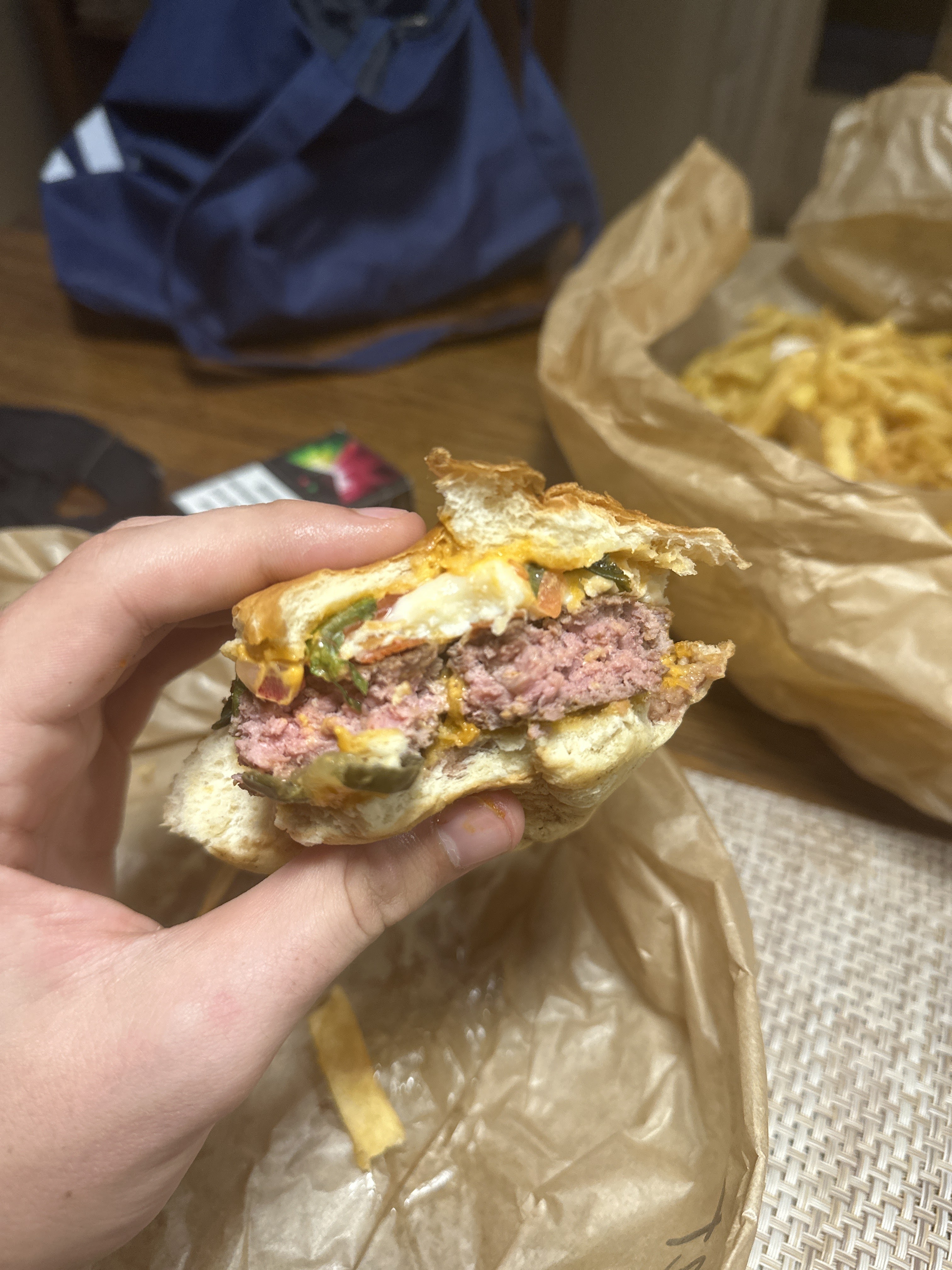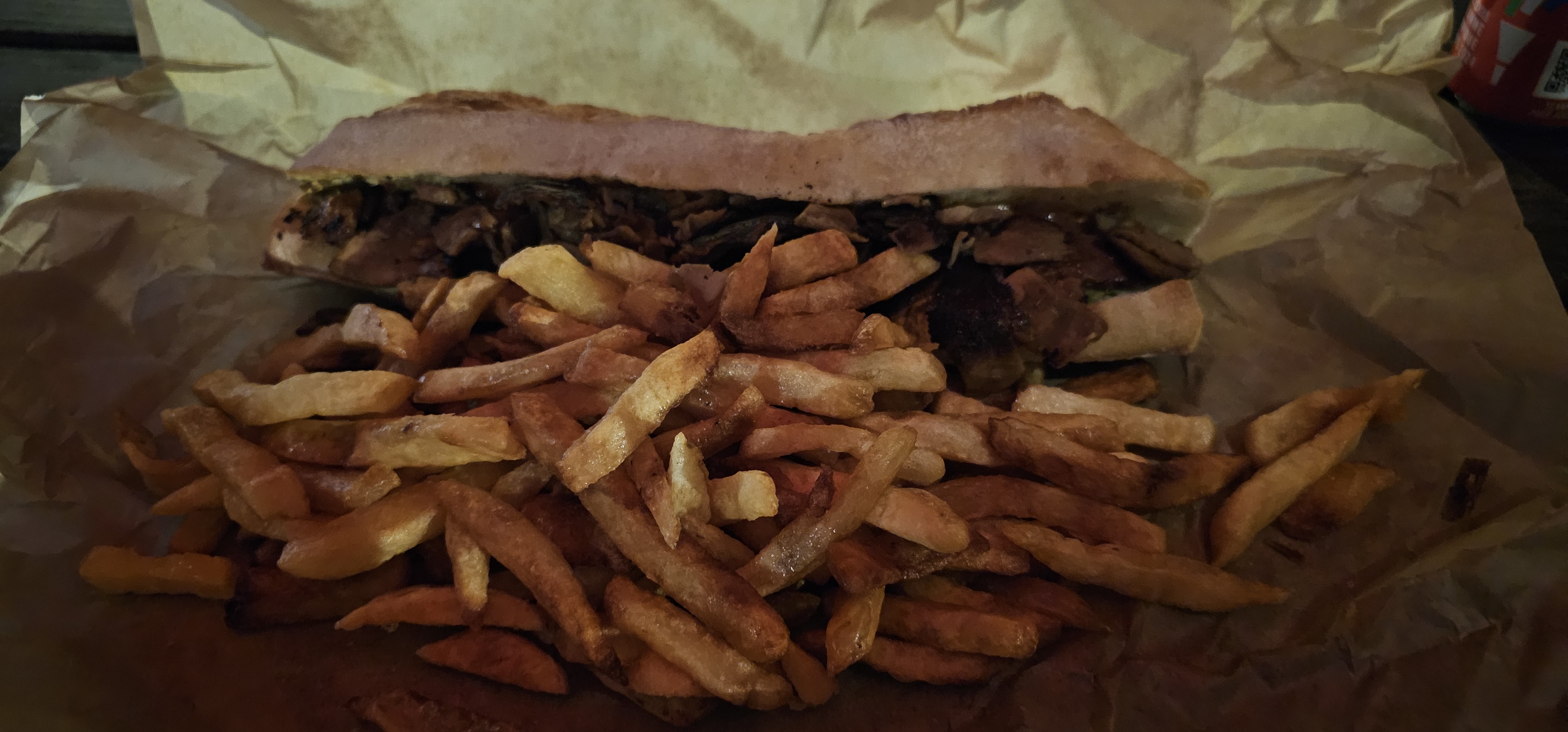 Le burger n'était pas trop mal je suppose, les gens étaient sympathiques, mais qu'avez-vous fait à ces frites ? J'avais littéralement l'impression de mâcher du cuir. Certains d’entre eux n’étaient que de la peau frite sans pomme de terre. Je voudrais peut-être changer de méthode les gars