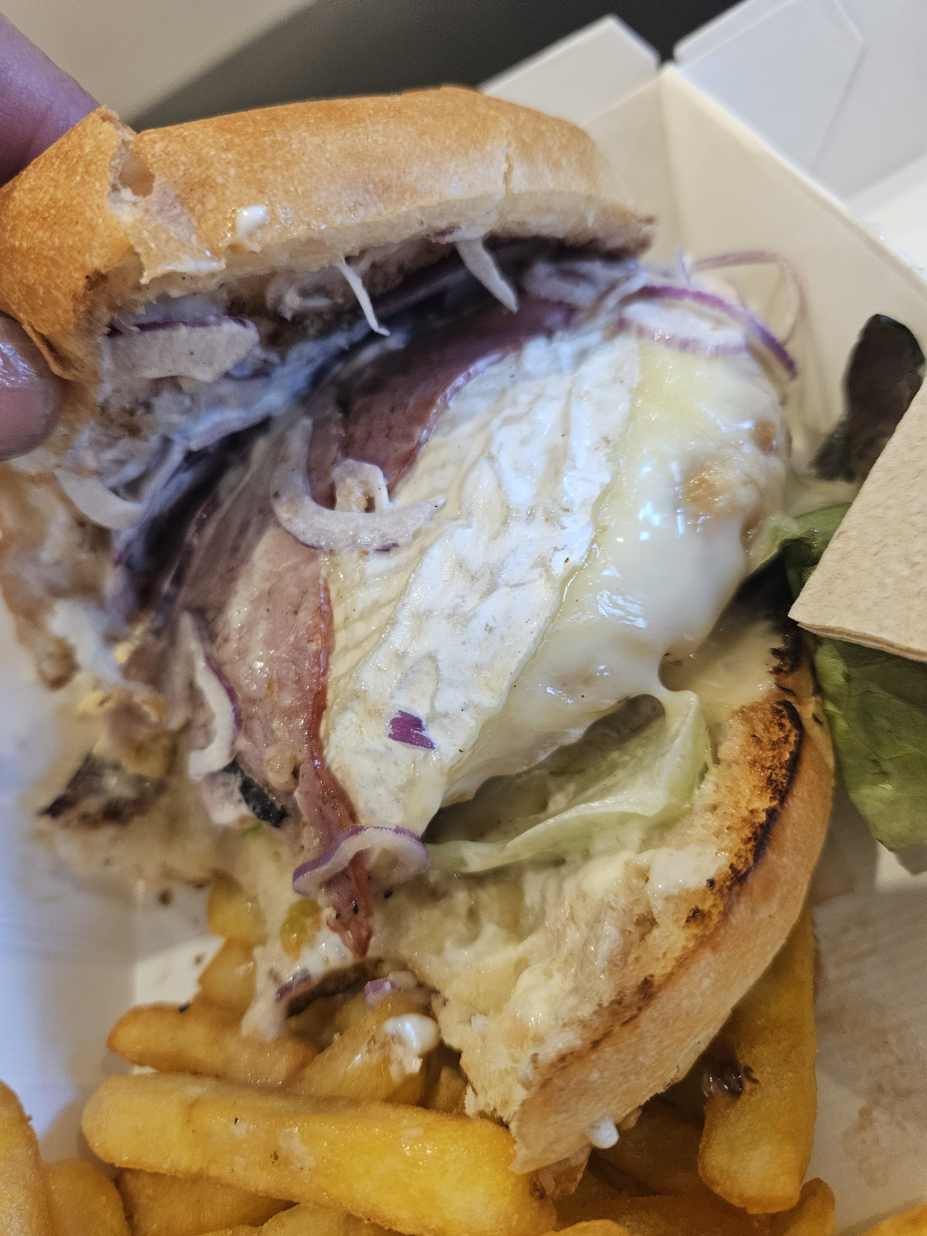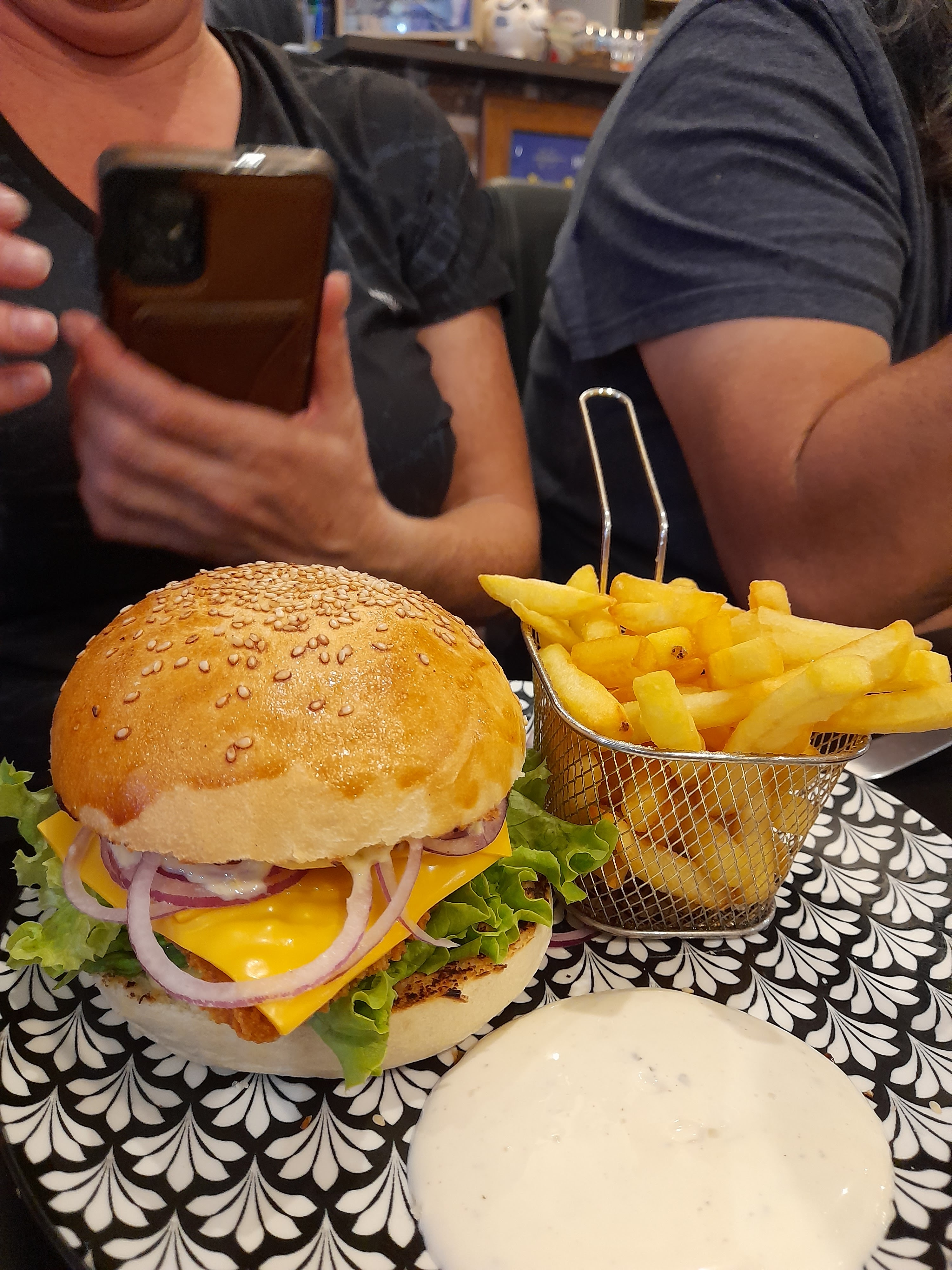 Alors d'abord le temps de patienter que notre commande soit prête, nous avons agréablement été surpris par l'accueil des locaux qui n'hésitent pas à vous parler et a rire avec vous 👌👍, très agréable lorsque vous arrivez en terre inconnue, tard le soir, un peu fatigués. (Petite pensée à la jeune femme qui prend son scooter pour sortir 😉) Ensuite, que du bonheur 🥰 déjà les propriétaires et personnel sont des personnes très accueillantes, l'ambiance est très conviviale, musique de fond agréable, espace pour se restaurer très sympa et le must le REPAS, excellent !!! Il y en a qui ferait bien de s'en inspirer. Même une personne végétarienne peut se régaler car l'hamburger qui a été servi était succulent à l'oeil et à la bouche🎆.