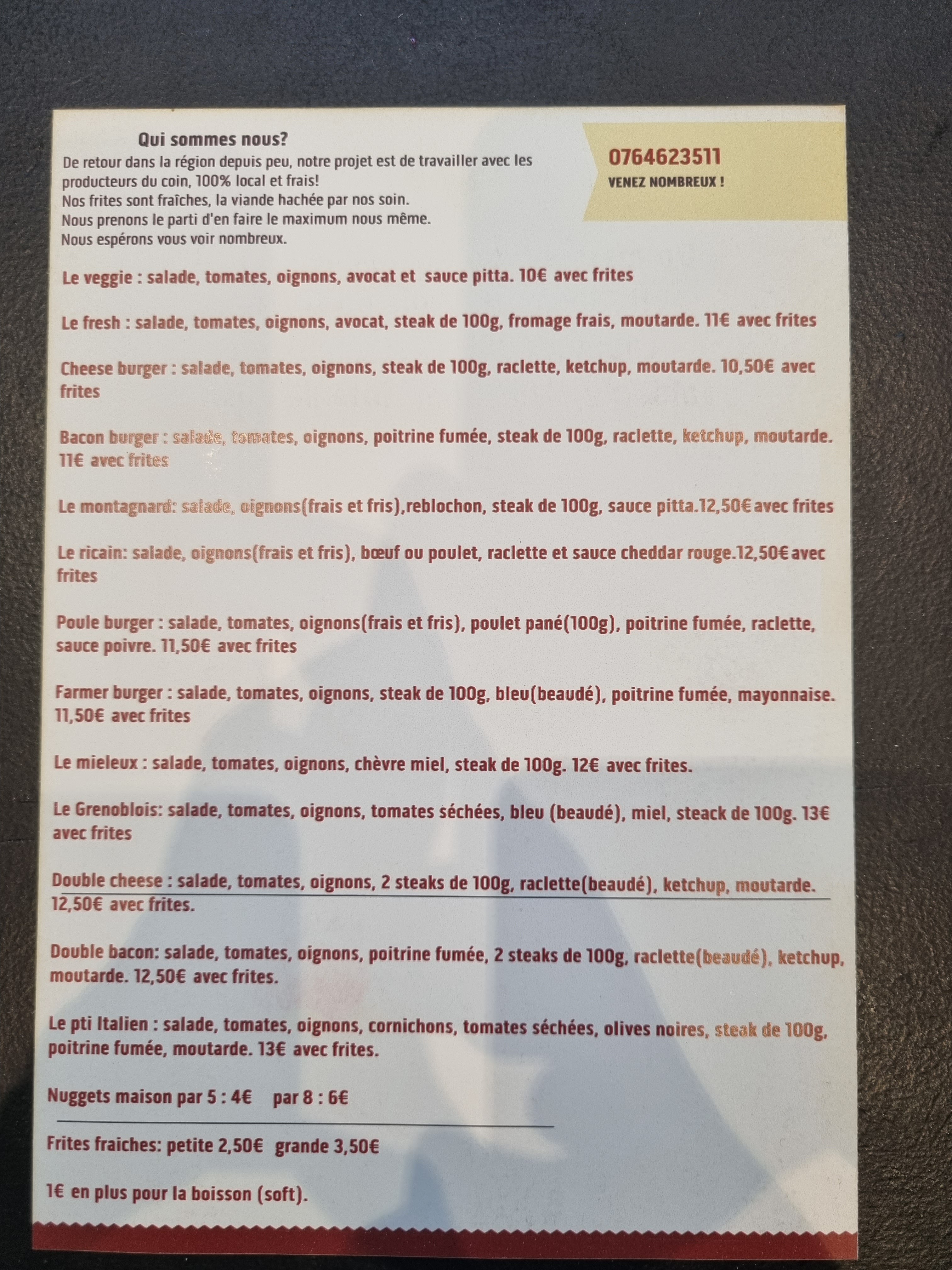 Très bon accueil, le fait de vouloir utiliser des produits locaux afin de faire les burger est très respectable. Malheureusement j’ai été déçu par la qualité du steak haché, je n’ai pas pu en manger la moitié (gros bout de nerfs très dur) et le pain en dessous était gorgé de jus de viande. Malgré cela merci pour votre accueil et votre gentillesse 😉