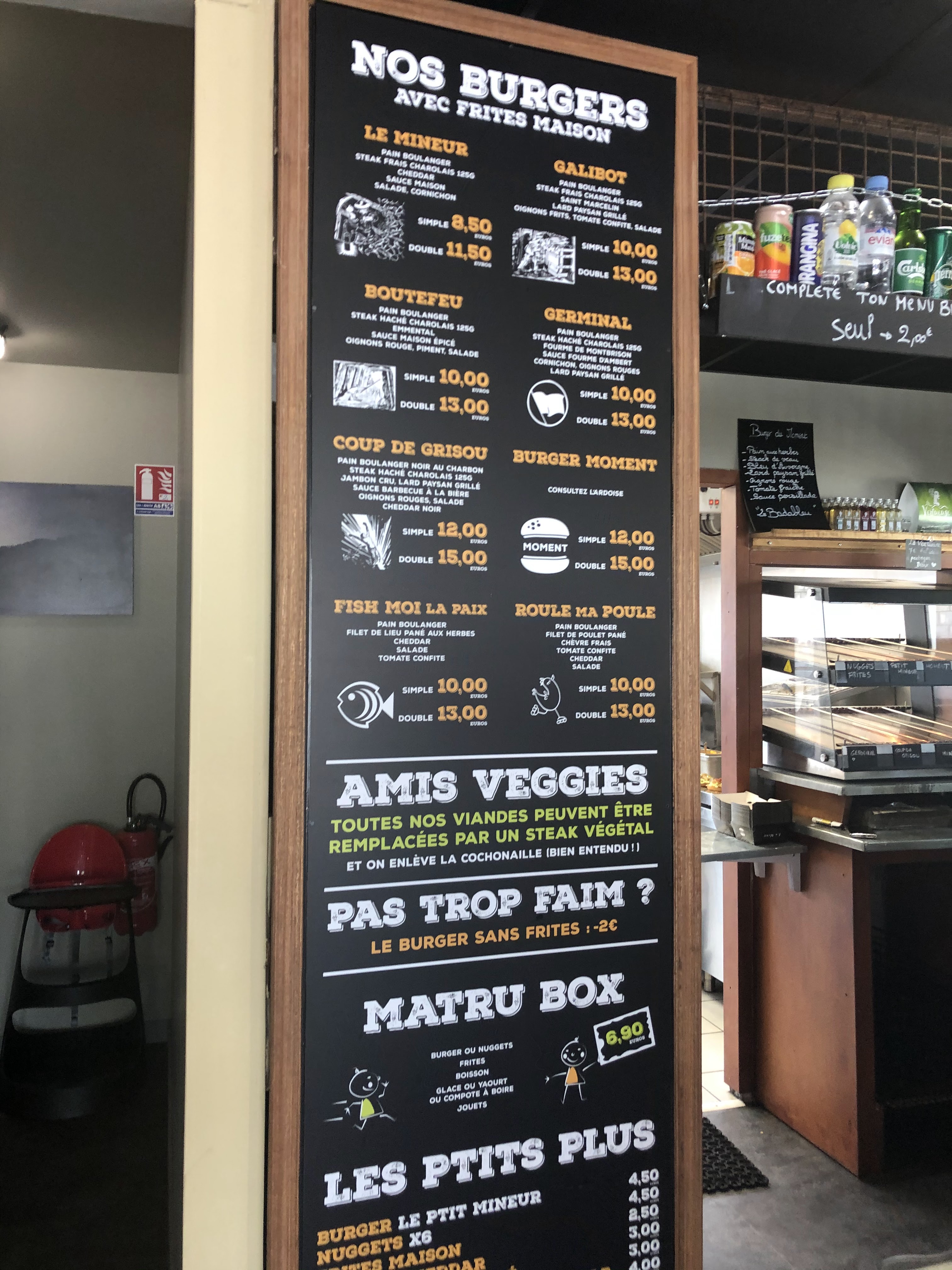 Si je vous dis trop de bien de ce restaurant, il deviendra inaccessible. 🍔 Parce que j ai aimé. 🍟 Un bon burger frites ? Vous aurez ici une réponse généreuse. Vous voulez manger sur place ? Profitez d un cadre aux couleurs du passé minier local, c est un bon choix. Ne pas confondre avec un mc do, c est pas les même qualités ou portions ni le même prix d ailleurs Et si vous avez commandé par tel, je n ai pas essayé, mais certainement la meilleure option pour les heures de pointes. Visité un mardi 20h en duo, le service a été rapide.