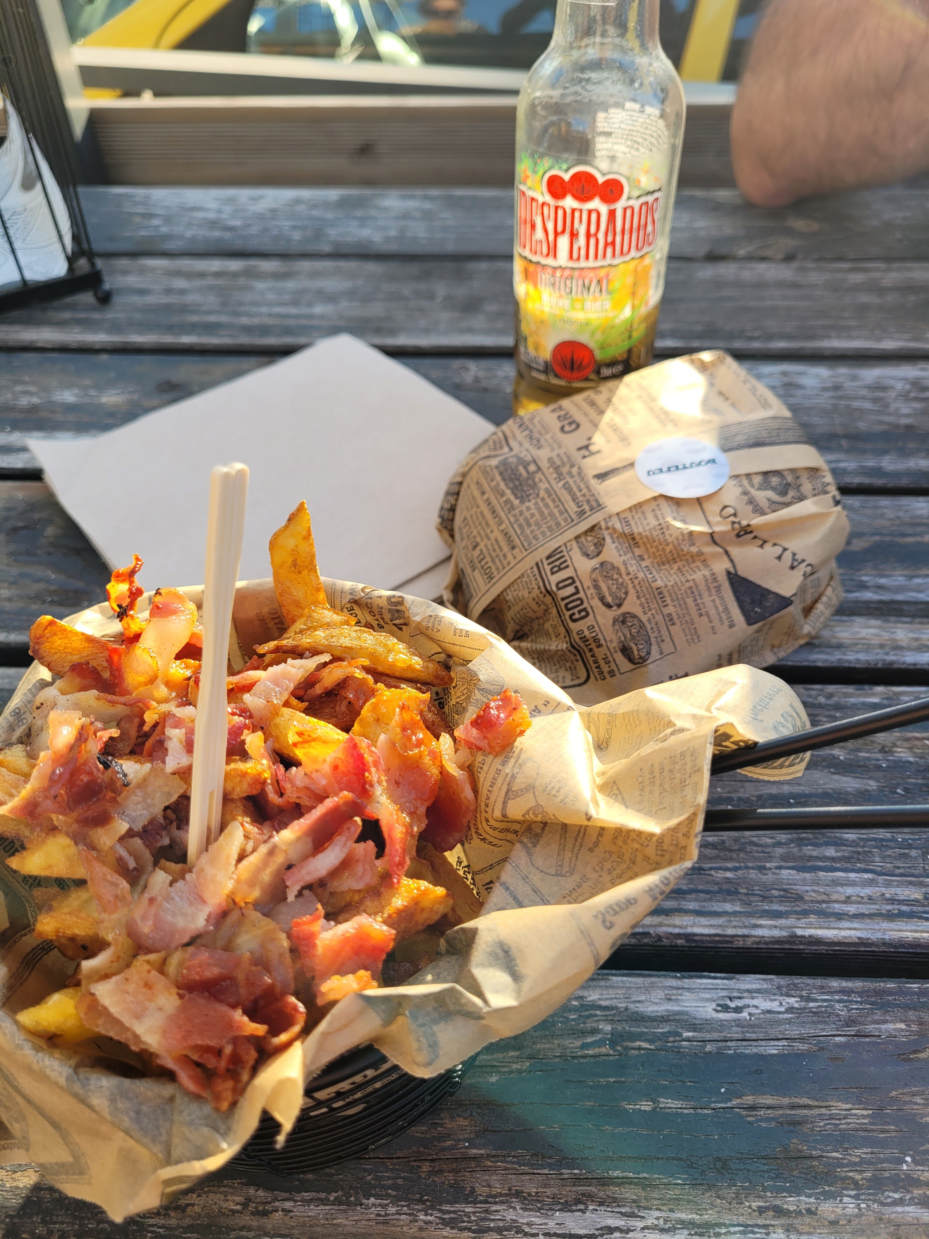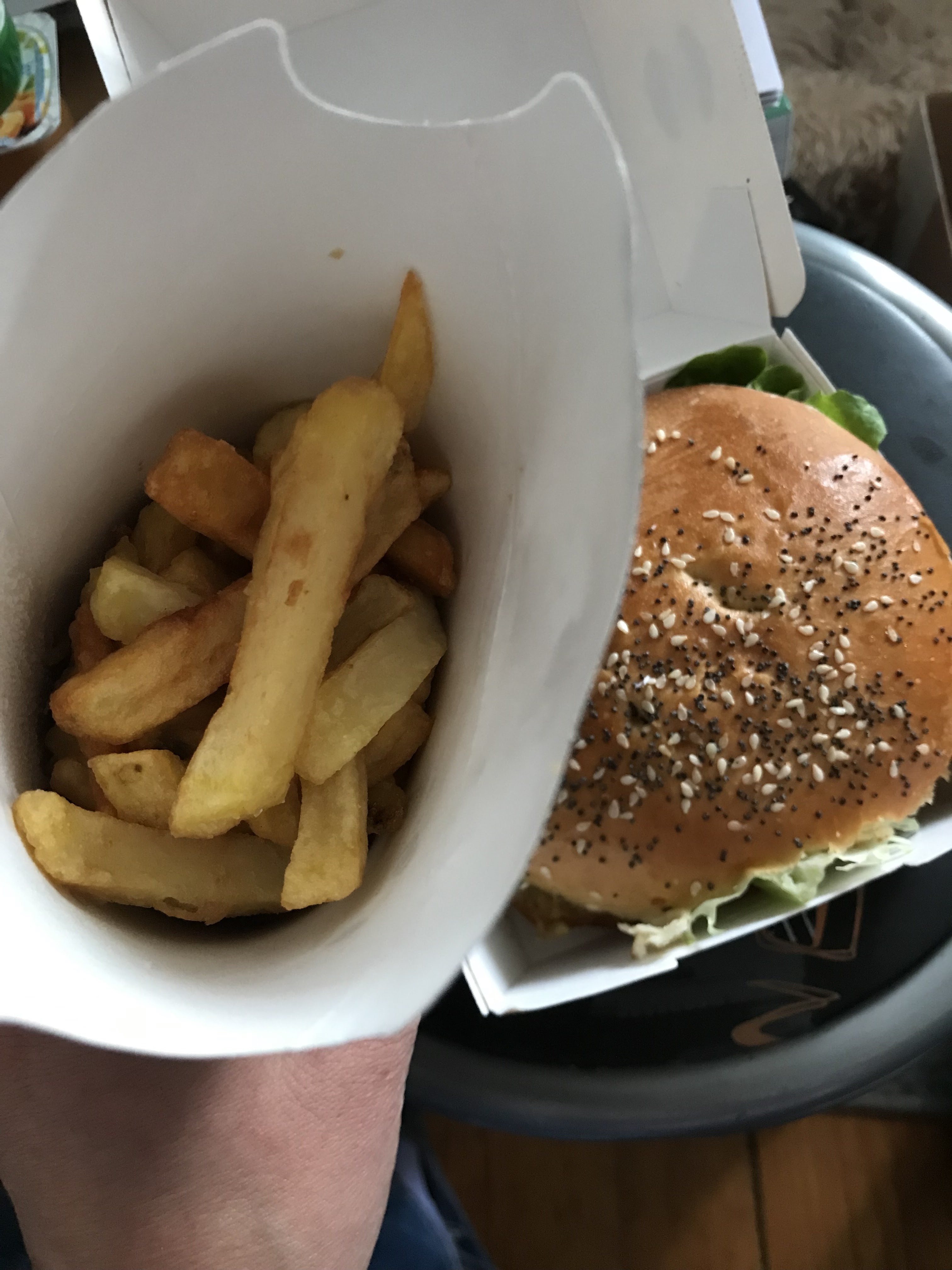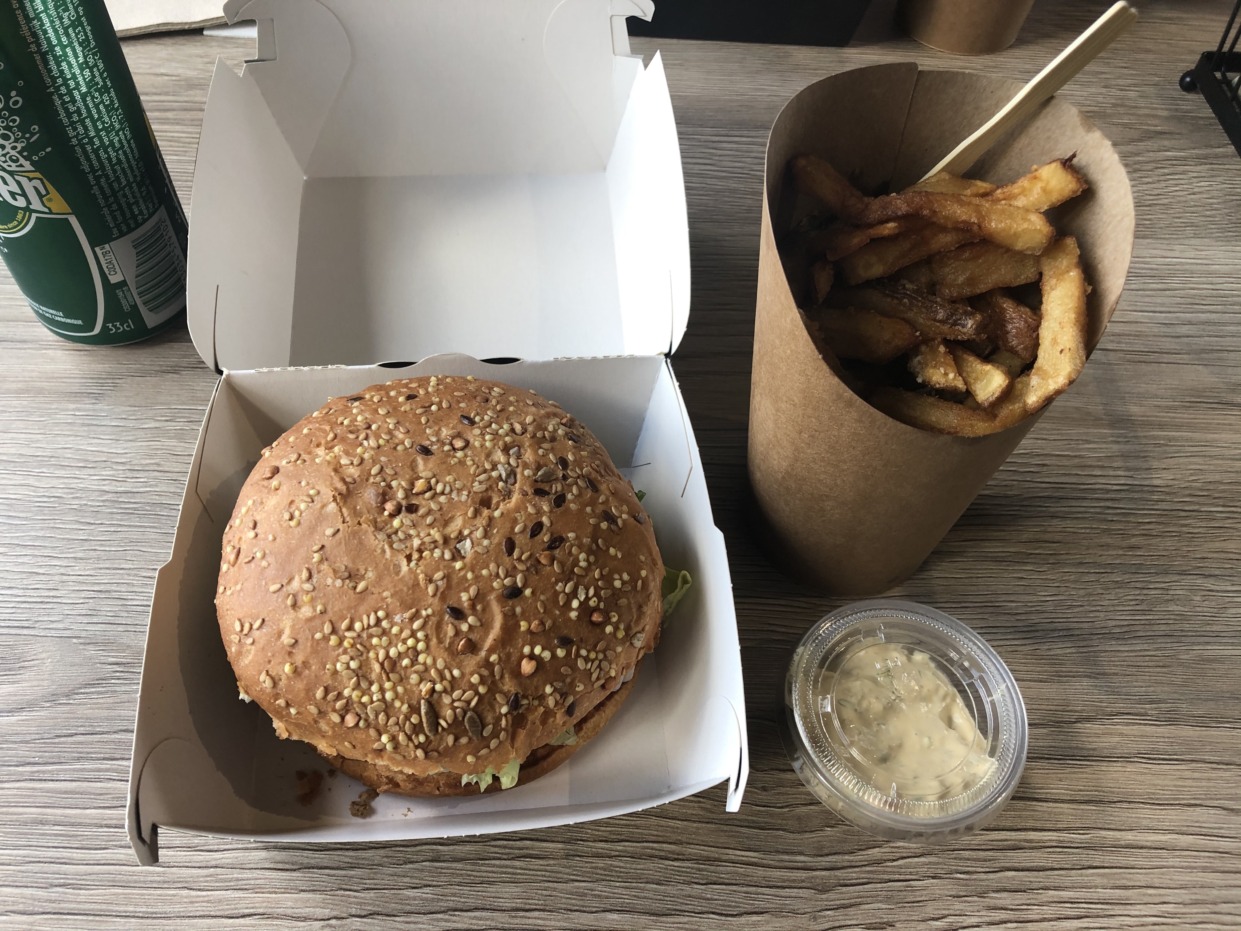 On a pris à emporter, les frites ne sont pas des frites dommage elles avaient l'air bonnes mais toutes collées, toutes molles à manger... J'avais pris le seul burger de la carte où il n'était pas mentionné de sauce dans la description, manque de bol sauce à base de moutarde donc pas pu le manger, déçue