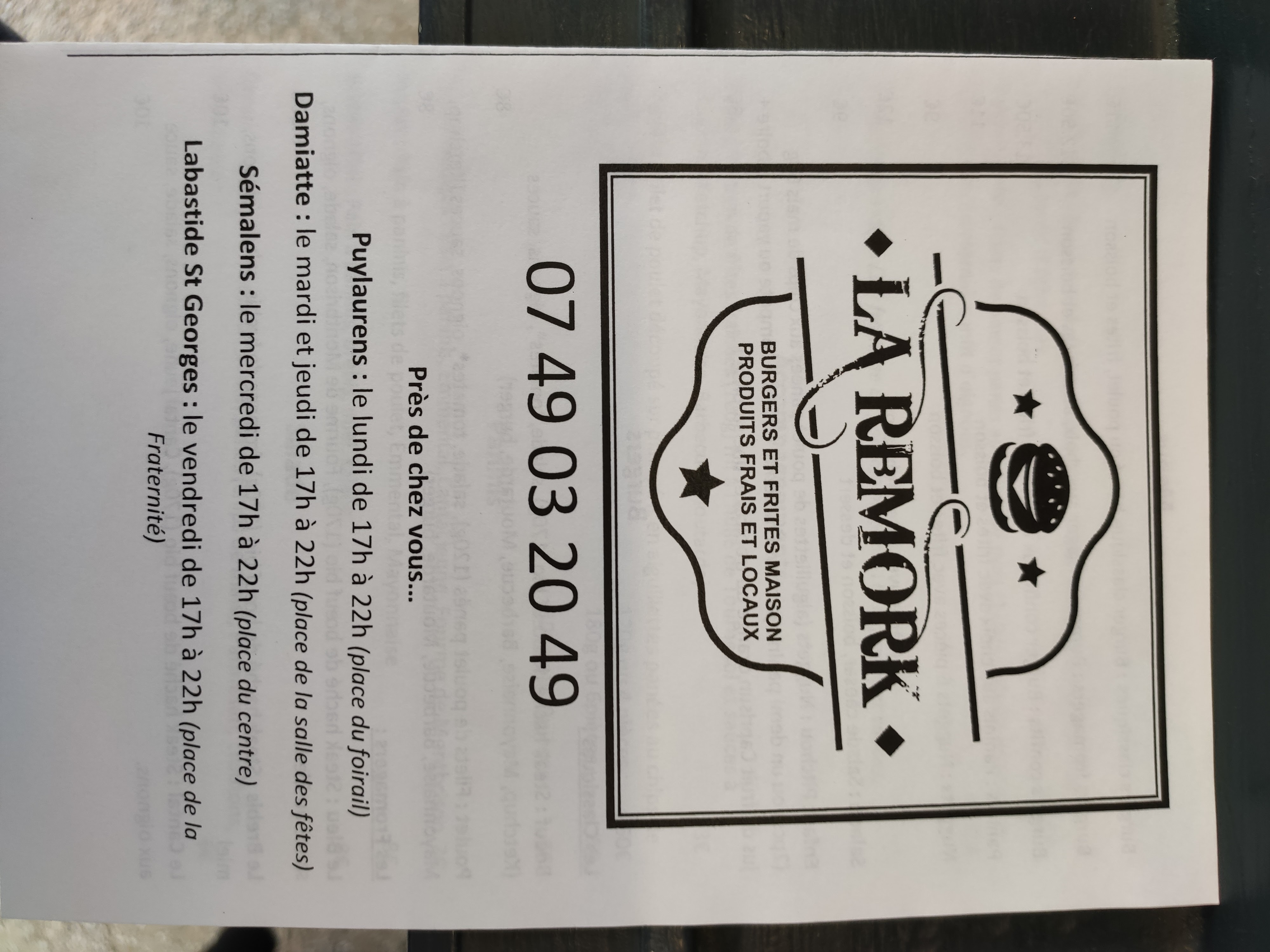Voici toutes les informations sur le Restaurant de hamburgers La Remork qui ce trouve au 8 Pl. de la Fraternité, 81500 Labastide-Saint-Georges (81). Sur cette fiche vous trouverez les photos, l'adresse, les horaires d'ouverture, le numero de téléphone et les avis clients.Vous pouvez églement rédiger un avis si vous le souhaitez en bas de page.