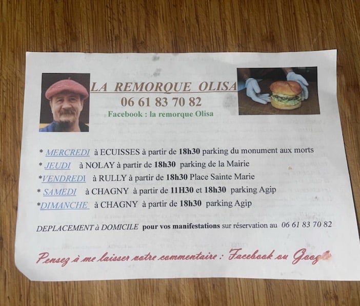 Je recommande vivement de tester la Remorque Olisa. Les gérants sont très accueillants et gentils. Les hamburgers, c'est un délice! Ils sont très garnis et bien savoureux. Les produits sont frais et de qualité. Foncez sans hésiter !