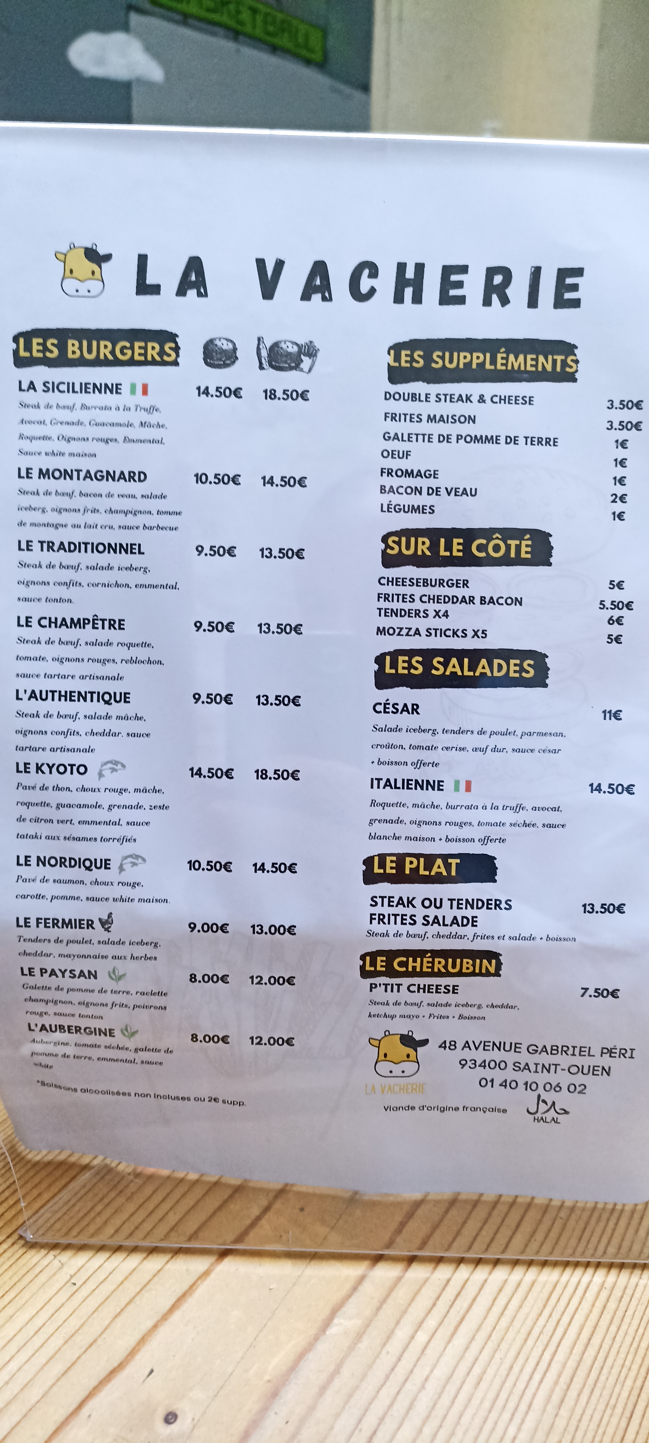 Vacherie, porte bien son nom car issue de la vache, Hamburgers généreux, un menu au top. Réception agréable, service rapide Une bonne adresse à St Ouen