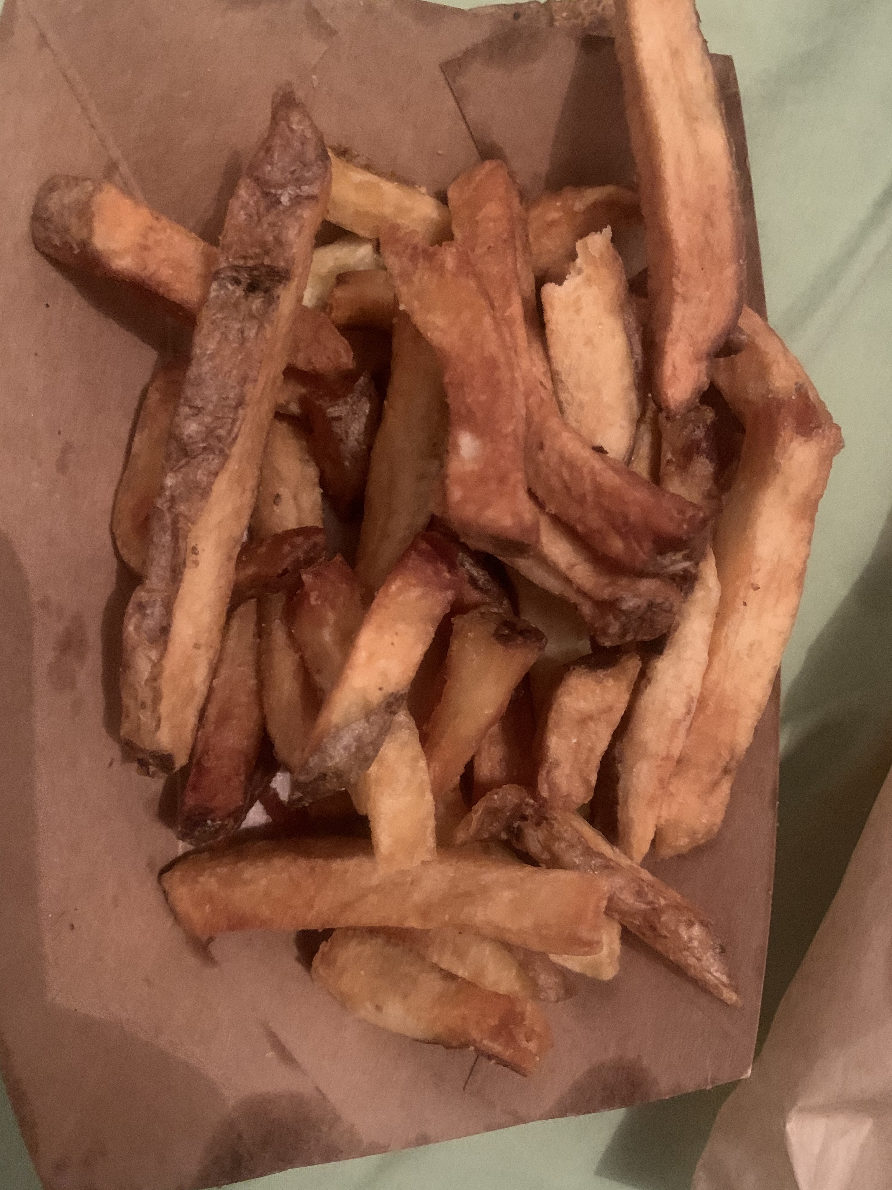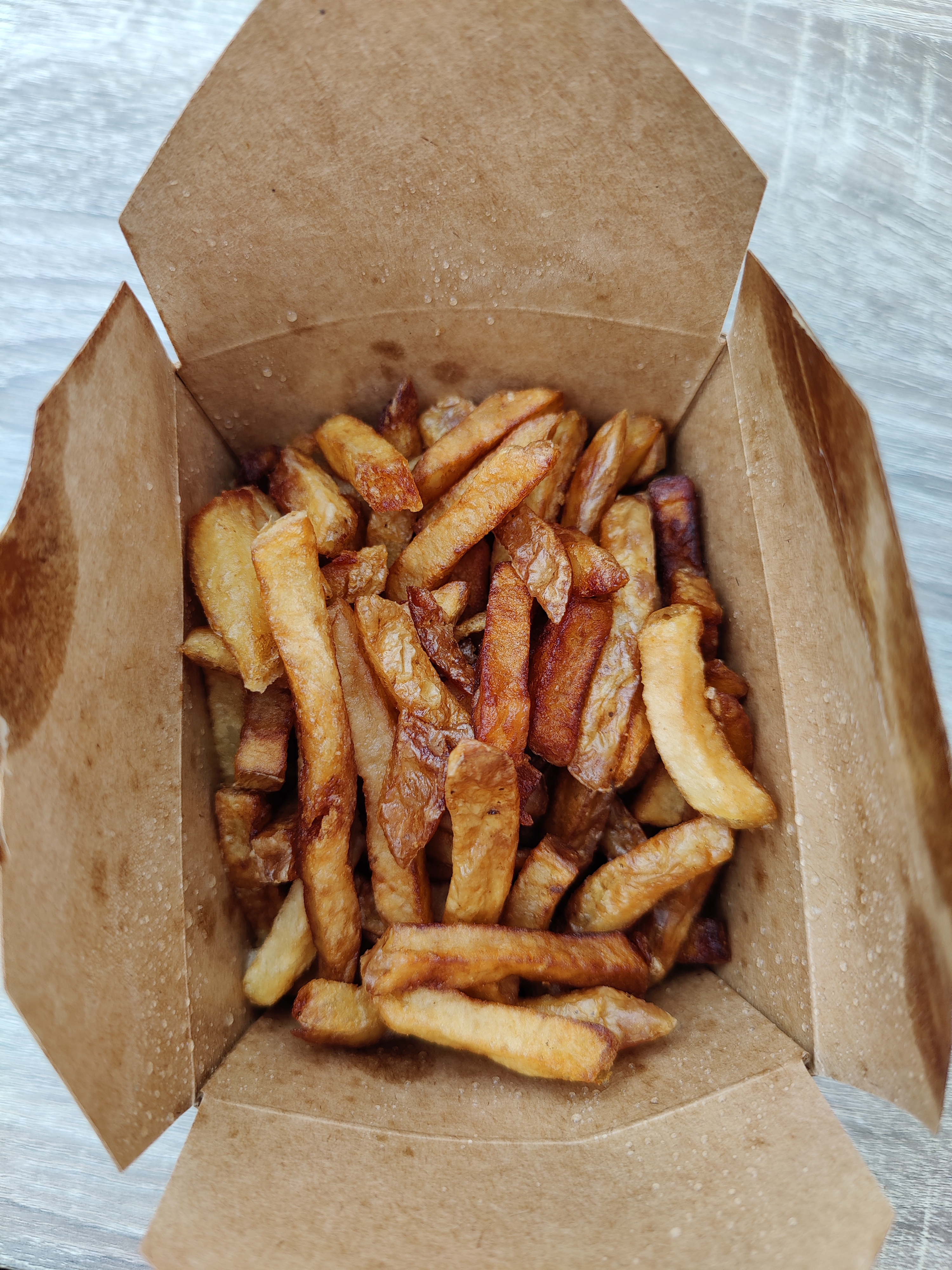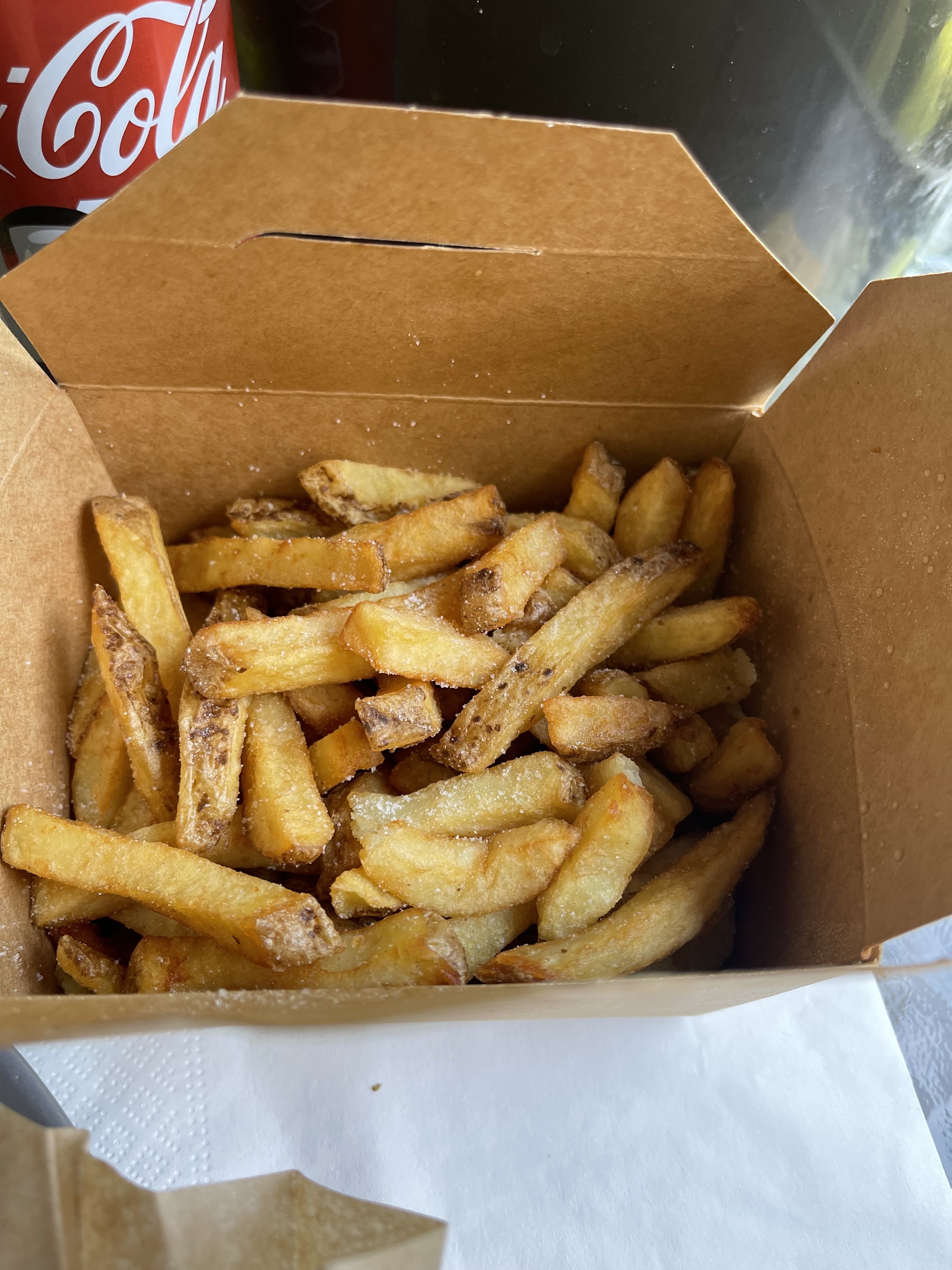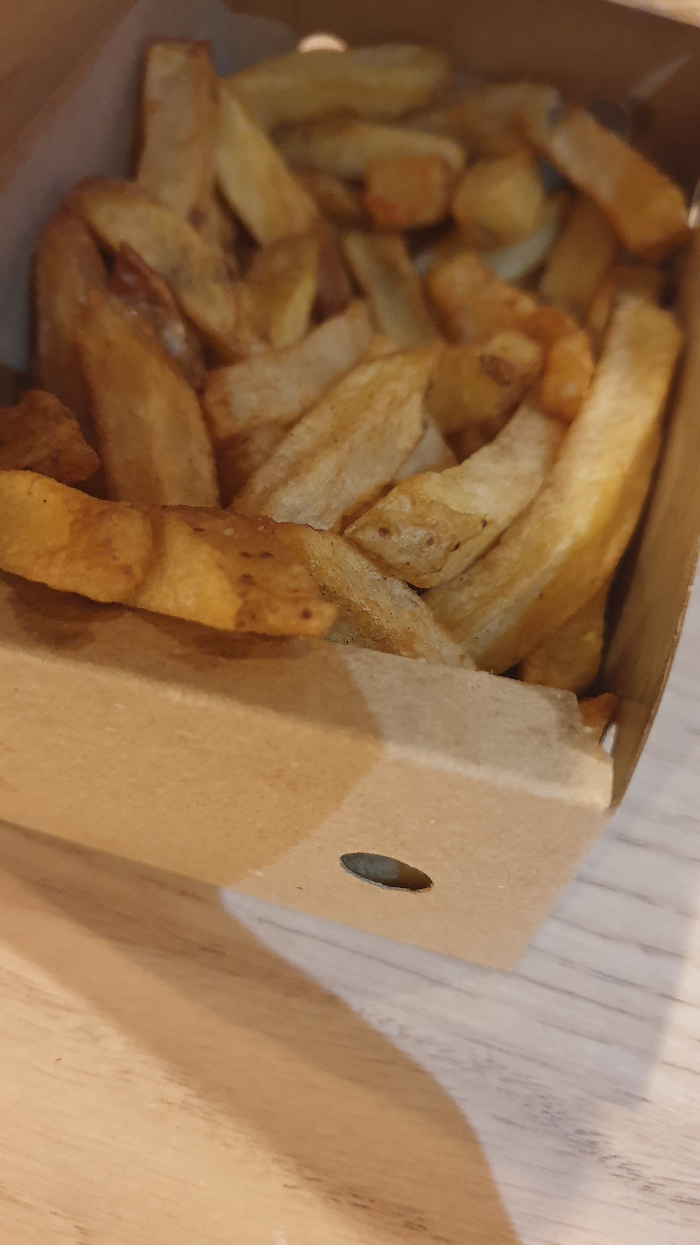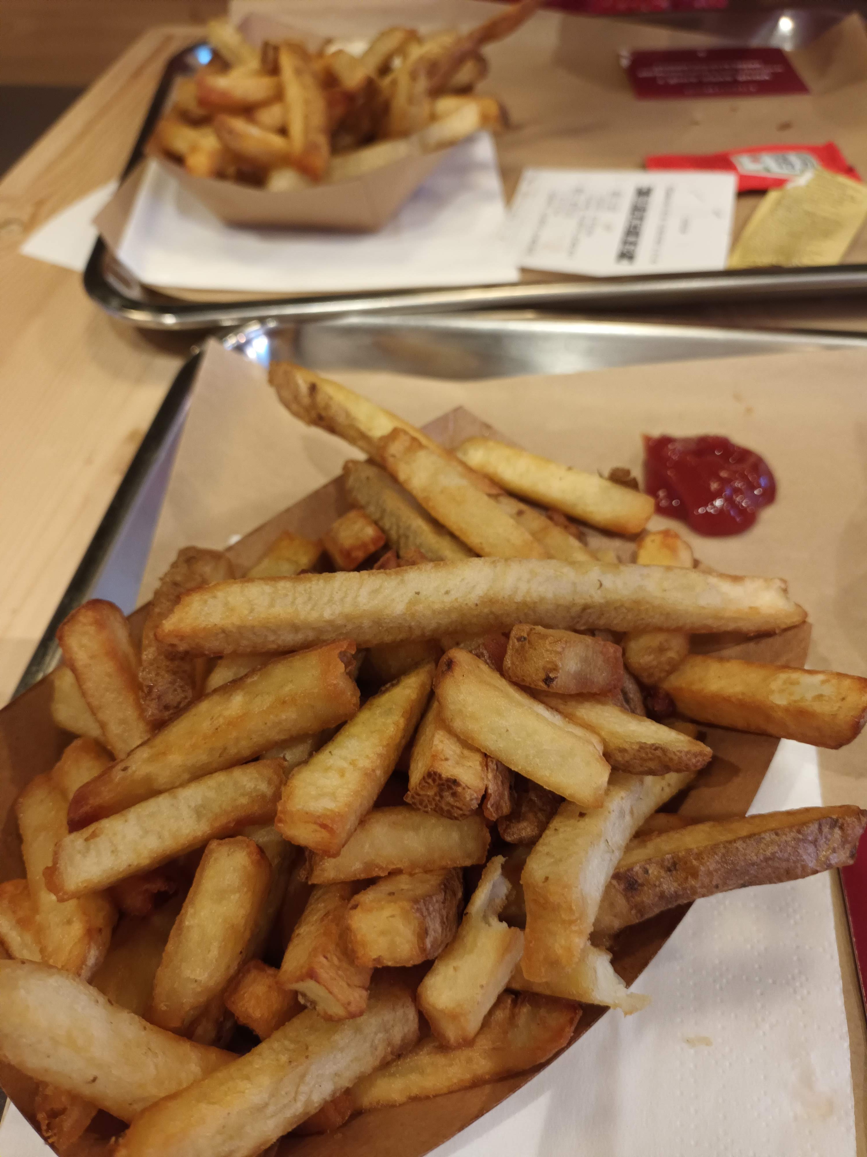 Les frites maison sont bonnes. En revanche le steak du burger n'est vraiment pas bien cuit et très sec.