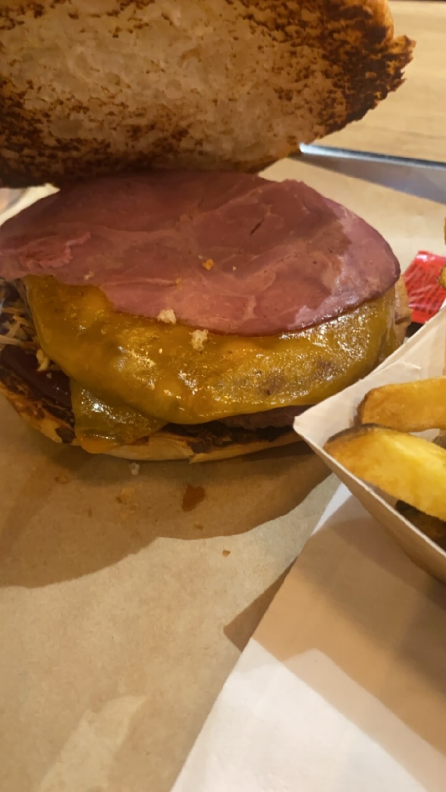Désastreux! Un pain sec comme le sahel et une viande mais duuuure comme un pneu plein. Par ailleurs, oignons soit disant caramelisés sont poivrés a cracher du feu mais en aucun cas caramelisés. Point fort la canette de sprite bien fraîche. Commandé via ubert eats, une fois pas deux.