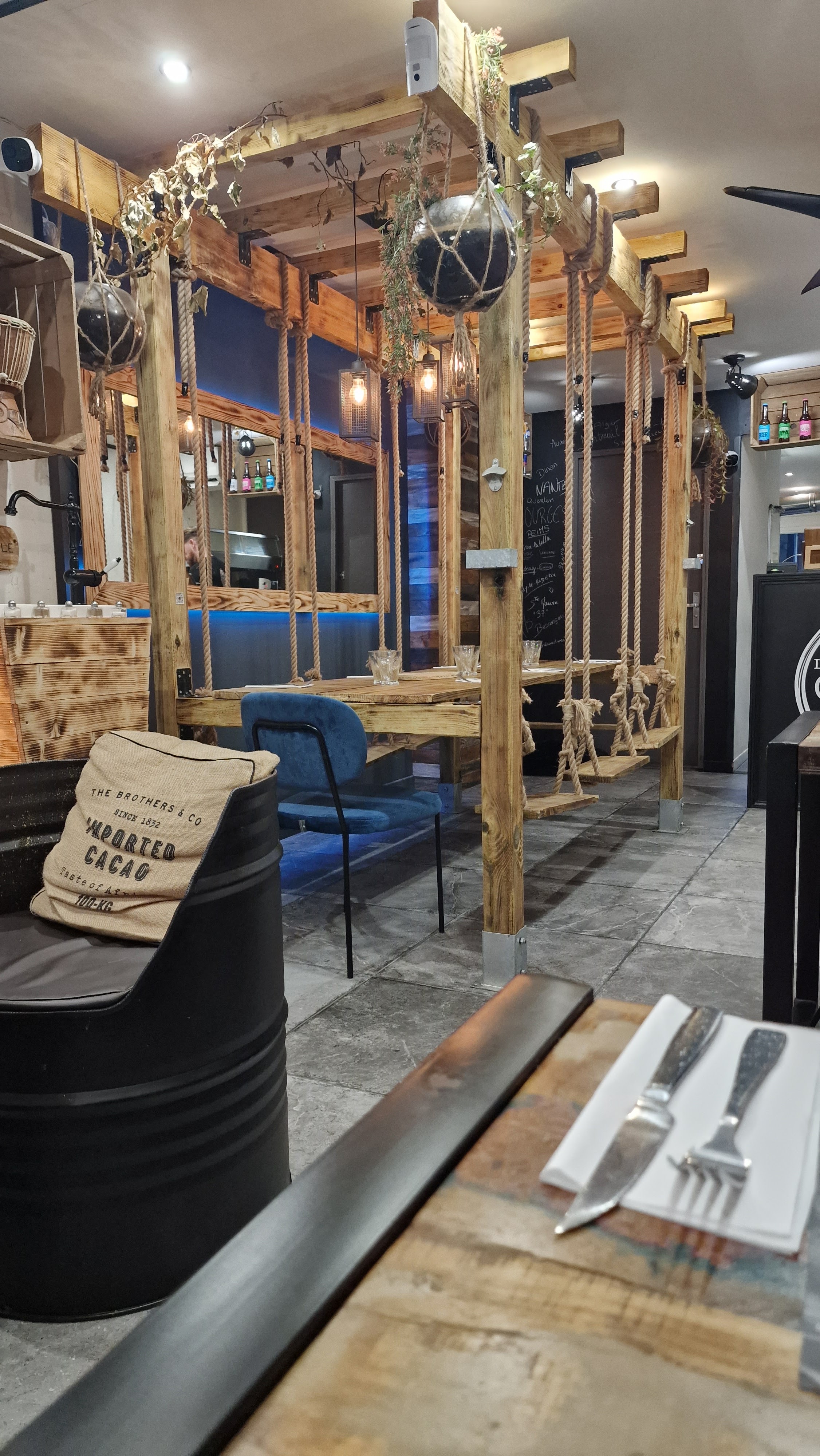 Lieu très coll et décontracté. Accueil tel ok. Reservatiln que pour plus de 6 personnes. Très sympa les balançoires.offre burger enfin du véritable burger....un super choix et une vrai originalité.....pour ma part c'était bonifacio hier ,entrecôte et Lyon....on s'est régalé un grand merci enfin un resto digne de ce nom