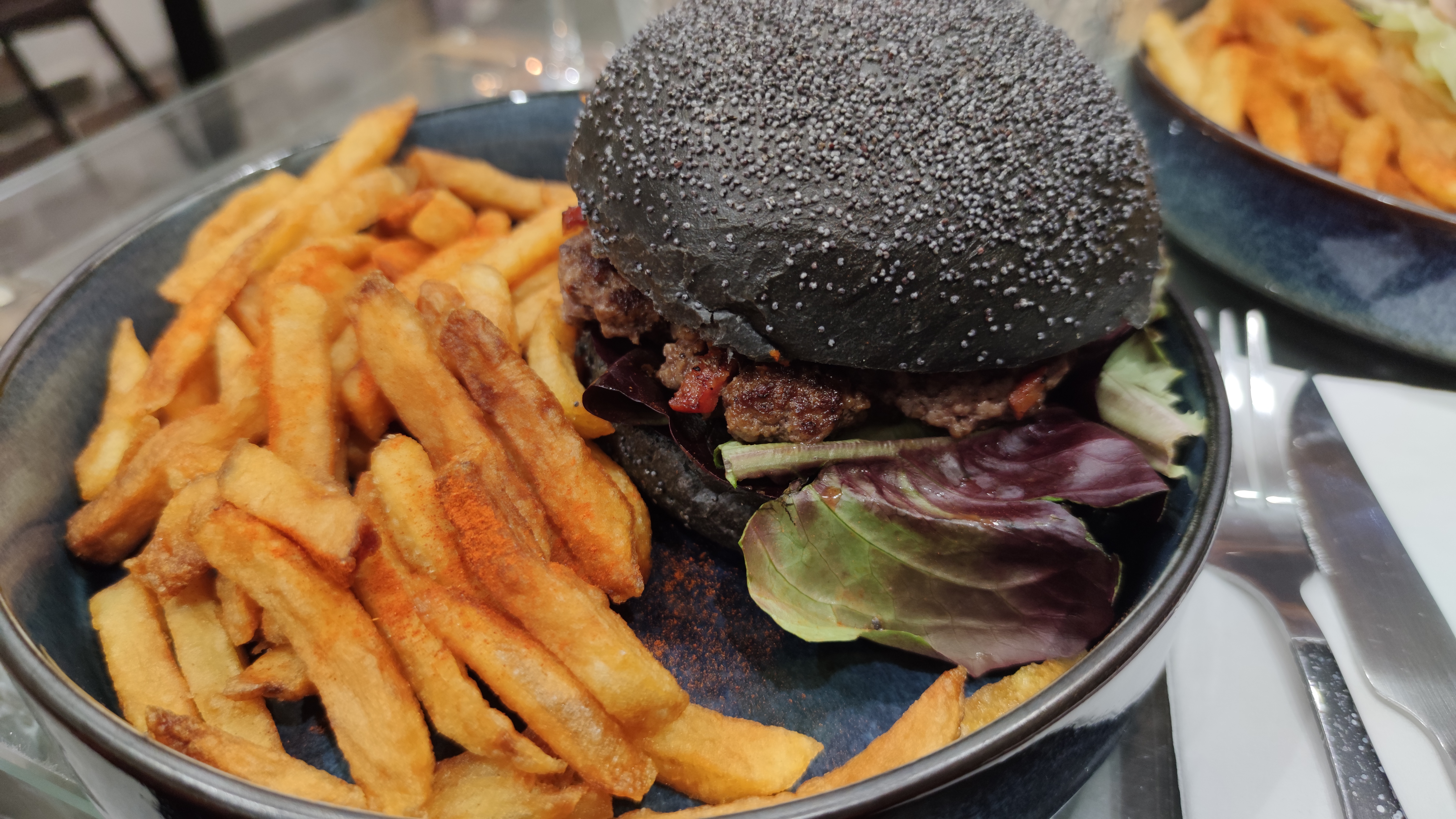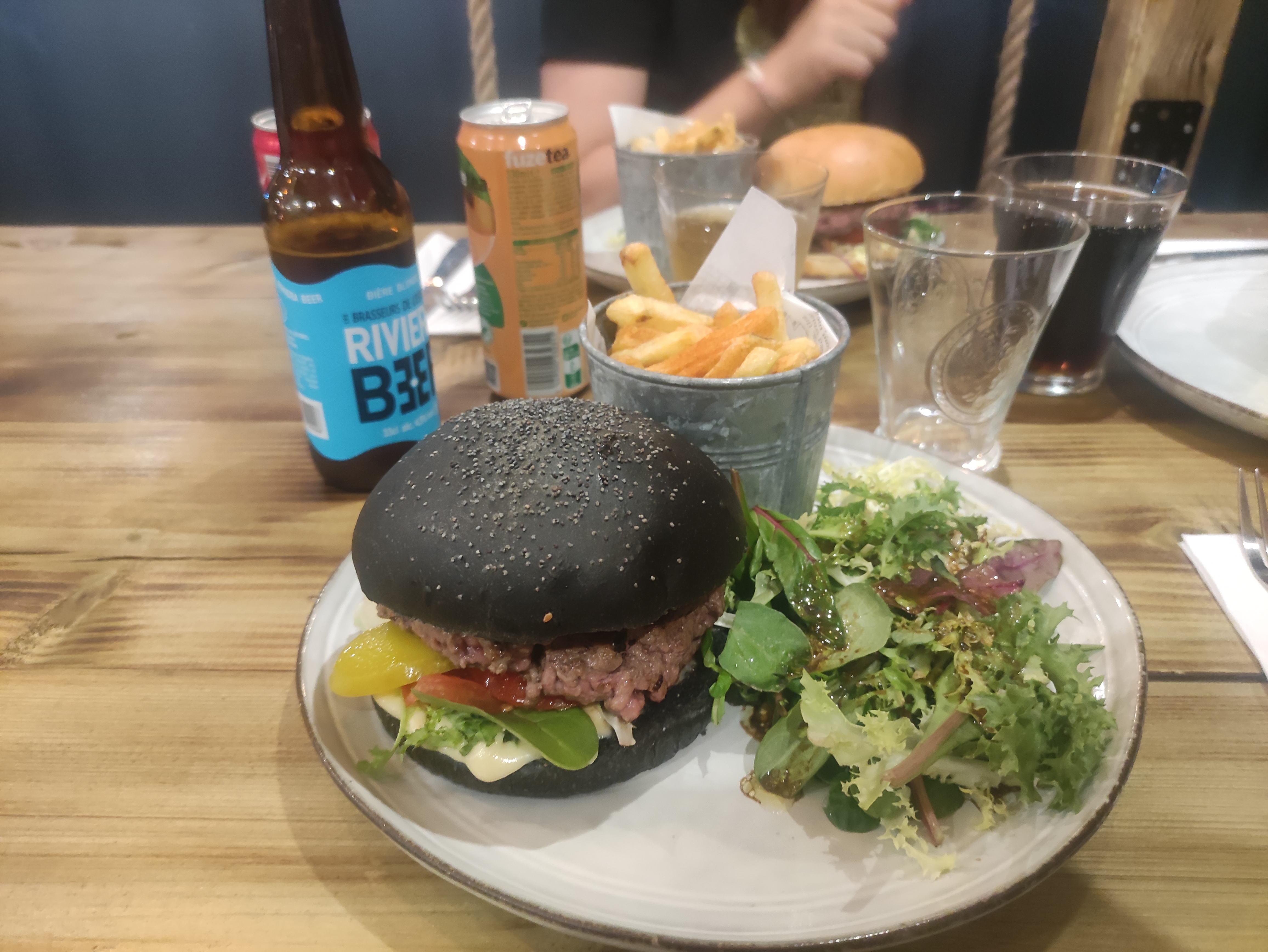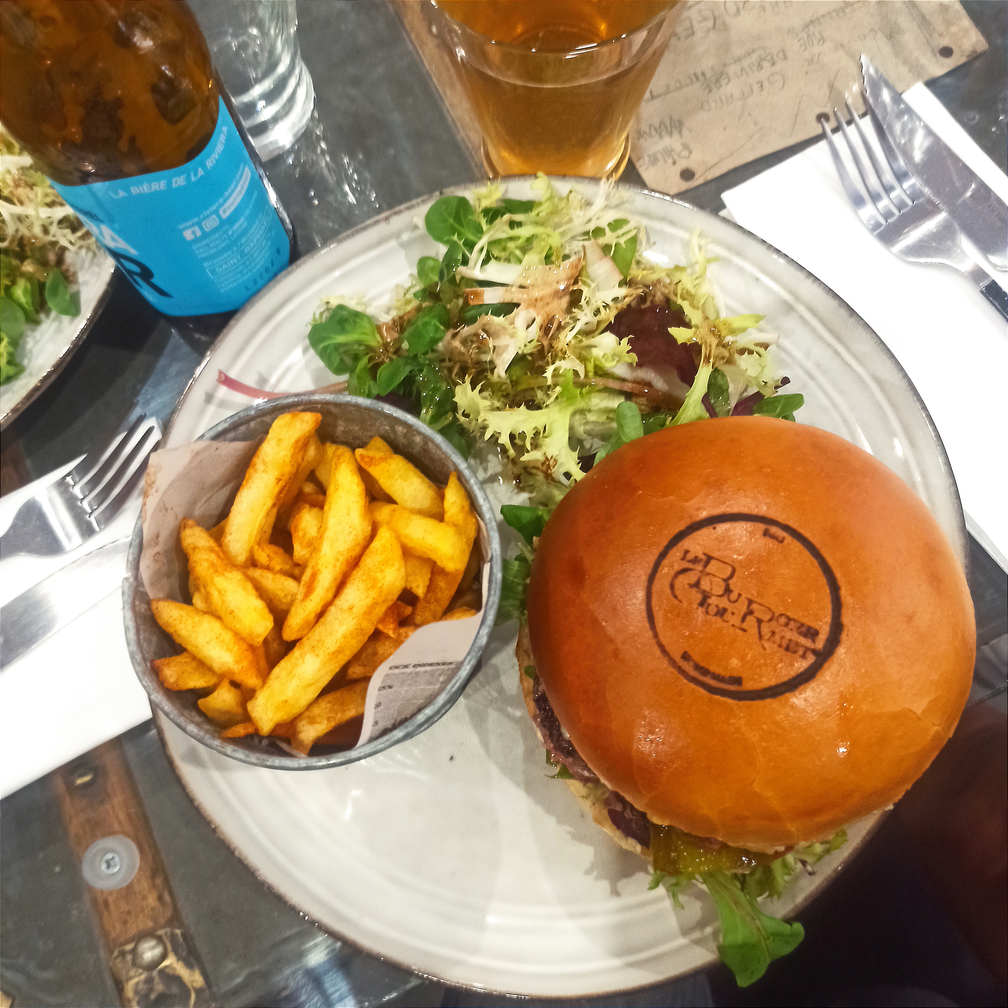 Je me suis simplement régalé. L’association des saveurs dans le burger est parfaite, aucunes ne prend le dessus sur l’autre. Dans une bouchée, vous arrivez à distinguer à la fois le goût de la viande, du pain, de la sauce au bleu d’Auvergne, du bacon, etc… Ah oui, cela peut sembler tout bête, mais si vous commander une viande saignante, elle arrive saignante et pas bleue ou trop cuite comme c’est souvent le cas dans d’autres restaurants. Les frites sont top, croustillantes et moelleuses à l’intérieur. Le paprika fumé saupoudré dessus rajoute une petite saveur très agréable. La déco et l’accueil contribue à passer un excellent moment. Mention spéciale pour les balançoires.